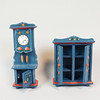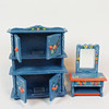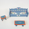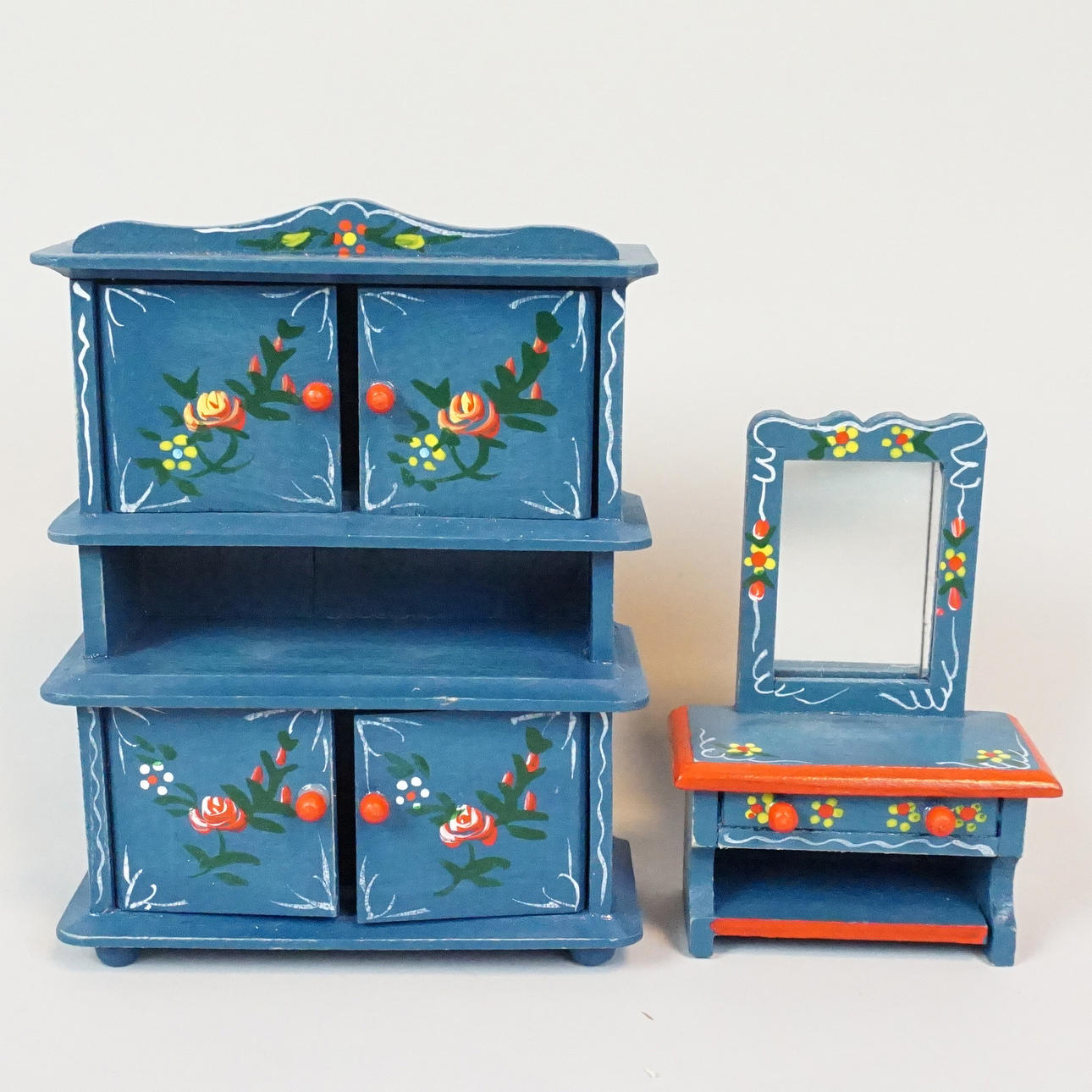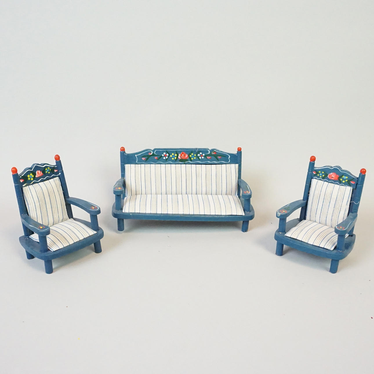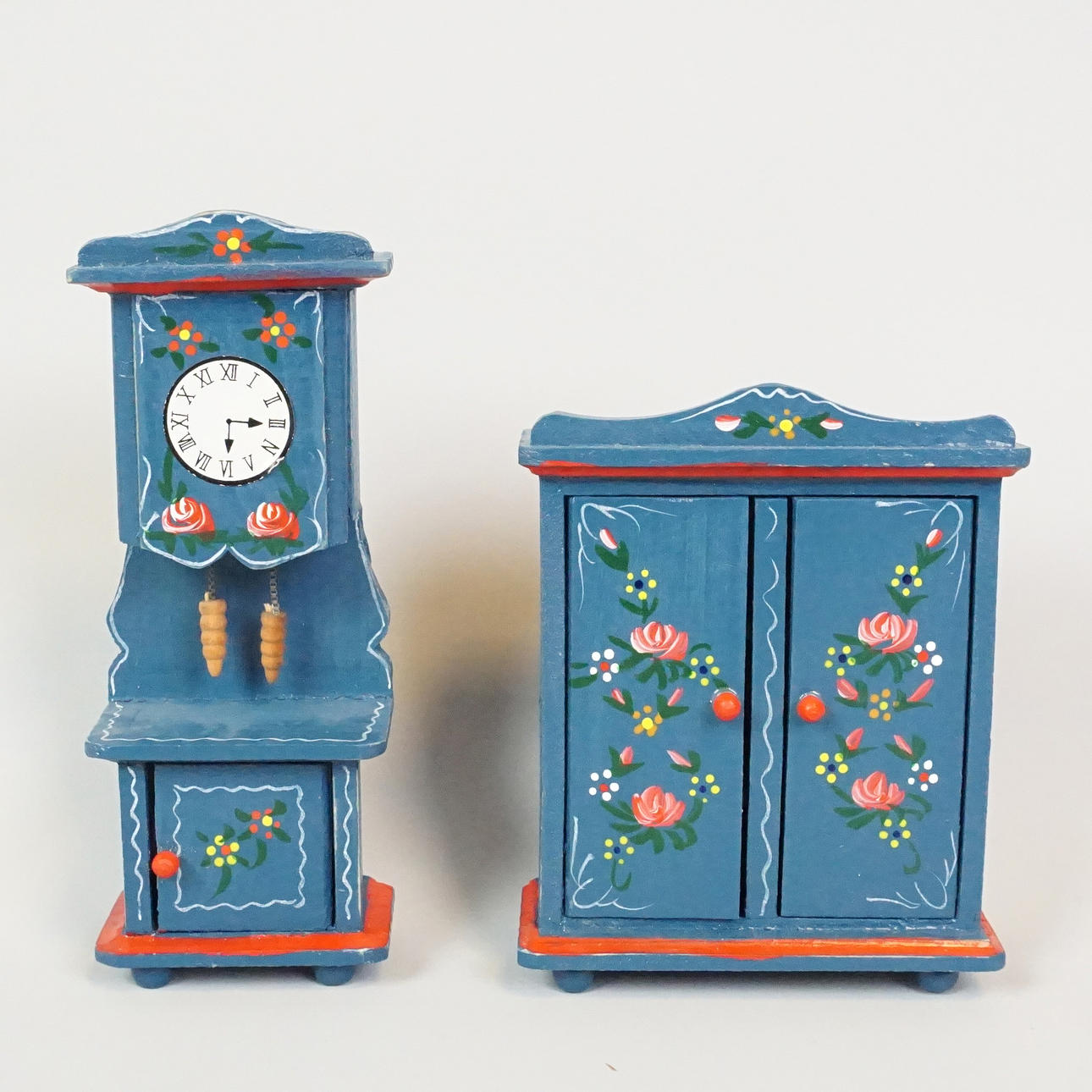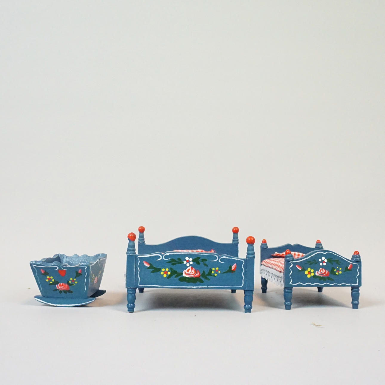 Dockmöbler, bemålat trä med dekor av blommor. Soffor, sängar, vagga, skåp, golvur, bord, spegelbyrå.