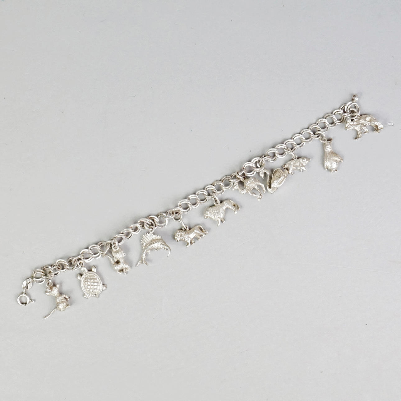 Länk med 11 st berlocker i form av djur. Längd ca 19 cm. Märkt 925. Vikt 28 gr.