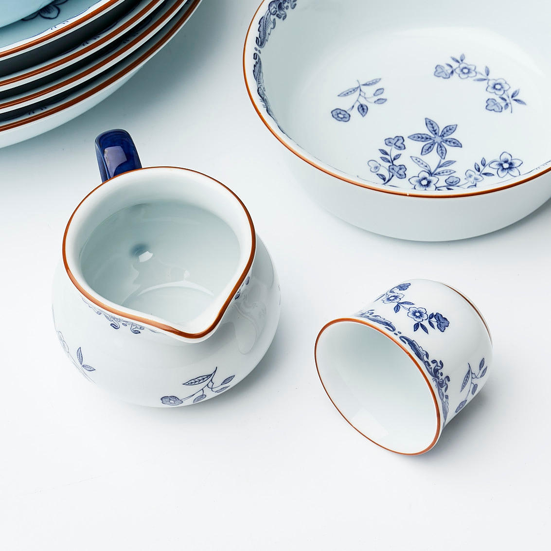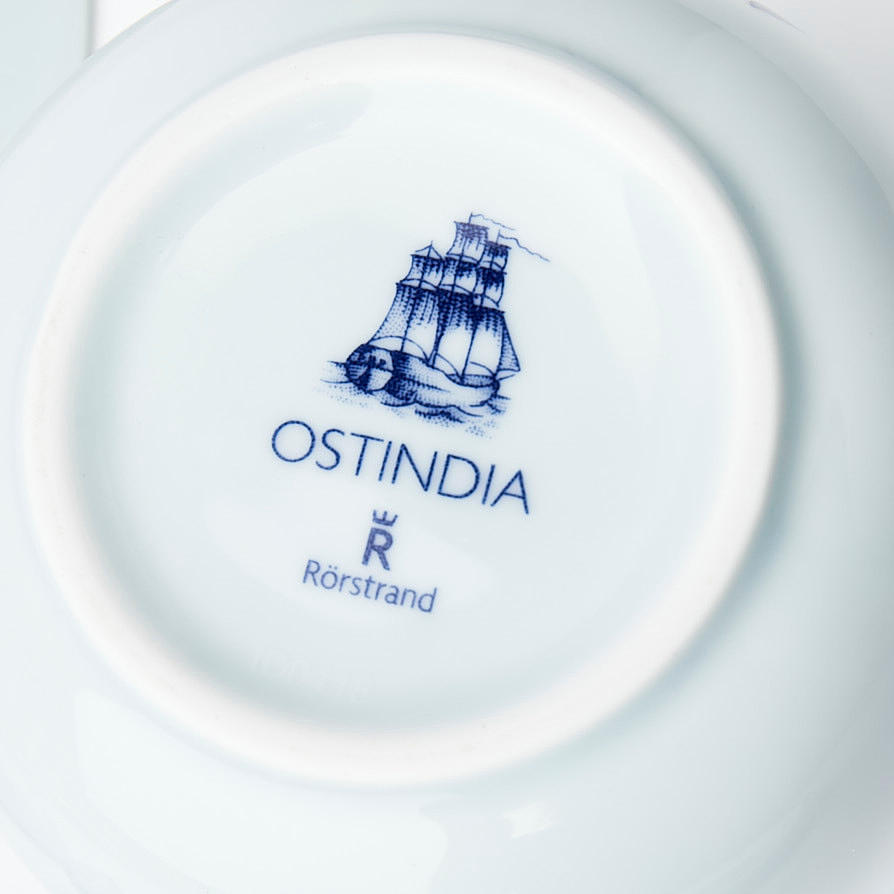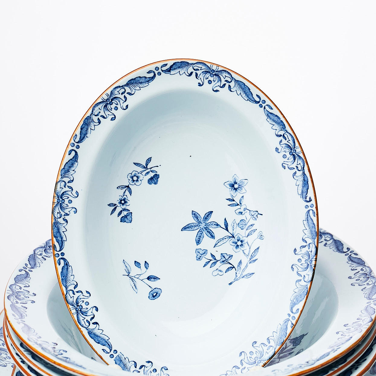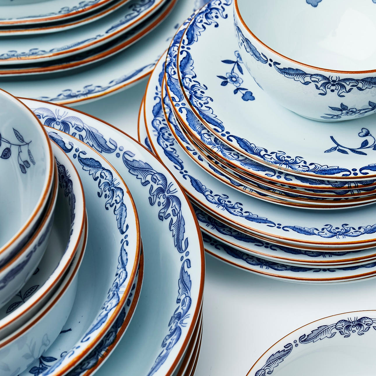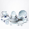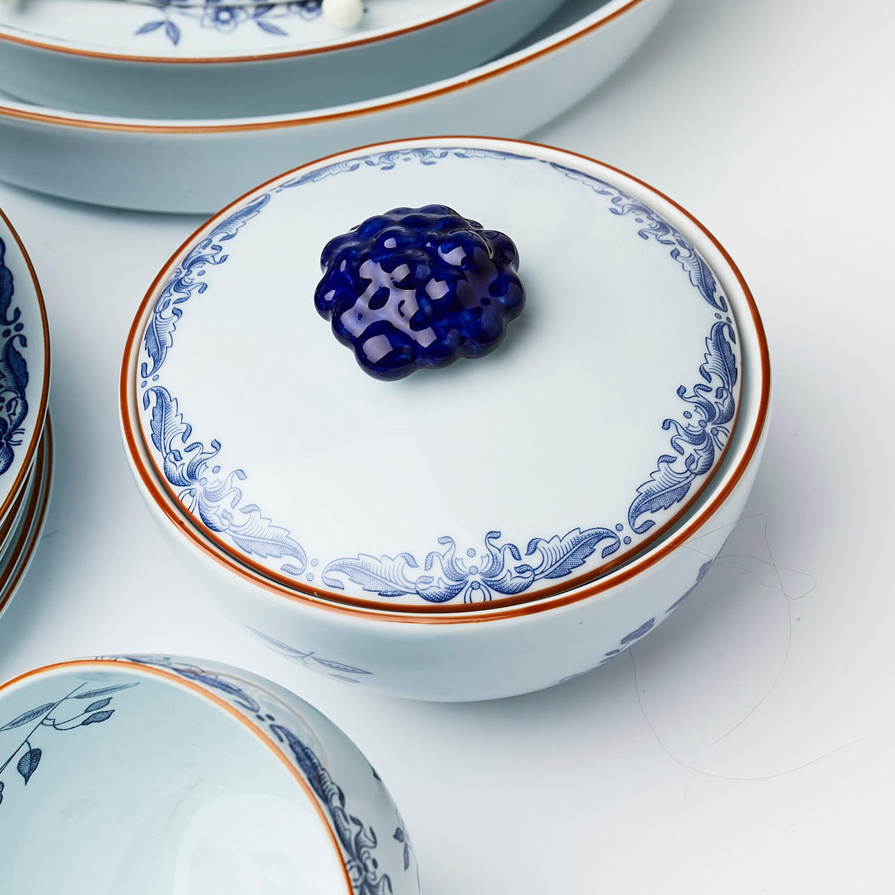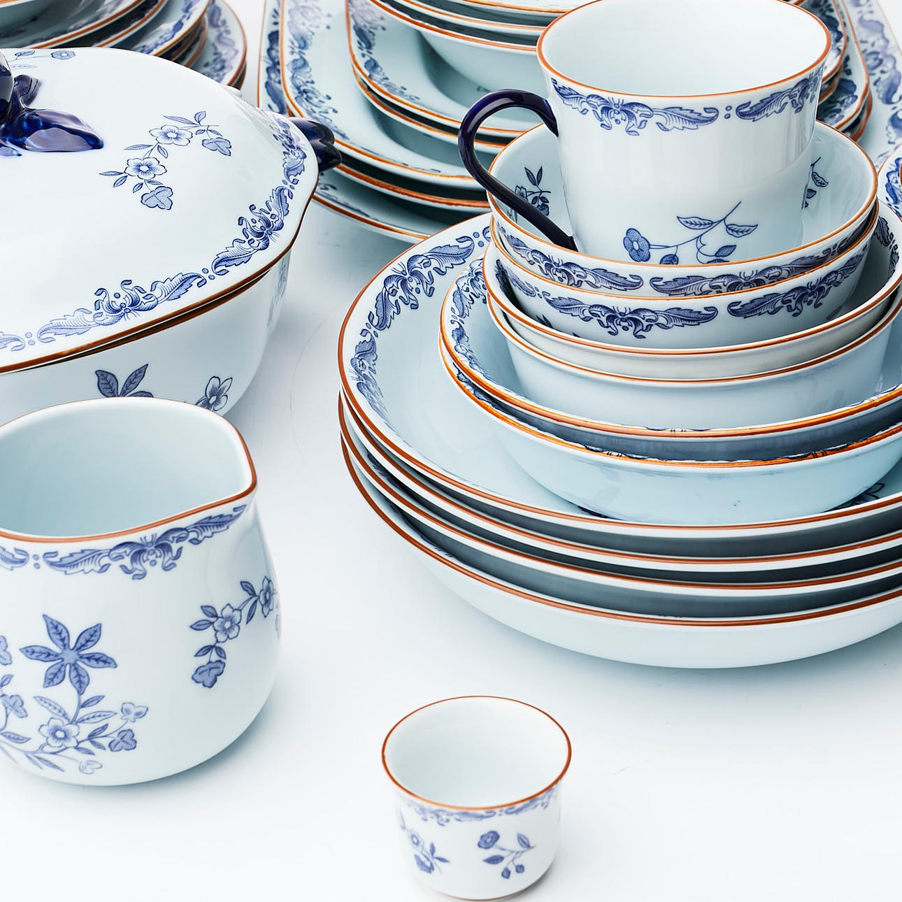 10 mattallrikar (23,5 cm), 12 förrättstallrikar (21 cm), 11 djupa tallrikar (20,5 cm), 12 assietter (17 cm), 6 skålar (14,5 cm), 4 skålar rund kant (12 cm), 4 skålar rak kant (13 cm), 2 såsskålar (höjd 9 cm), 5 ovala uppläggningsfat olika storlekar, 4 ovala uppläggningsskålar olika storlekar, 4 djupa tallrikar (22,5 cm), 2 skålar (17 cm), 1 terrin med lock (29 cm), 1 salladsskål (25,5 cm), 2 ugnsformar (28, 23,5 cm), 2 äggkoppar, 1 gräddkanna, 1 mjölkkanna, 1 sockerskål med lock, 1 tillbringare, 6 kaffemuggar, 12 kaffekoppar med fat, + 1 kaffekopp, 2 tekoppar.