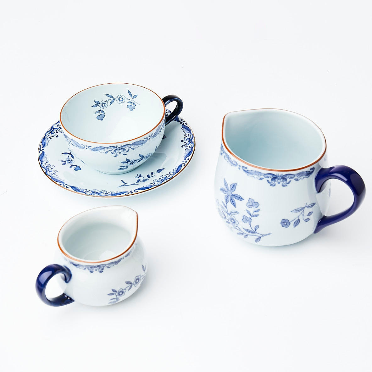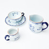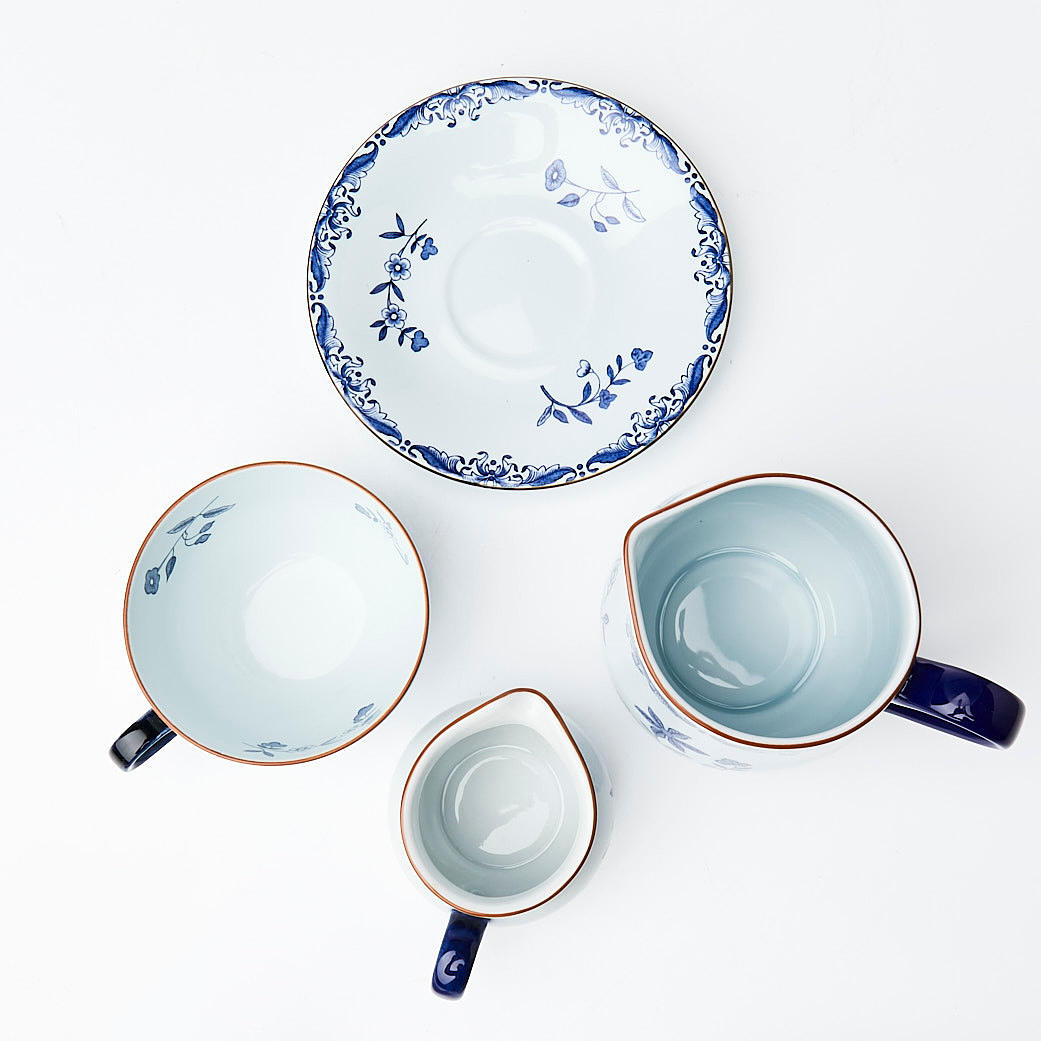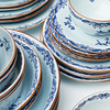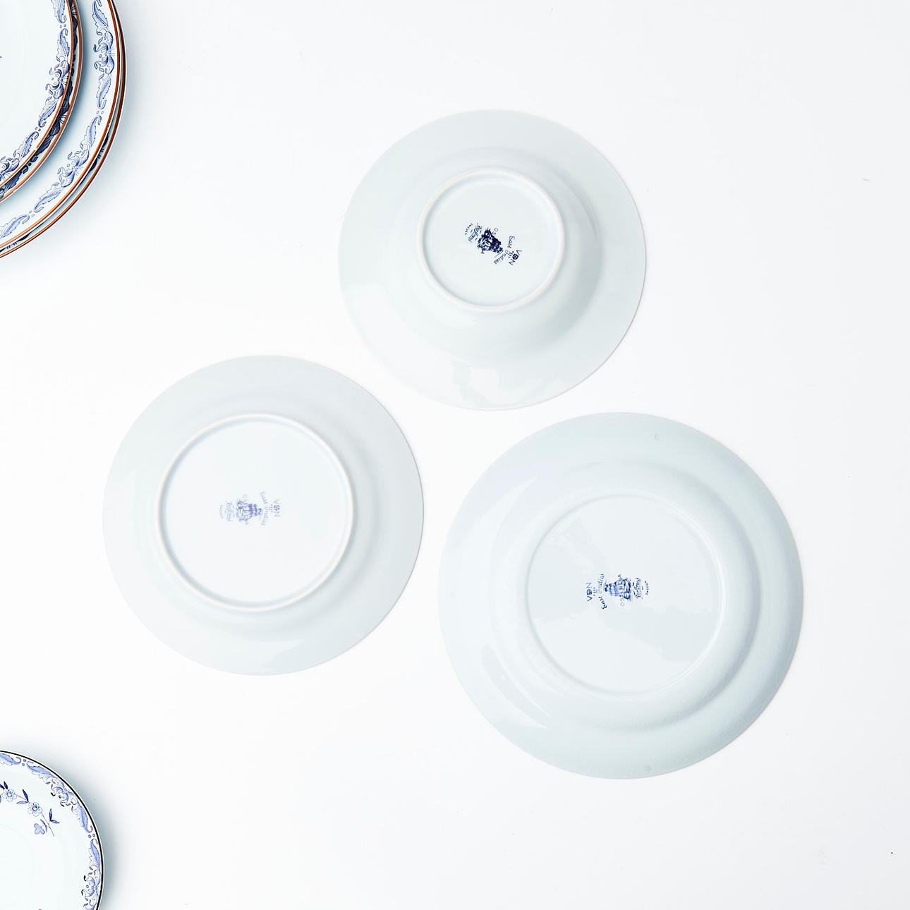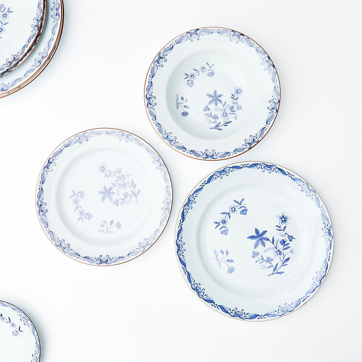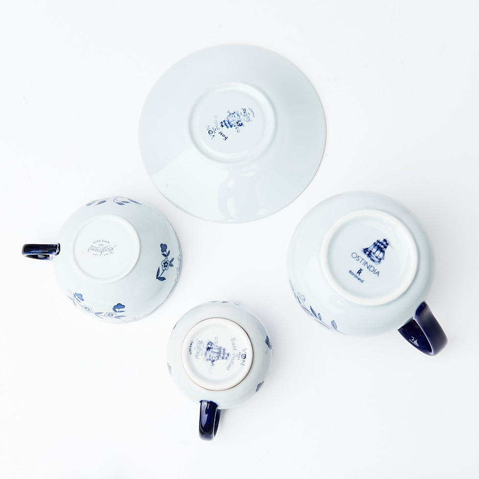 10 mattallrikar (23,5 cm), 12 förrättstallrikar (21 cm), 11 djupa tallrikar (20,5 cm), 12 assietter (17 cm), 6 skålar (14,5 cm), 4 skålar rund kant (12 cm), 4 skålar rak kant (13 cm), 2 såsskålar (höjd 9 cm), 5 ovala uppläggningsfat olika storlekar, 4 ovala uppläggningsskålar olika storlekar, 4 djupa tallrikar (22,5 cm), 2 skålar (17 cm), 1 terrin med lock (29 cm), 1 salladsskål (25,5 cm), 2 ugnsformar (28, 23,5 cm), 2 äggkoppar, 1 gräddkanna, 1 mjölkkanna, 1 sockerskål med lock, 1 tillbringare, 6 kaffemuggar, 12 kaffekoppar med fat, + 1 kaffekopp, 2 tekoppar.