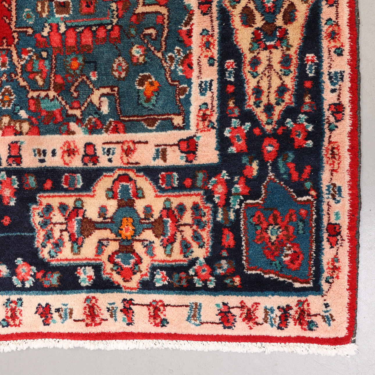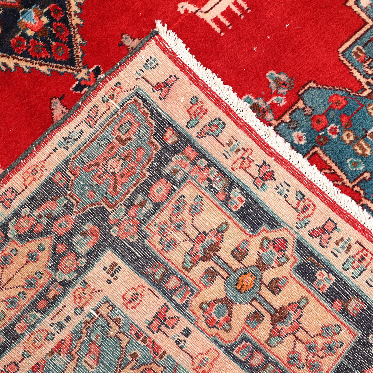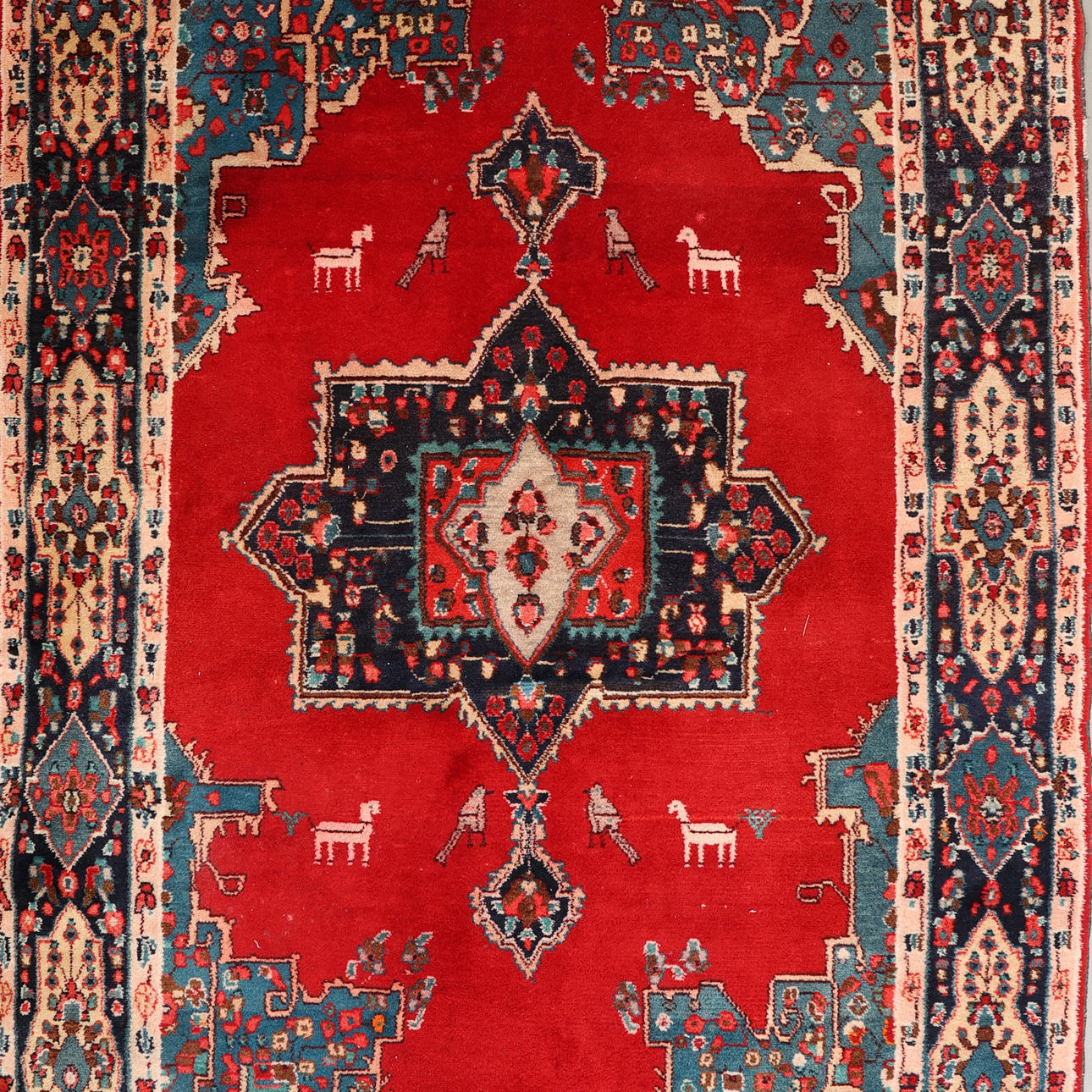 Handknuten, persisk matta, ull på bomullsvarp, medaljongmönster på röd botten.