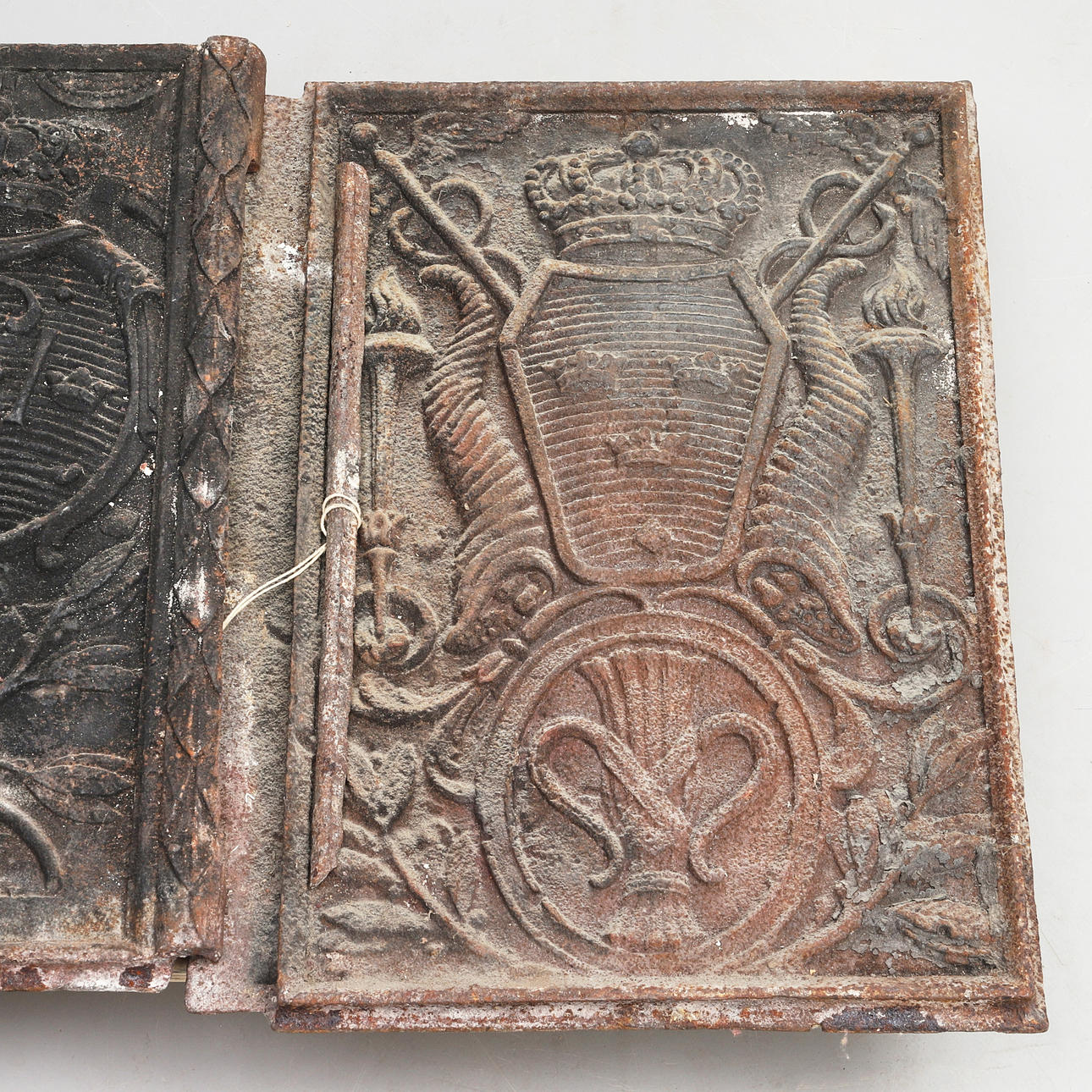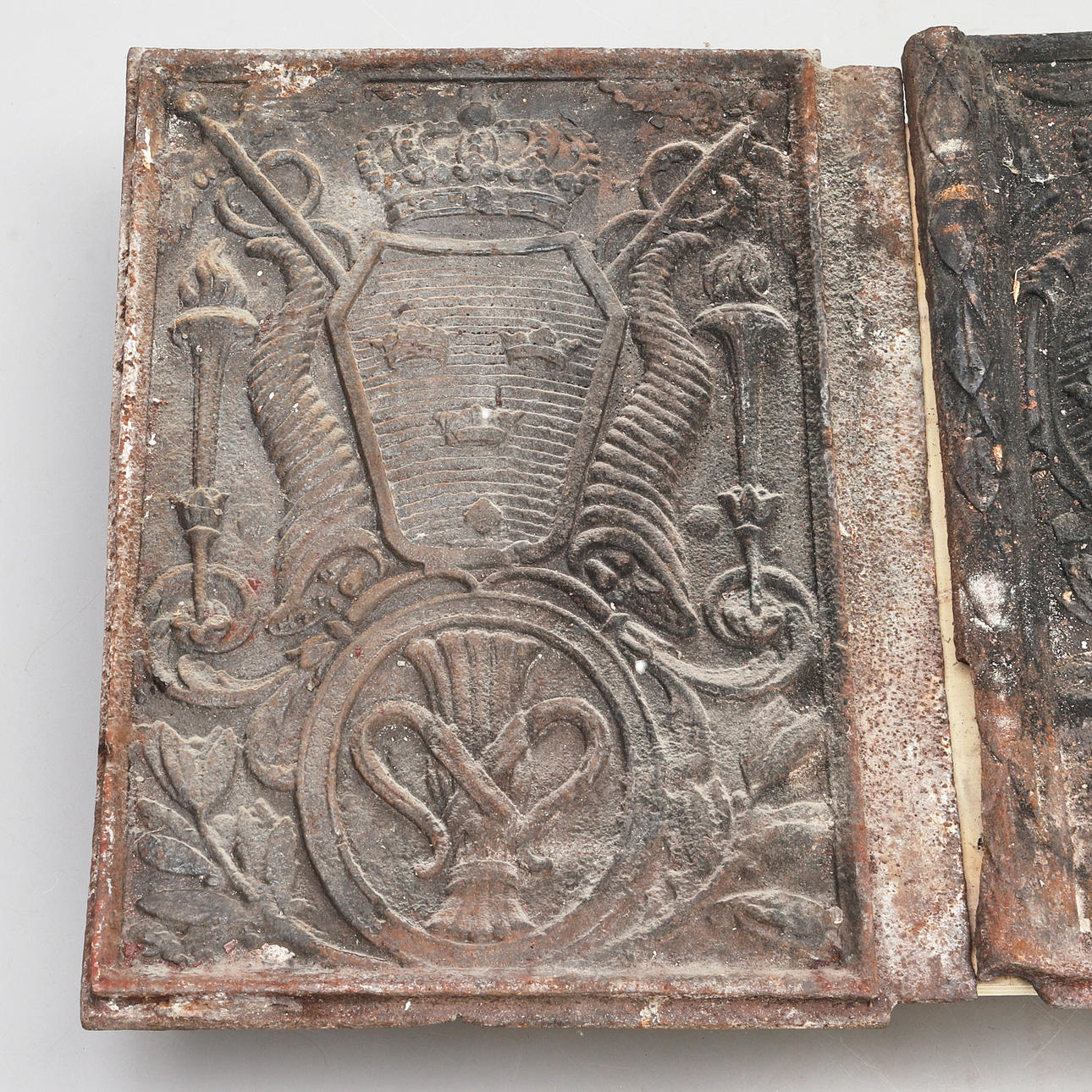 1 par med riksvapnet samt vasakärve, ca 68x50cm vardera Ohs bruk: Carl XIV, ca 67x35cm.
