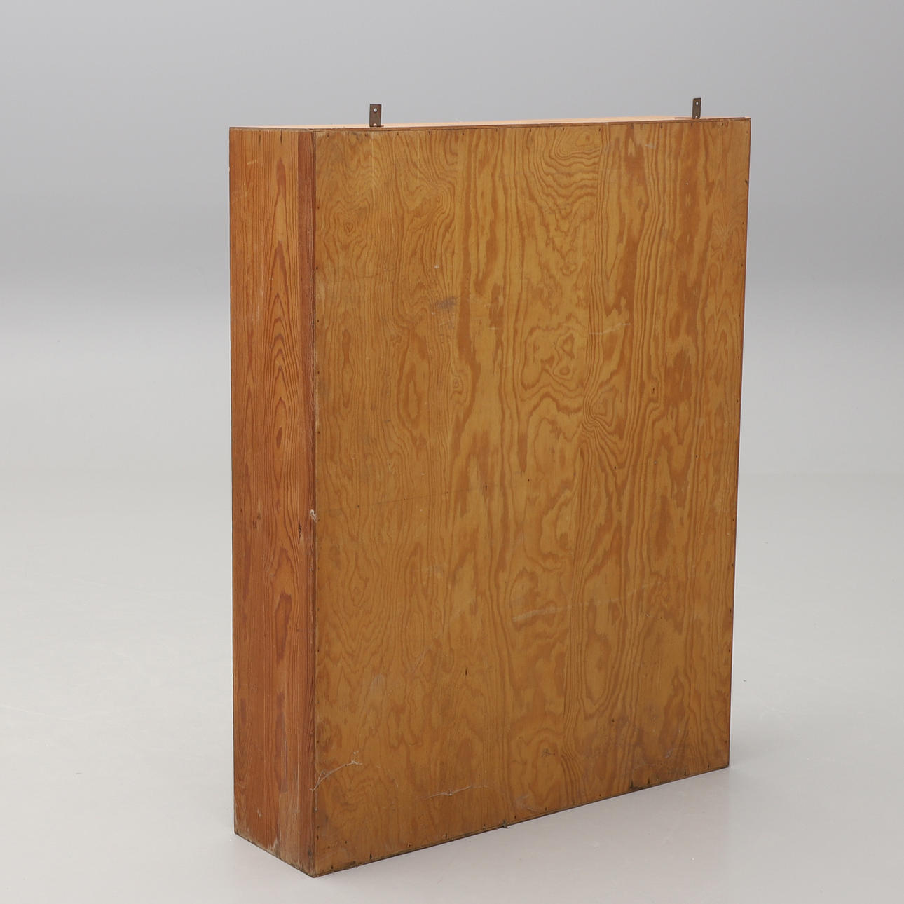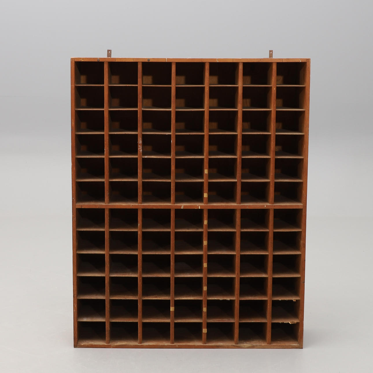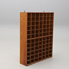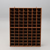 Furu och furuplywood. Rektangulär form med 84 små fack. Bredd 93, djup 23, höjd 117 cm.