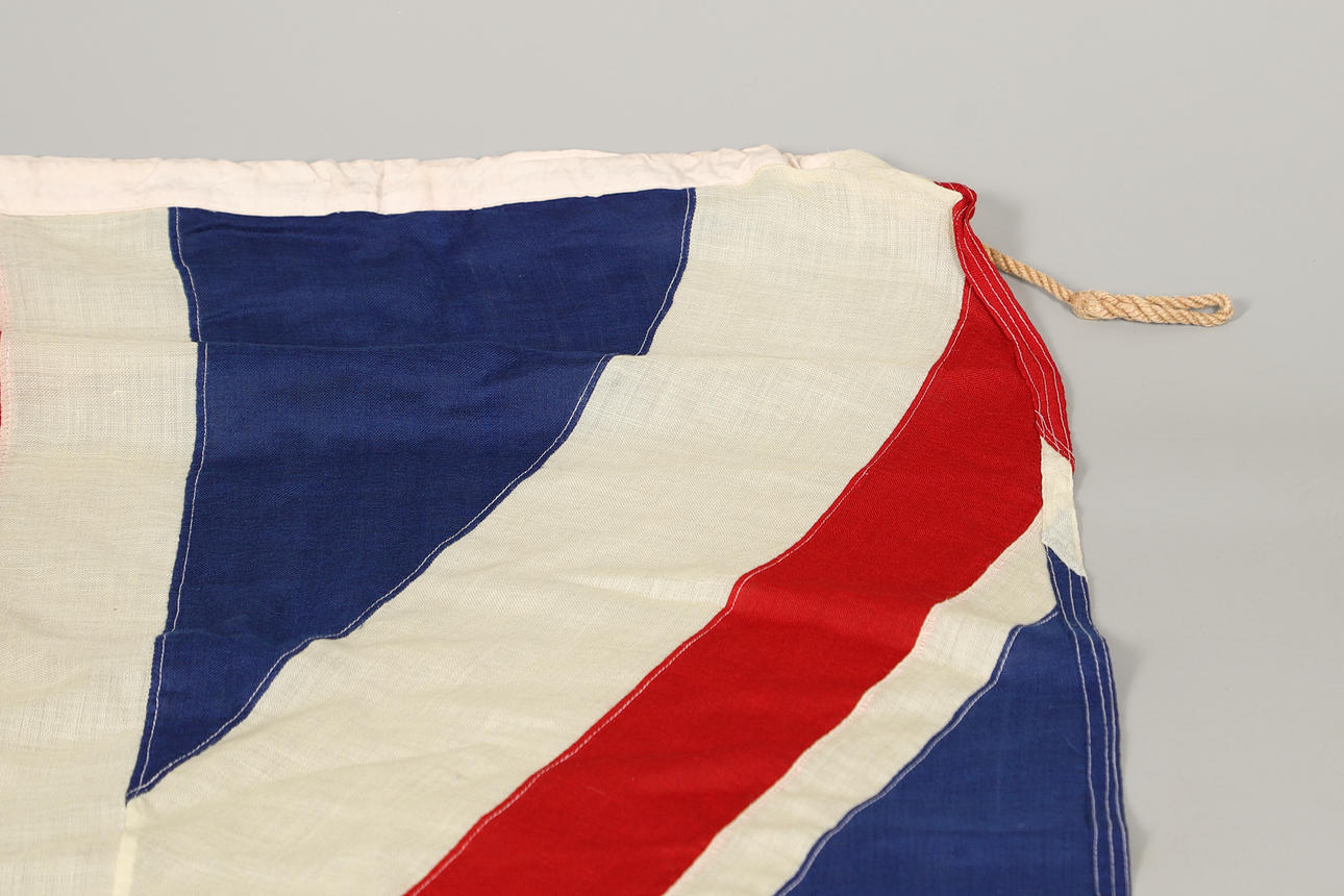 En Union Jack eller flagga av sydd konstruktion med växel och slinga för flygning. 128 cm x 257cm (ca 4 ”2 ”x 8" 5").