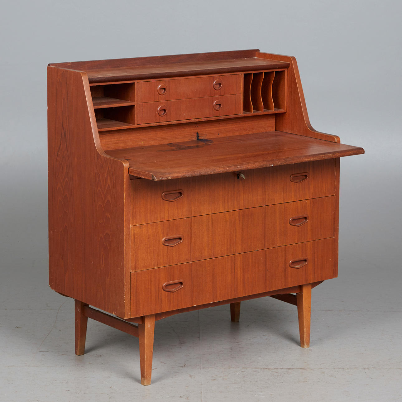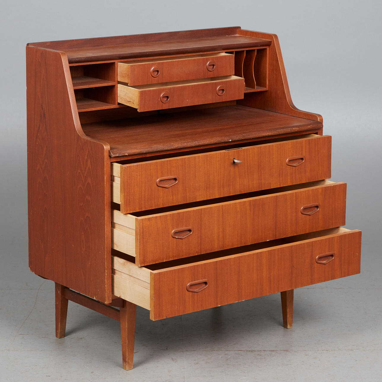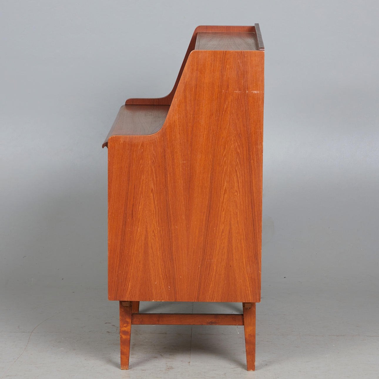 KÖKSSKÅP, teak, 1960-tal. Glaserad teakbyrå med fyra koniska, stagade ben och tre lådor, utrustad med ett fäste med sex fack och två lådor, H.100cm, L.89cm, W.47cm.