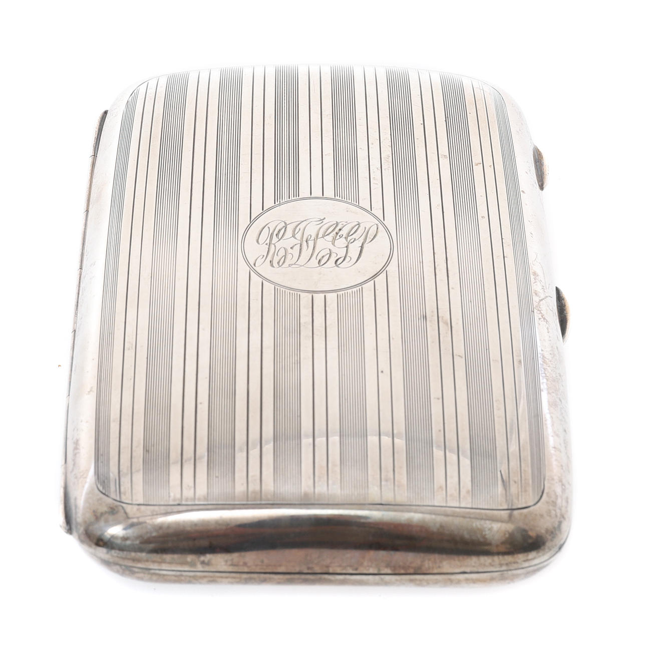 Birmingham 1918, böjd för att passa fickan, gångjärnslocket centrerat av en cirkulär cartouche graverad med en modern monogram, förgylld fodrad, 14cm x 9cm, 226.4g, 7.28ozs.