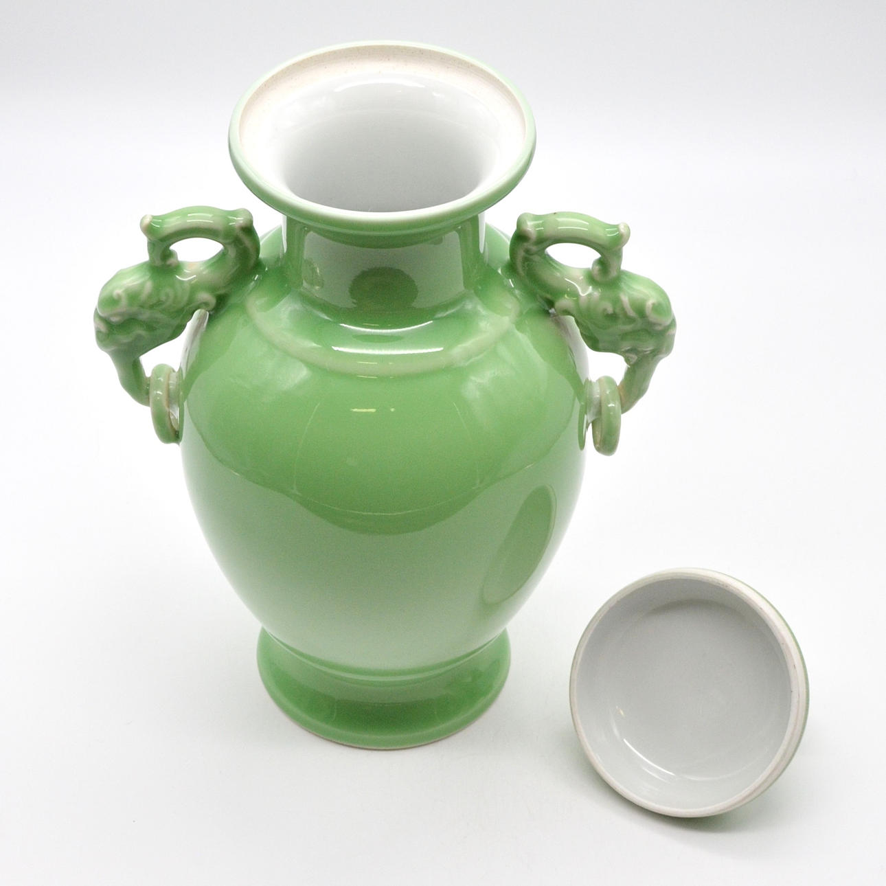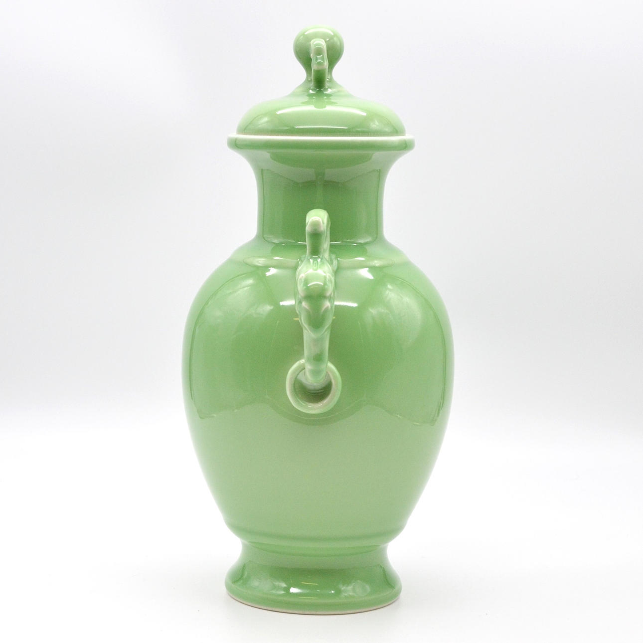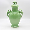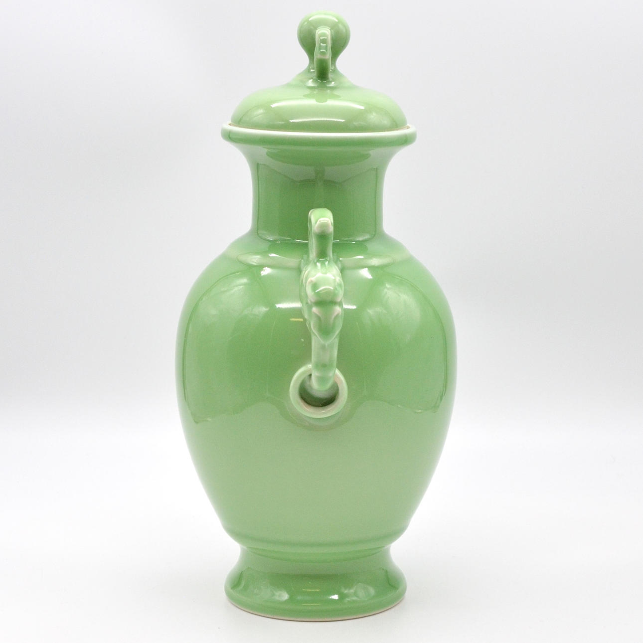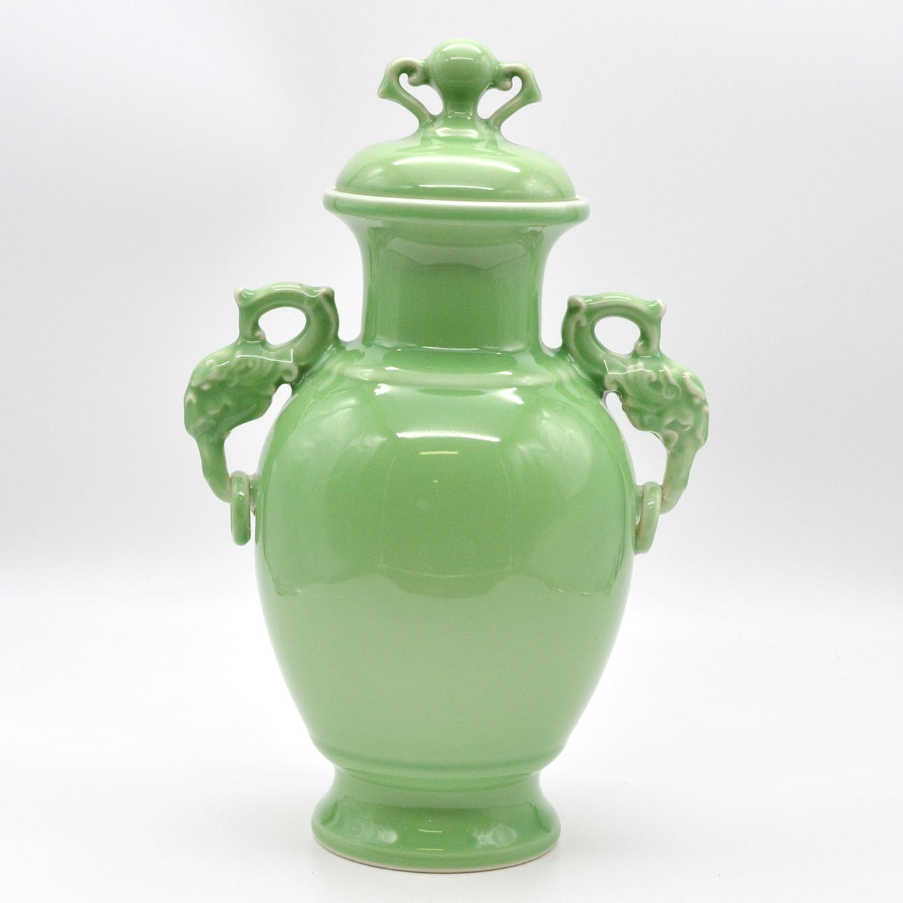 Celadon grön vas med lock, dekorativa handtag i form av drakhuvuden på båda sidor. VACKER 1900-talsexemplar med golvstämpel från Qianlong.