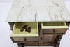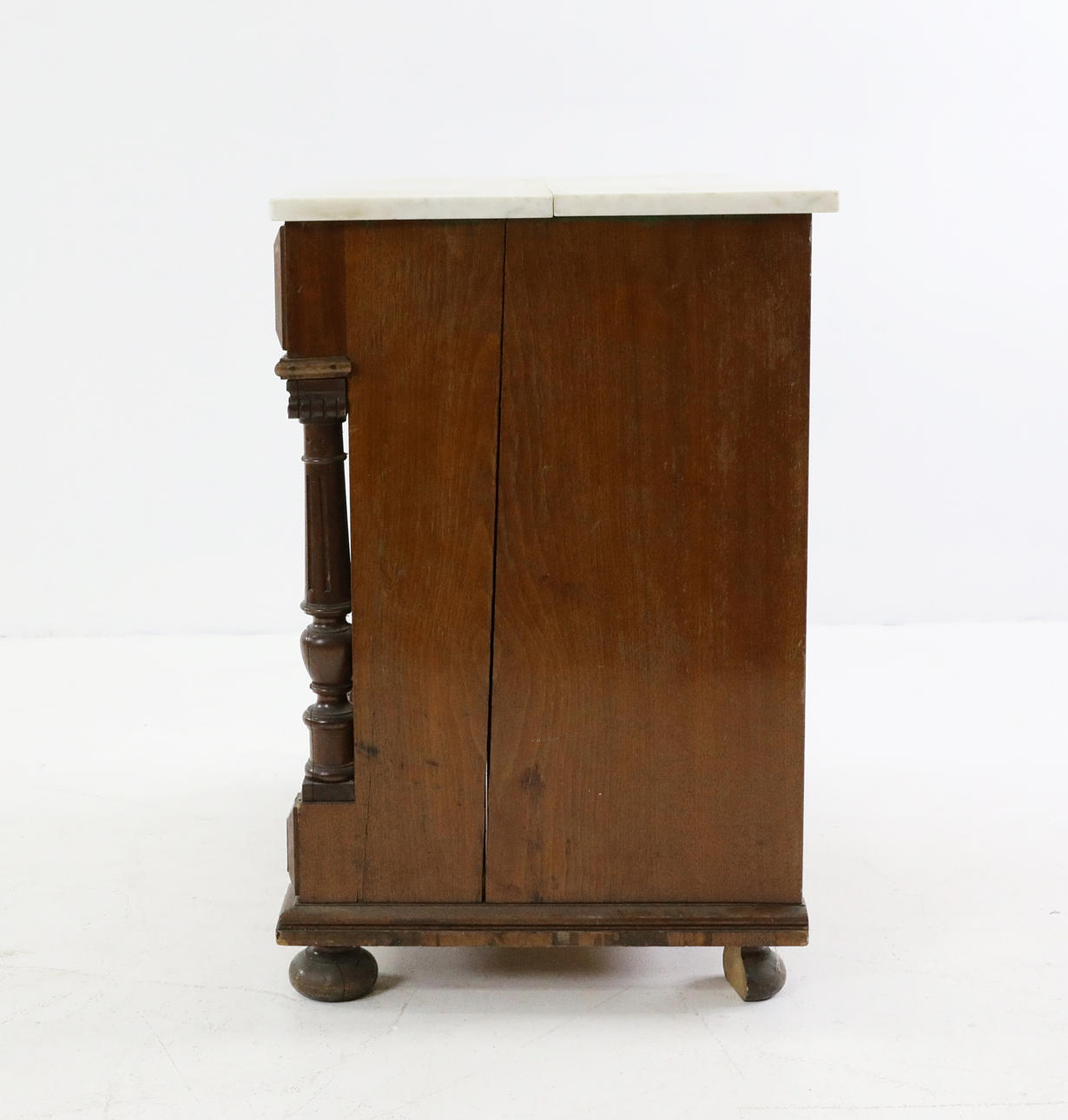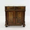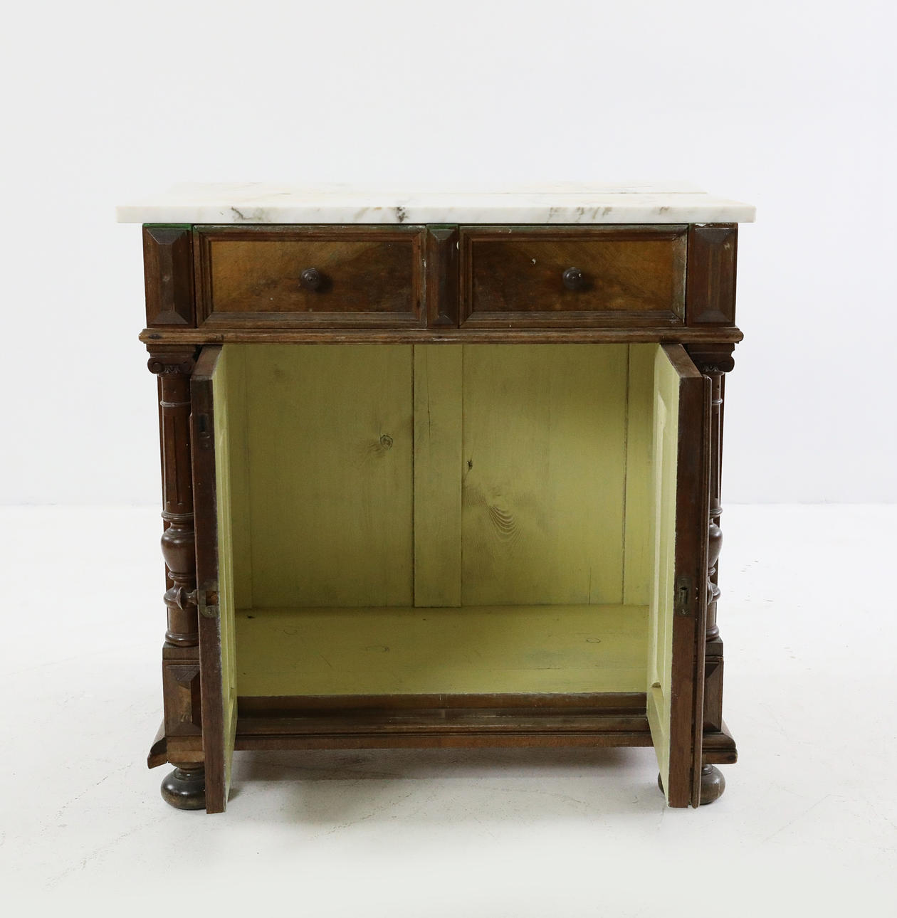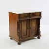 Med två lösa marmorskivor. Skåpsluckor med plats för förvaring, samt två draglådor. Höjd 77 cm Bredd 75 cm Djup 50 cm.