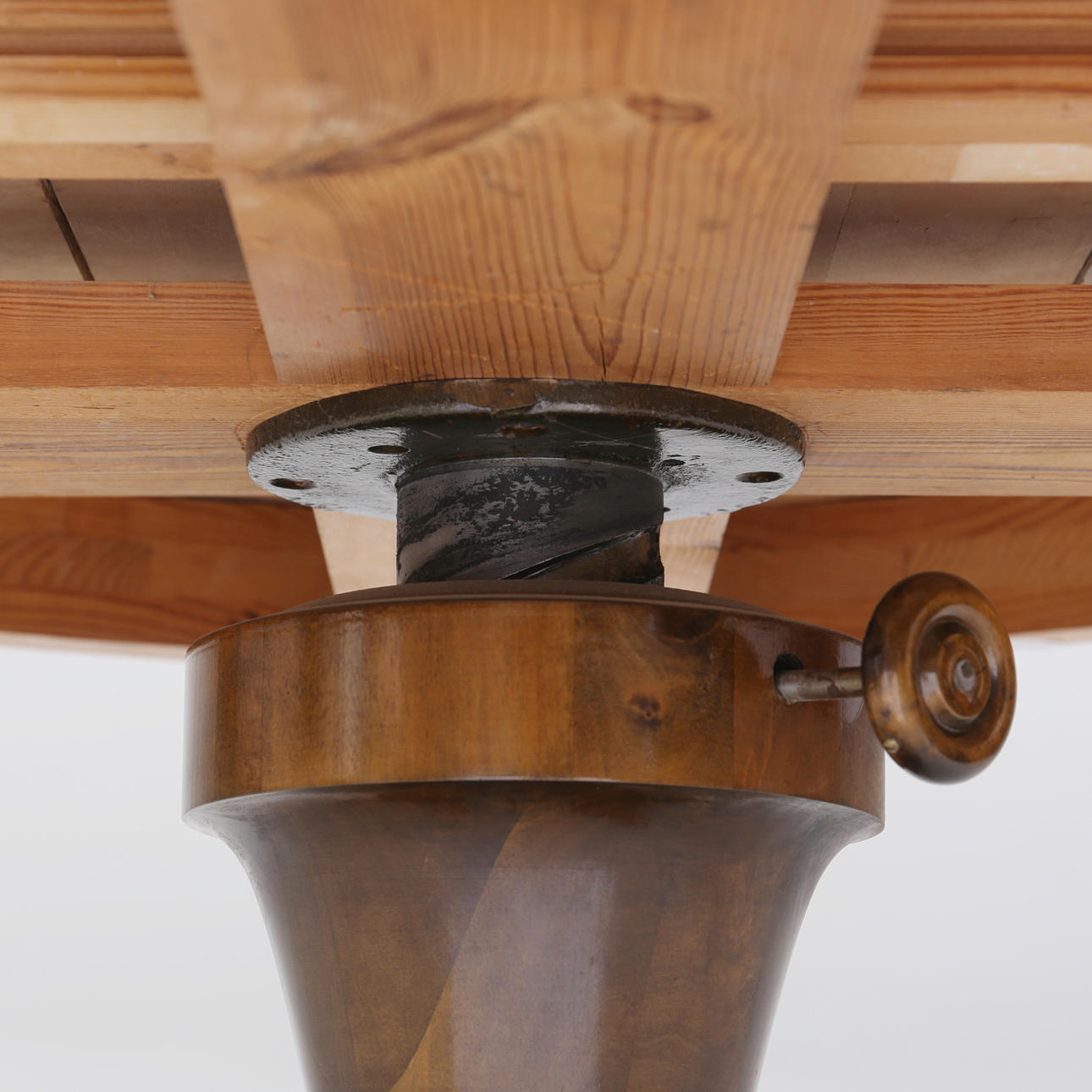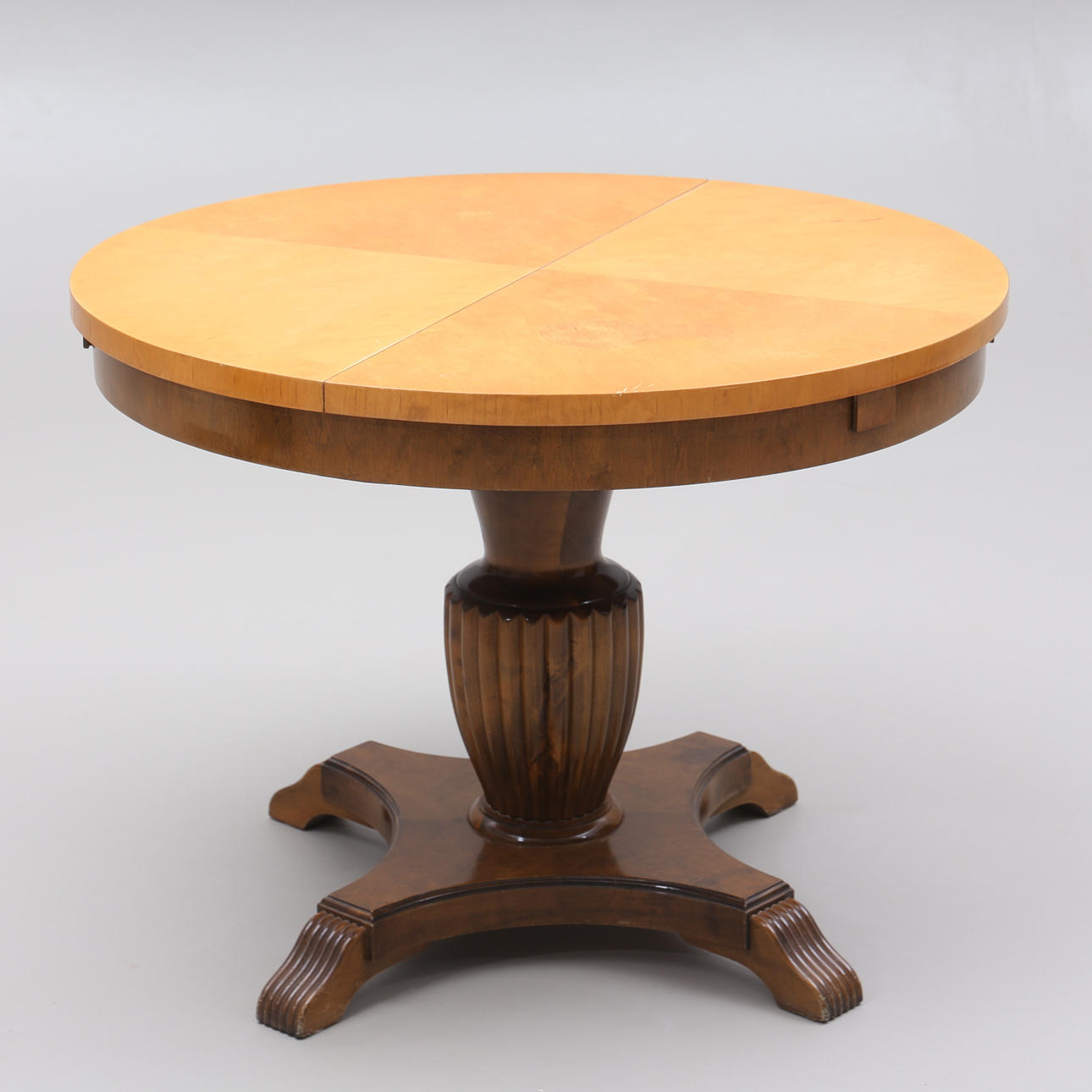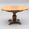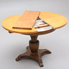 Höj och sänkbart. Höjd som på bild 63 cm. Diameter 84,5 cm. Iläggsskiva medföljer bredd 29,5 cm.