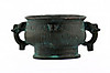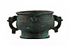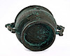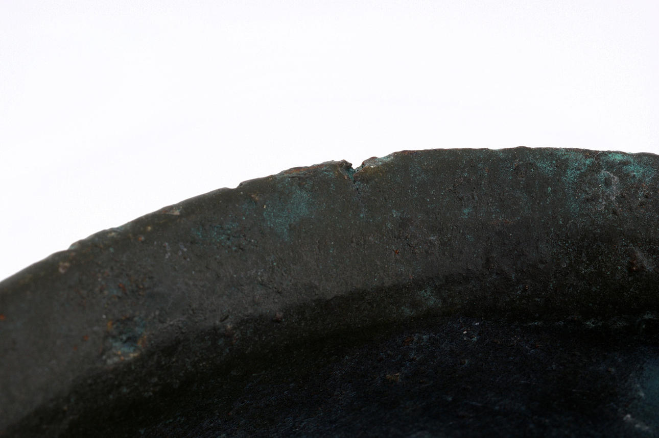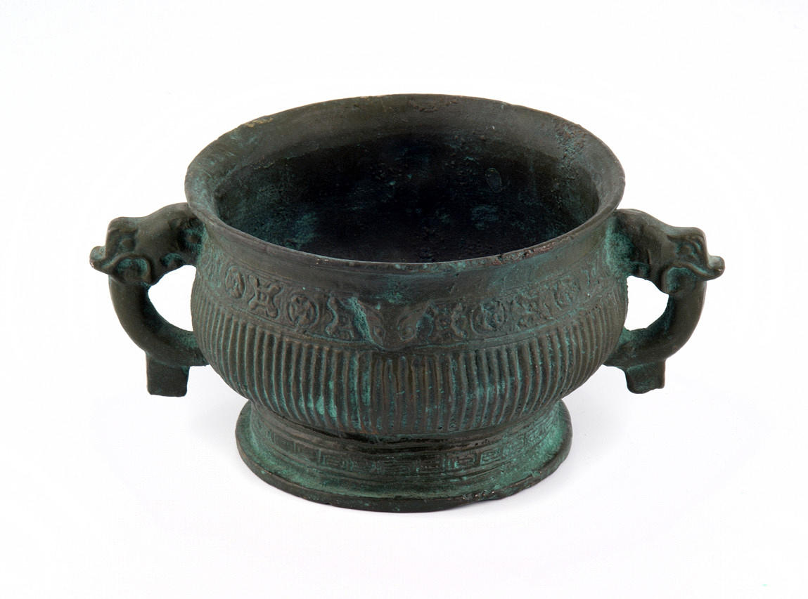 Tydligen medeltida fartyg med stiliserade mytiska varelser som handtag, omgivande reliefliknande dekoration och slingrar sig på basen. Yta med partiell grön patina. Mått: B 16 x H 7 cm, diameter 10,5 cm, exakt ålder okänd.