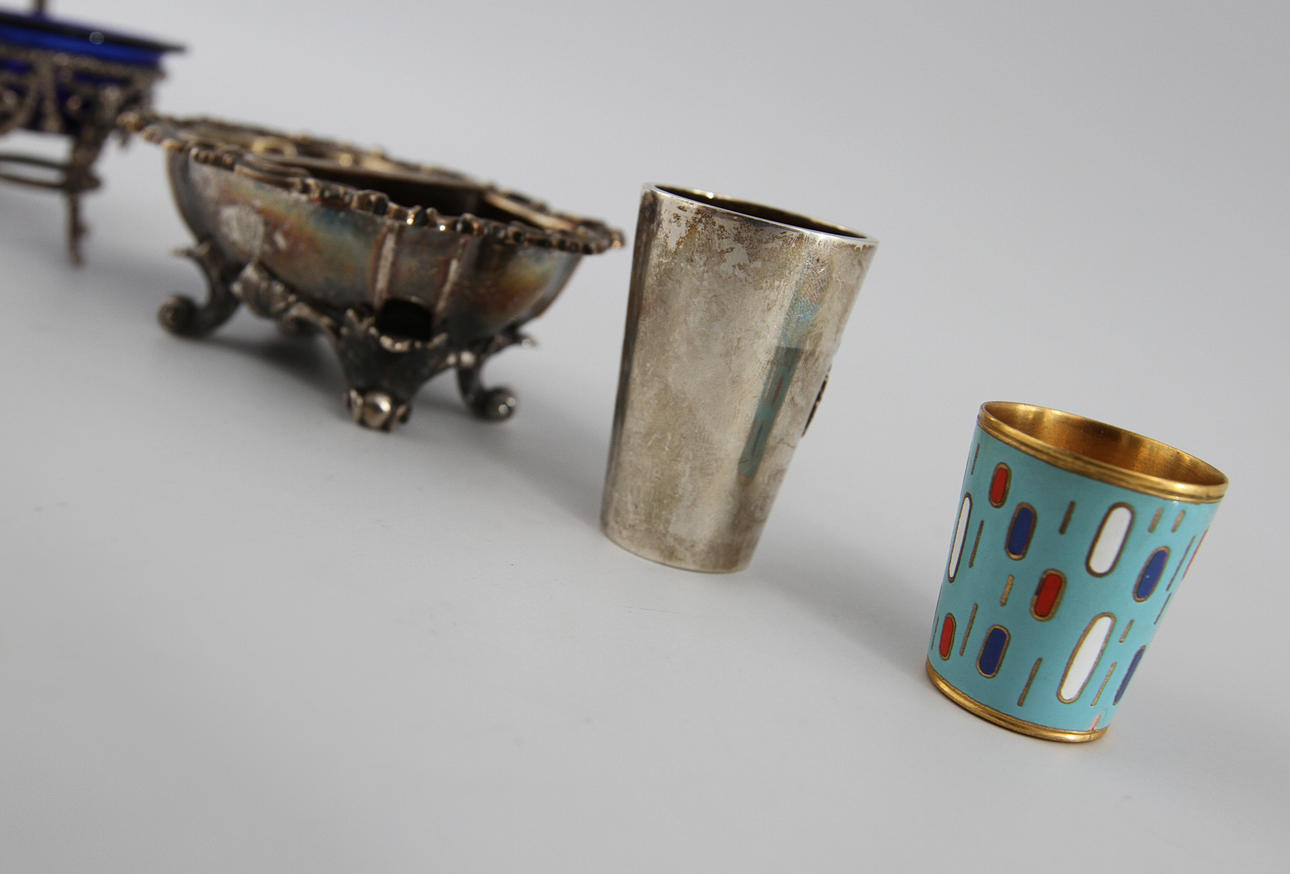 Saltkar 2 st, senapskanna, 5 små bägare samt skål. Höjd 3-9 cm.