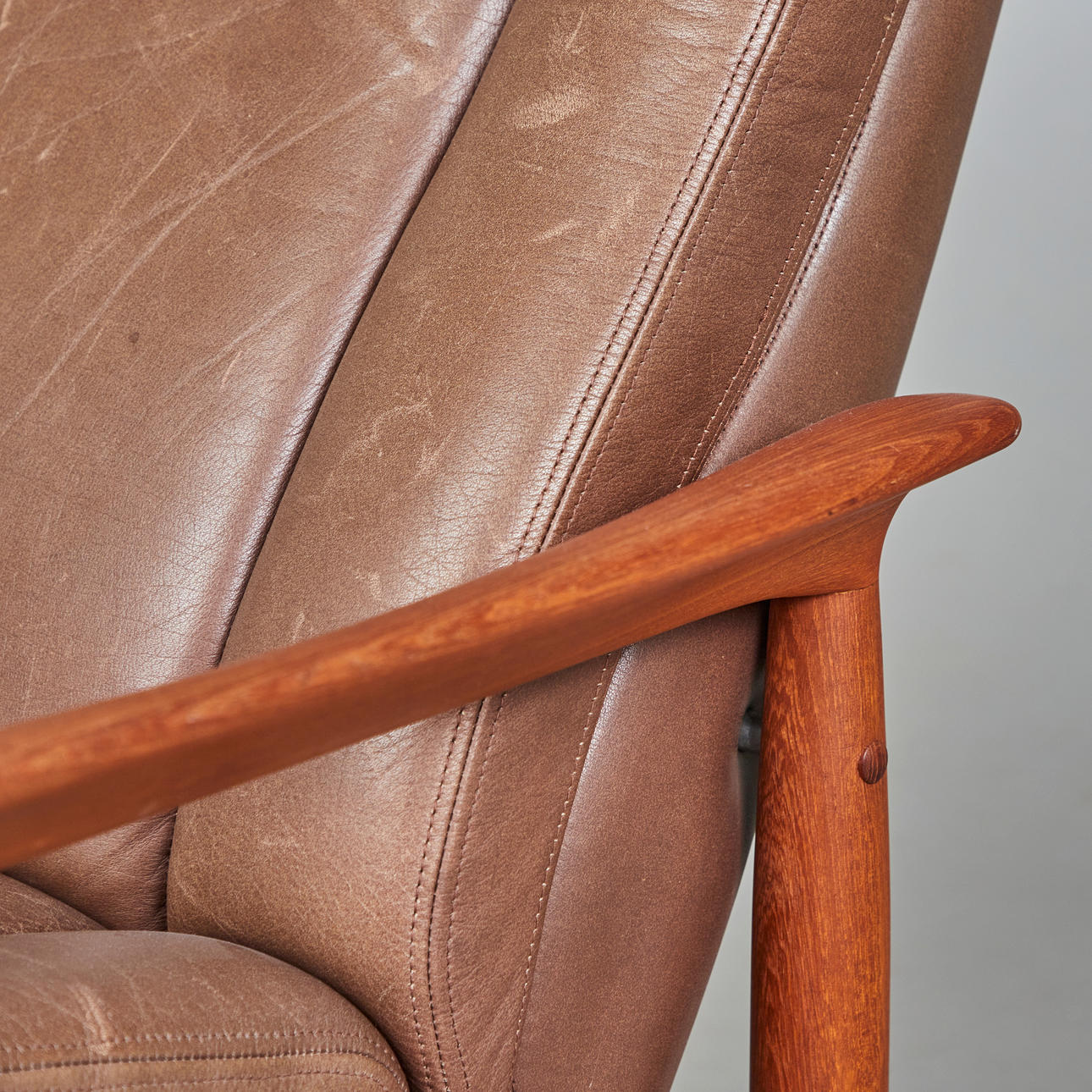 Fåtölj/solstol, teak, läder, 1970-tal. Fåtöljskonstruktion med glaserad teakram med armstöd och en stoppad sits och ryggstöd täckt i brunt läder, avtagbar klädsel, H.80-93cm, sitthöjd: 45cm, W.77cm, D.70-115cm.