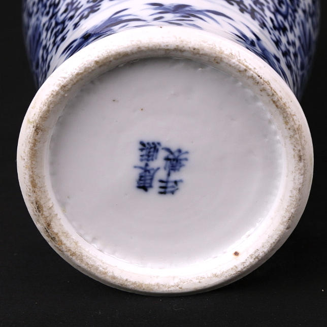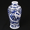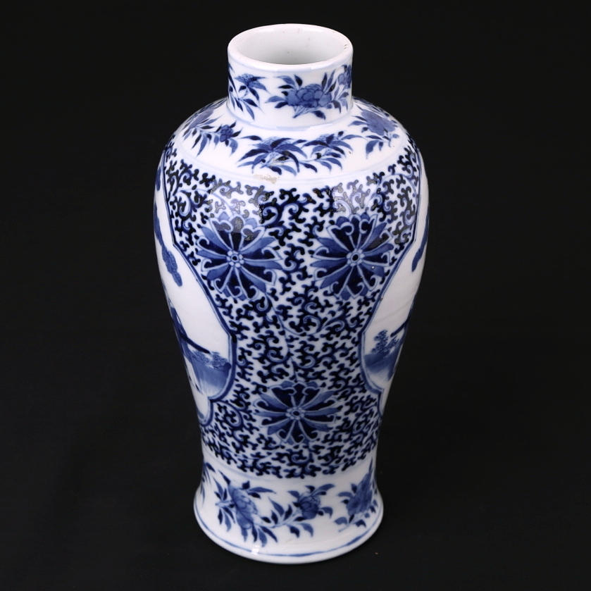 Blå blomsterdekor och figurscener, höjd 25 cm.