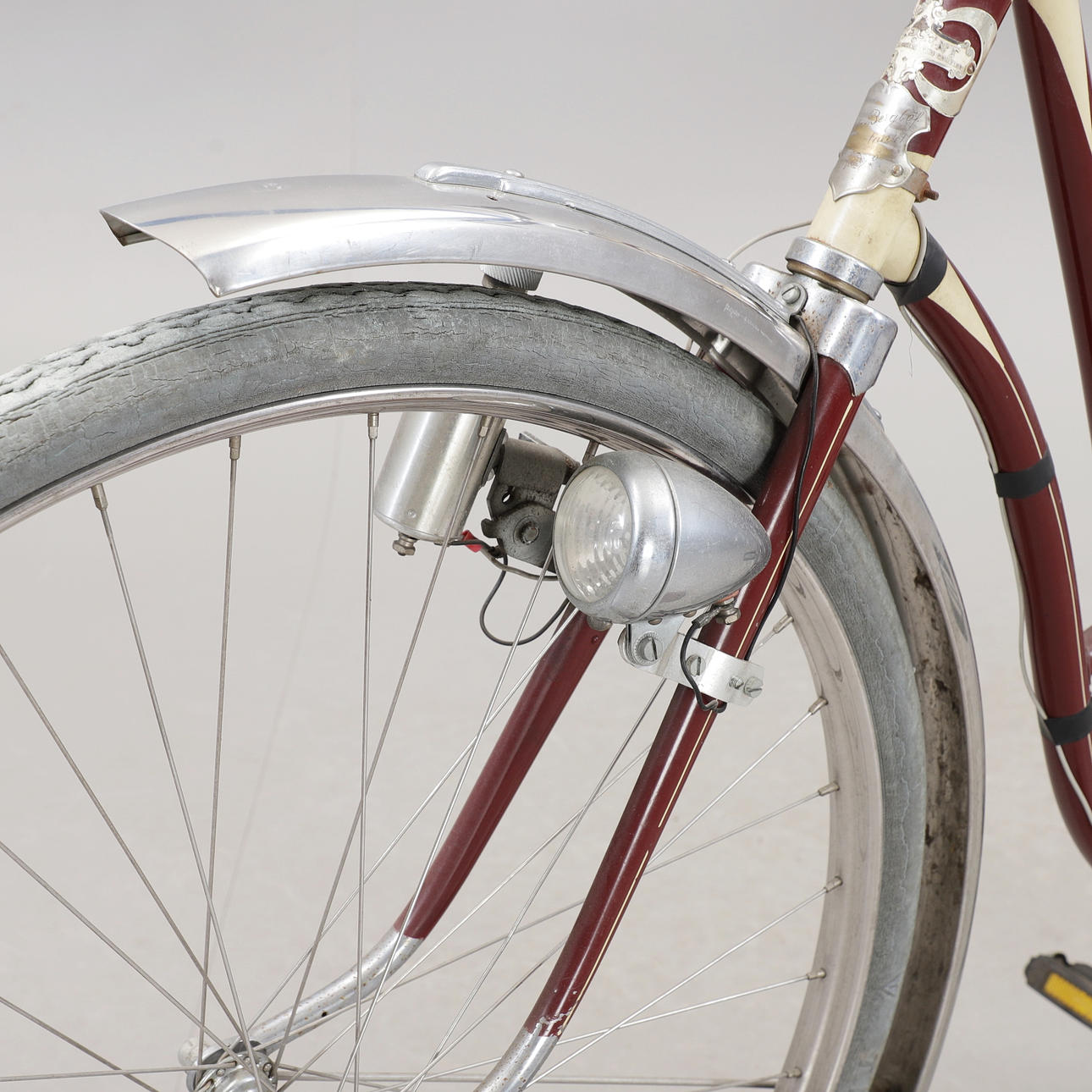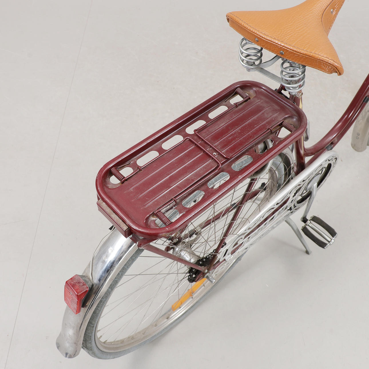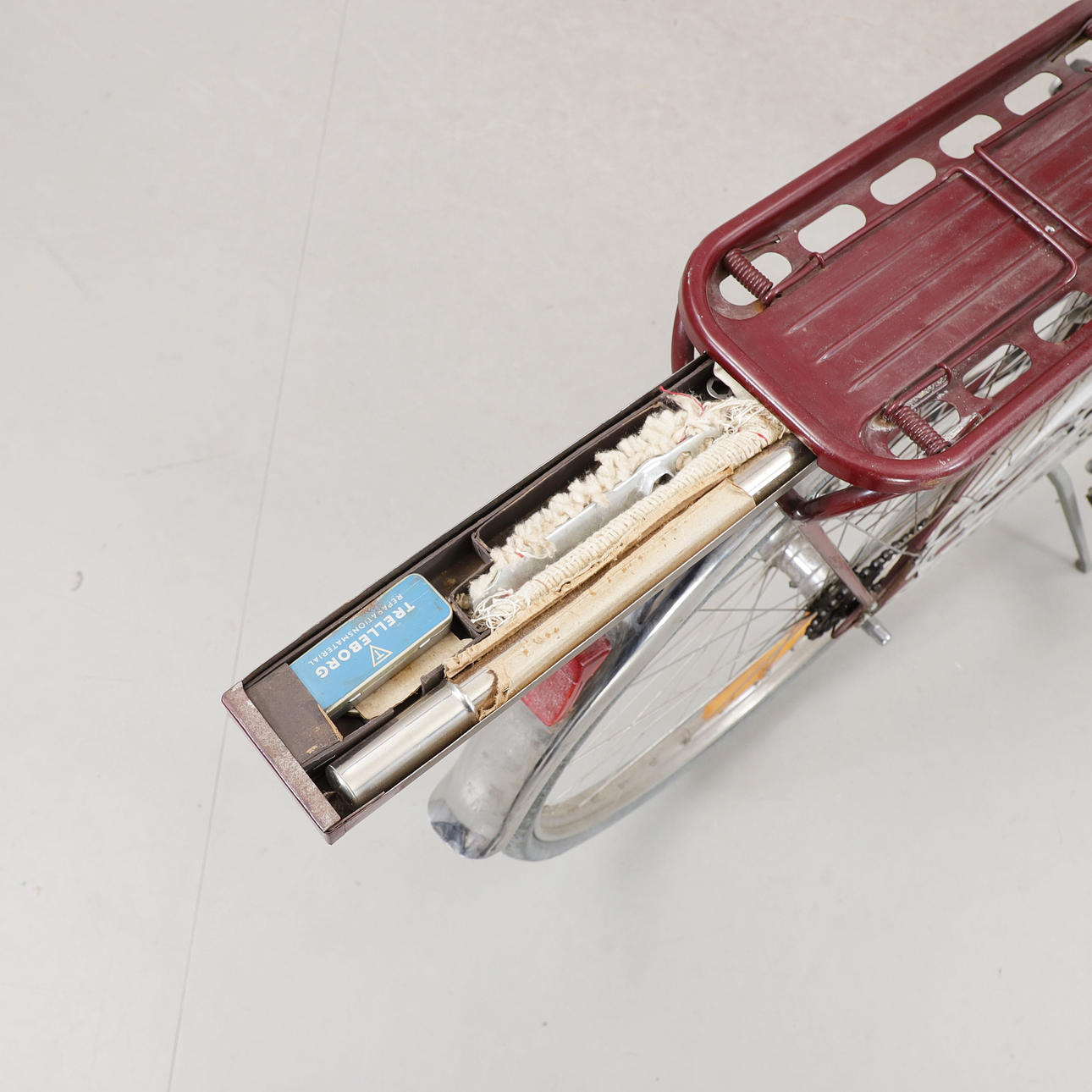 Med originalverktyg i låda vid pakethållare.