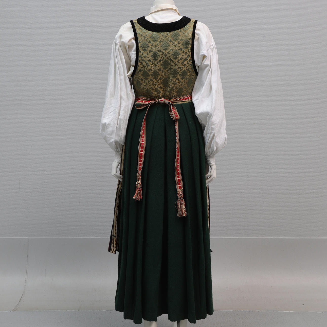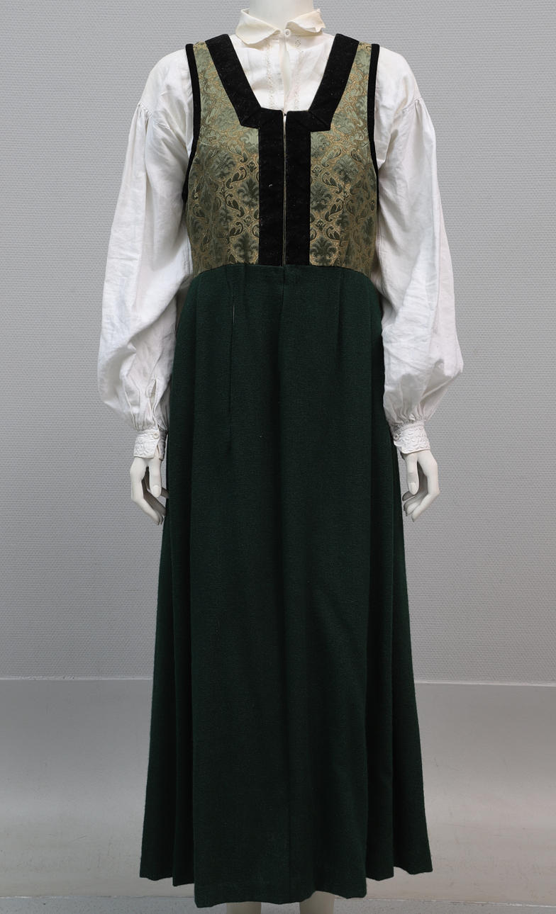 Klänning, längd ca 129 cm, midjemått ca 76 cm, bystmått ca 82 cm, längd på kjoldel ca 94 cm