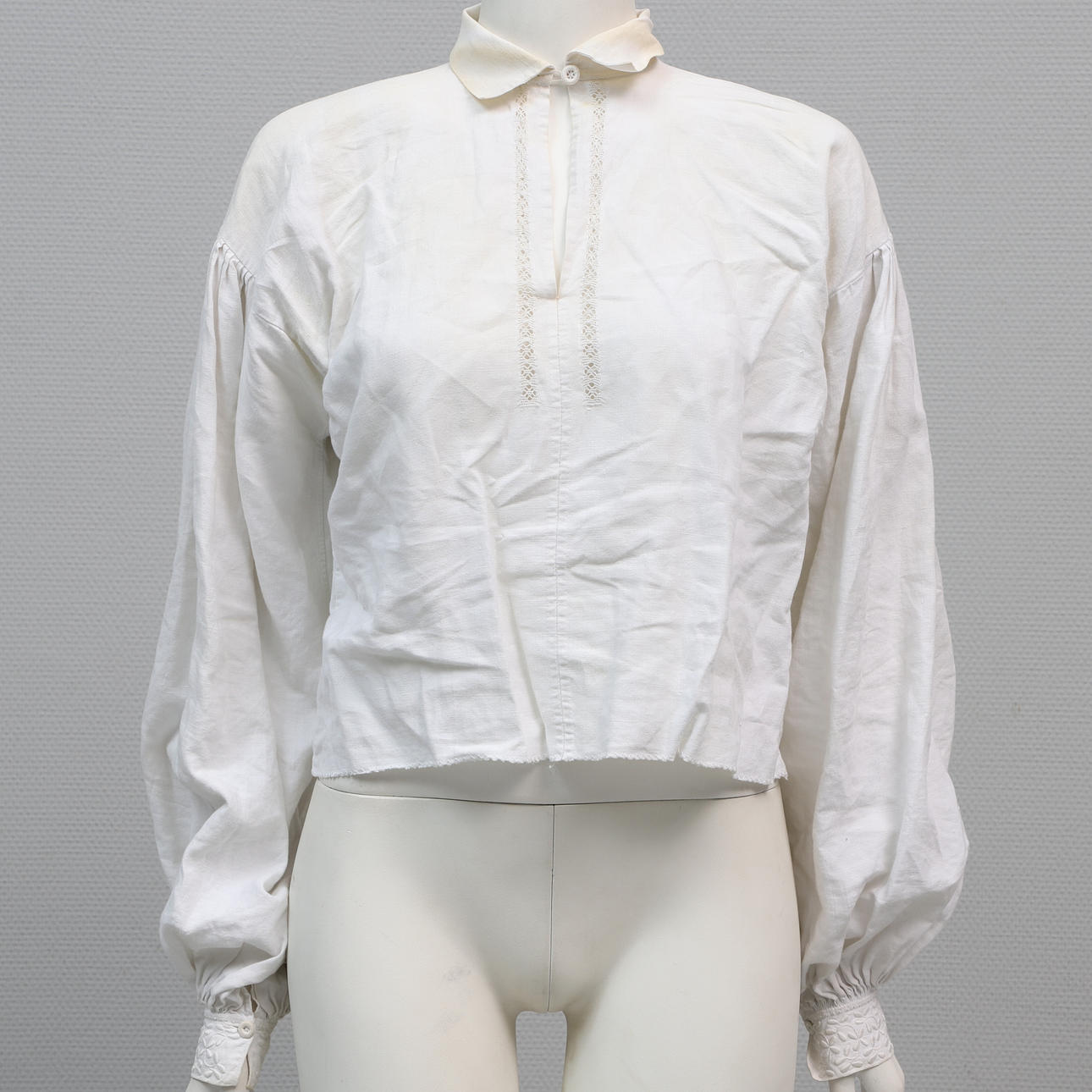 Skjorta, rygglängd ca 47 cm, midjemått ca 102 cm, bystmått ca 104 cm, armlängd ca 56 cm.