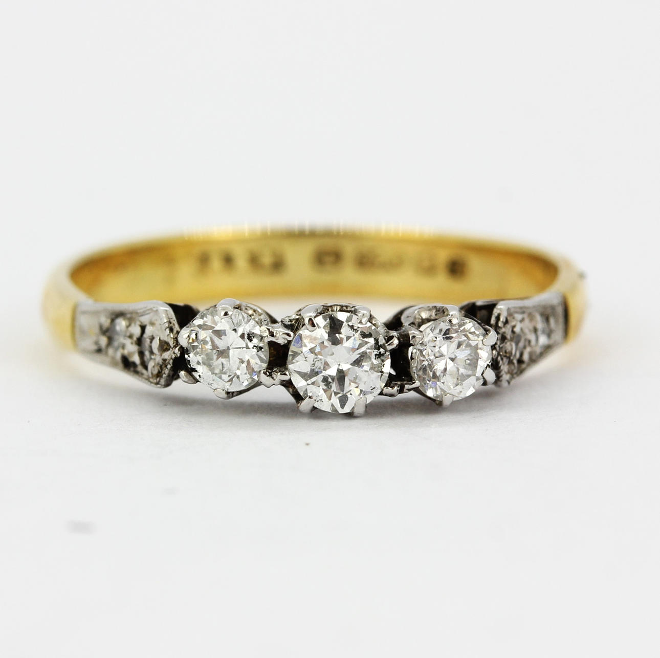 RING 18K gult och vitt guld med tre briljantslipade diamanter och små diamanter med axlar, ring storlek M.5.