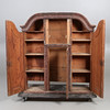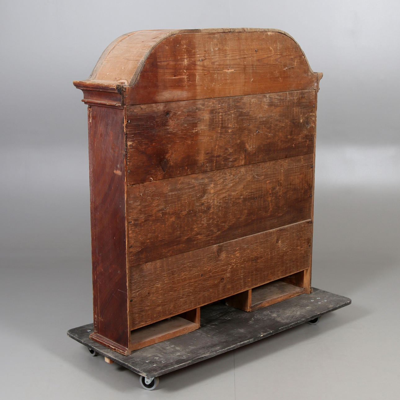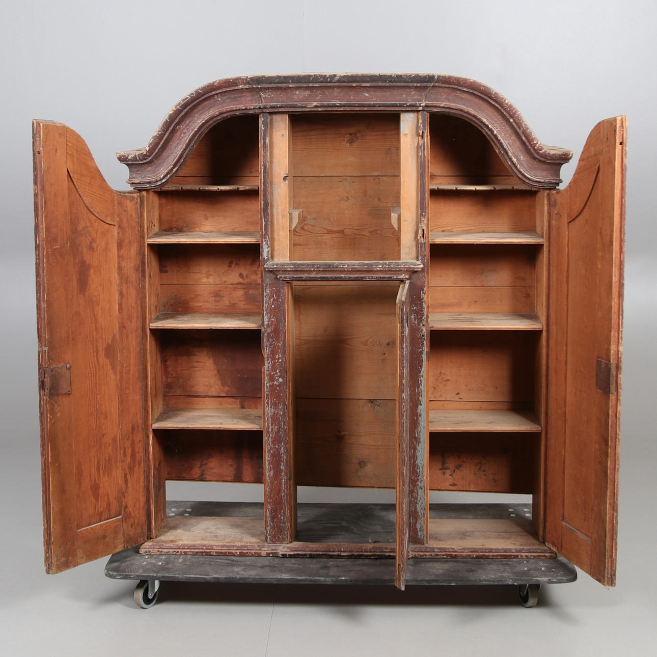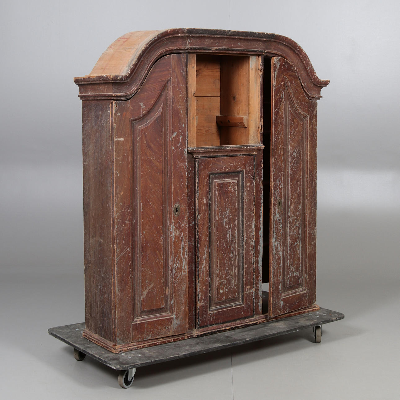 Överdel till klockskåp, tre skåpsluckor, delvis bemålat. Lucka för klocka saknas.