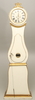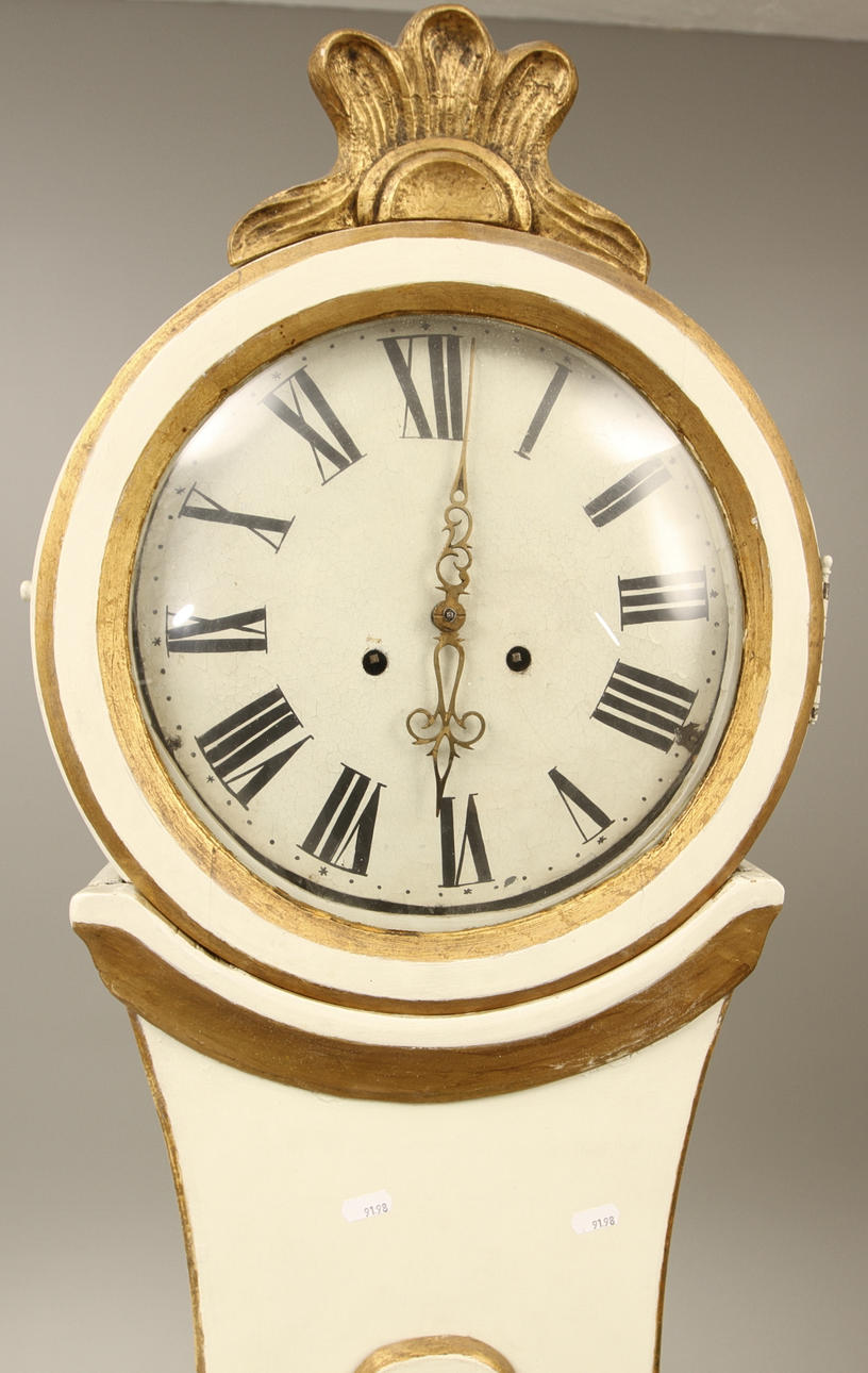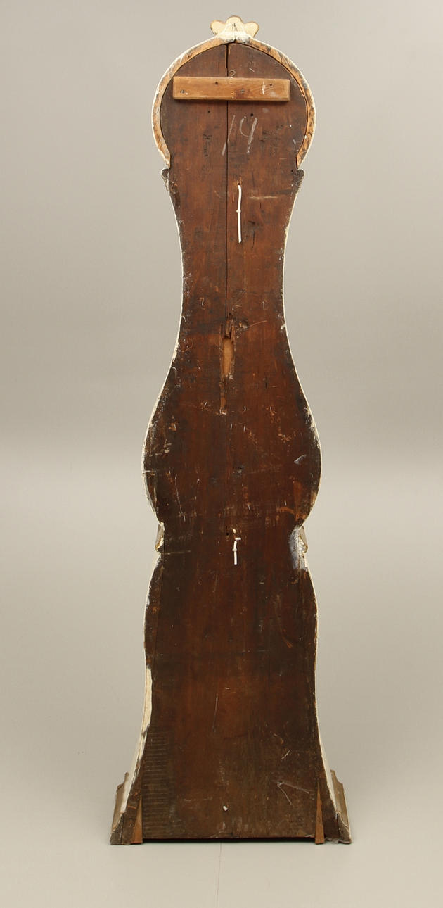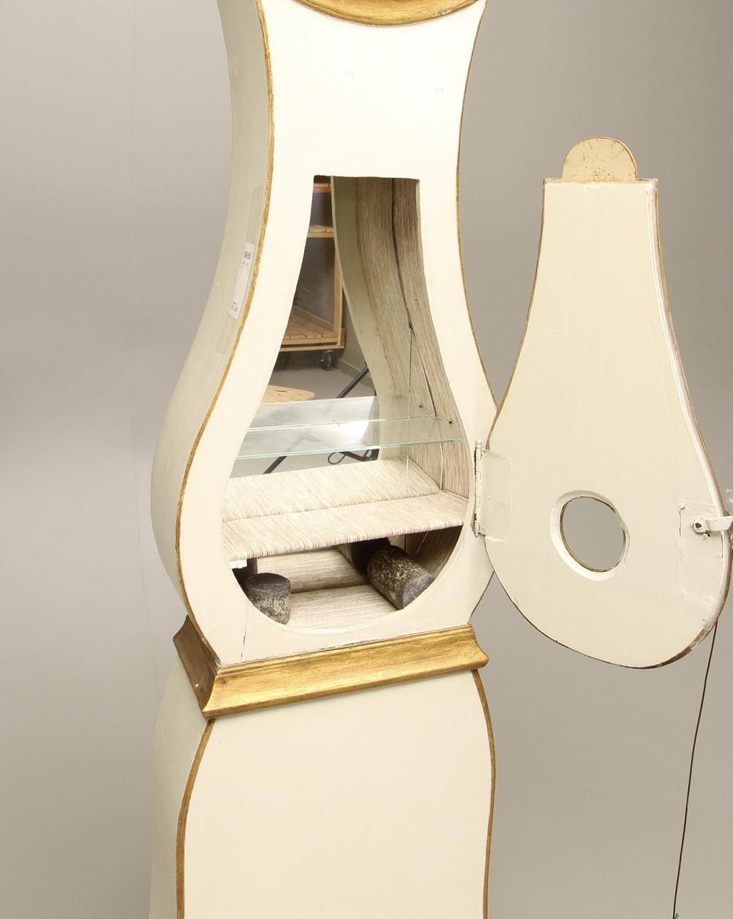 Svängt fodral. Vitmålat med gulddekor. Inrede med barskåp. Pendelstång och lod finns. Höjd 208 cm.
