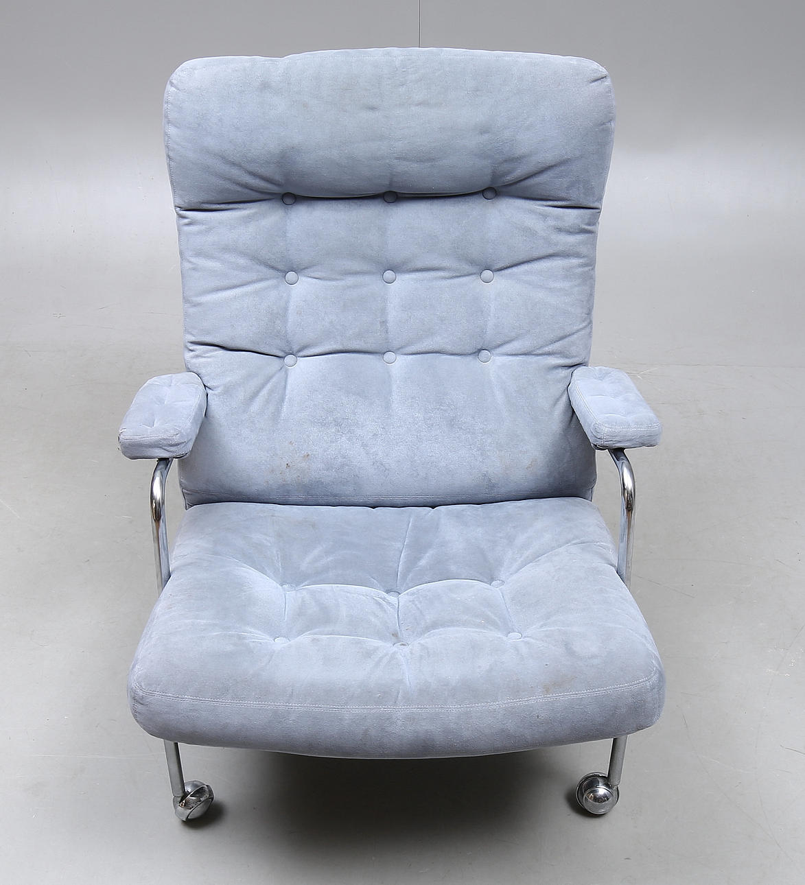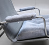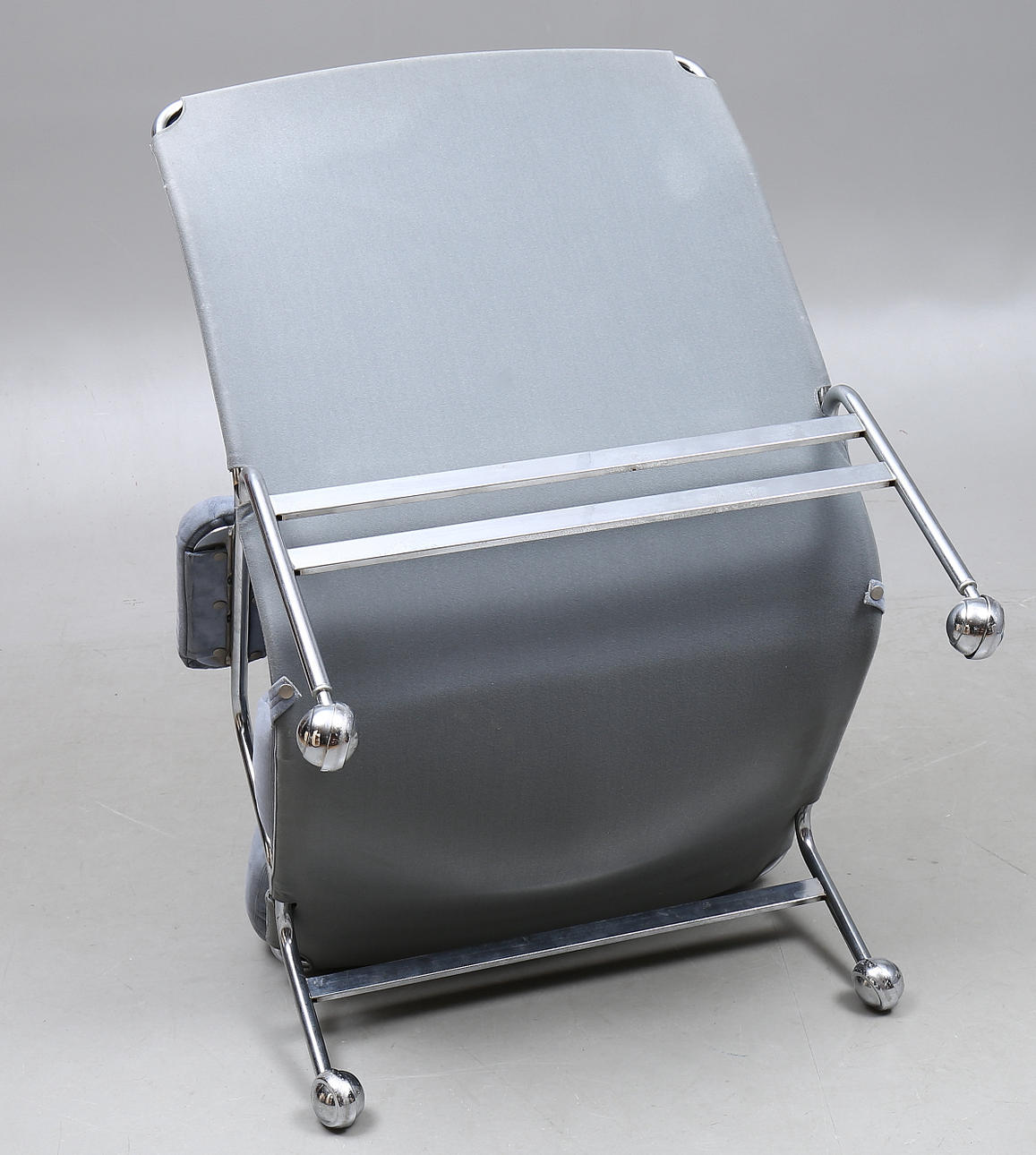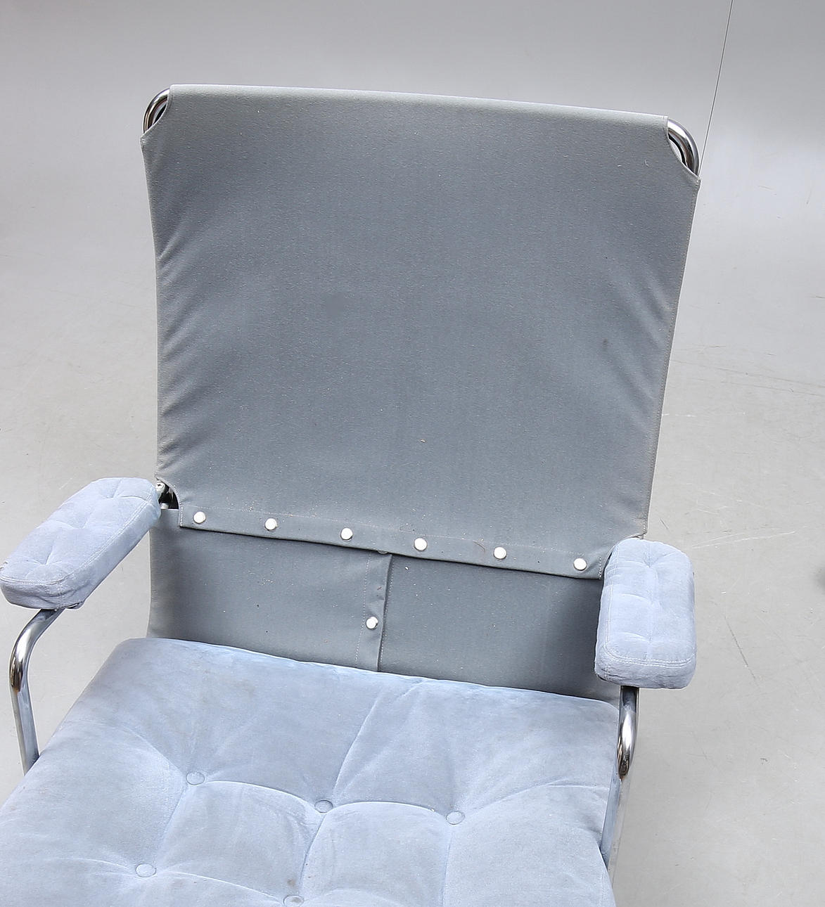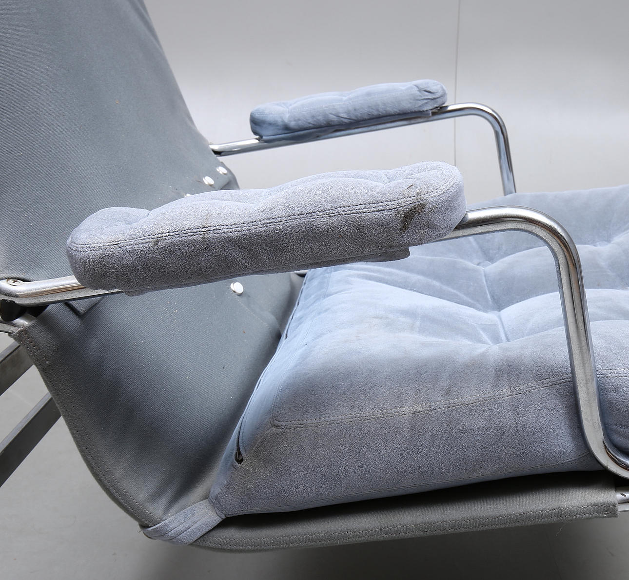 Stålrör med gråa sittdynor i mocka.