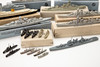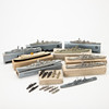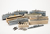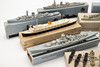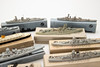 Samling av vattenlinjemodeller, skala 1:1250 m.fl., bly, gjuten och plast i gråtoner, delvis Målad i färg. Olika fartygstyper inklusive 'Blücher', tung kryssare 'Admiral Hipper', 'Kreuzer Leipzig ', 'HMS Barham, 'och andra. Tillverkare och delvis Modellnamn.
