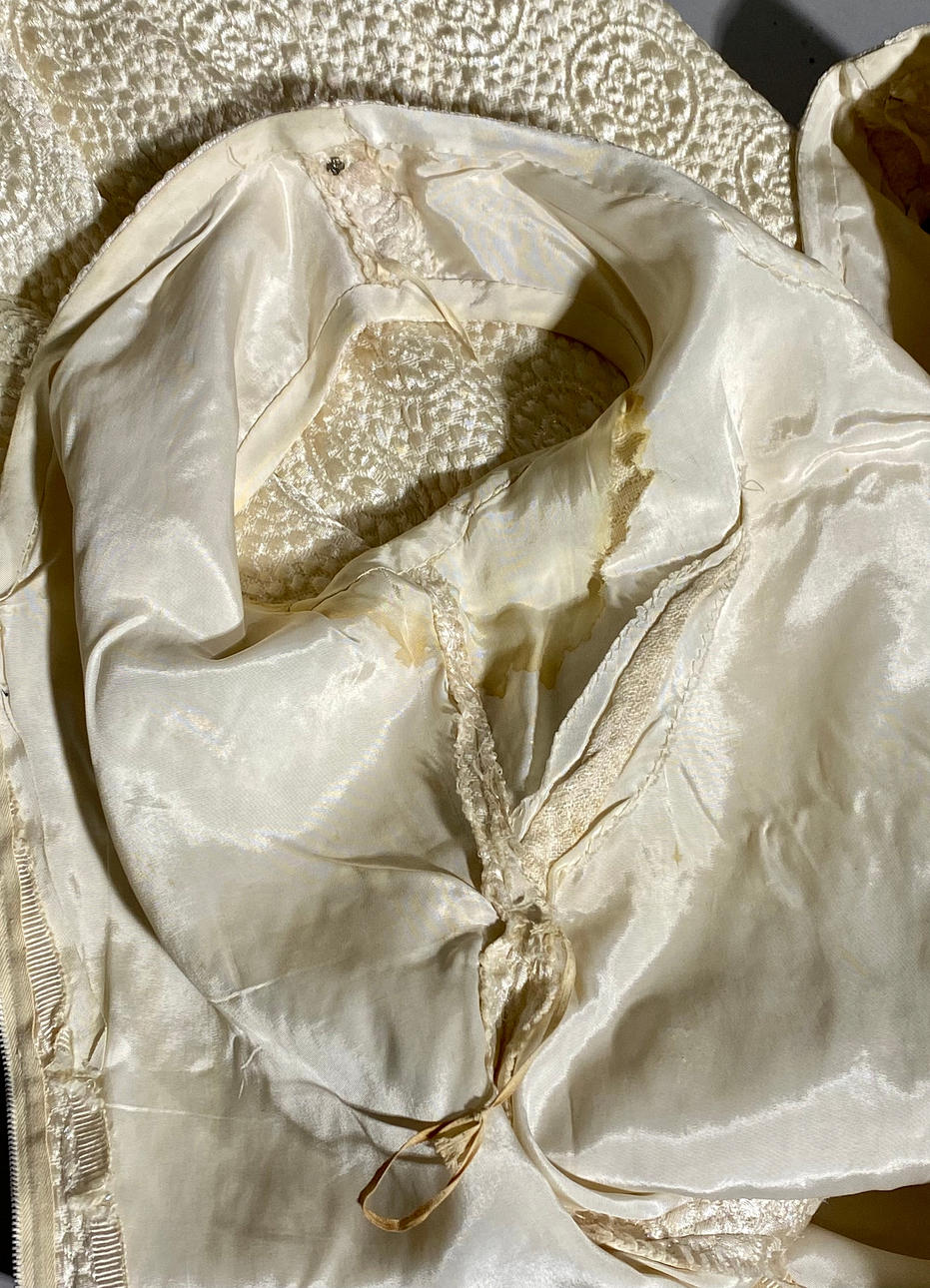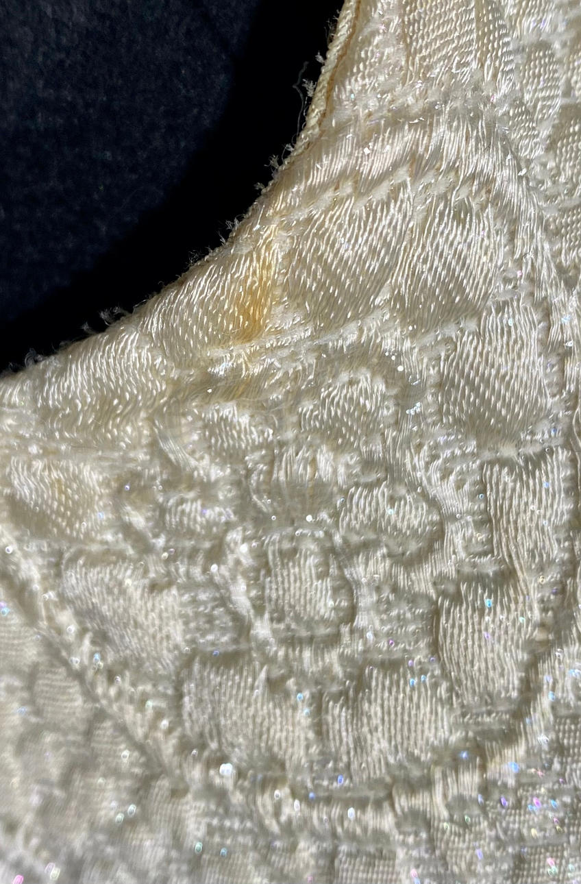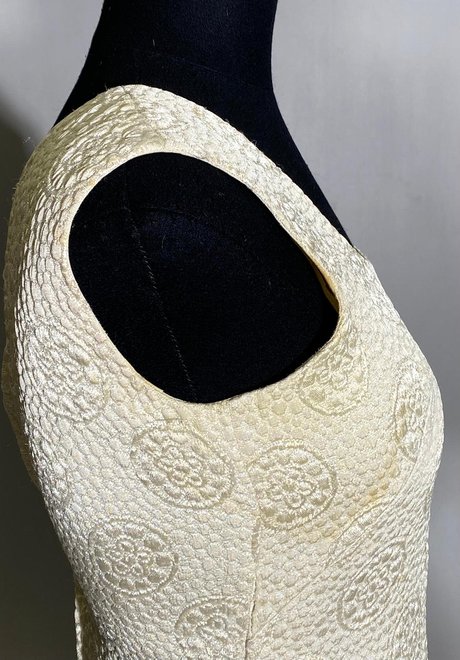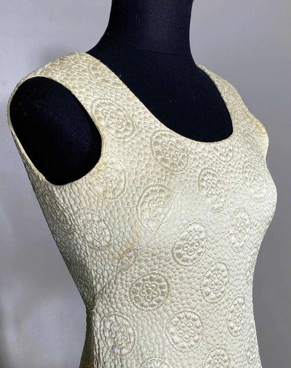70S VIT LÅNG KLÄNNING MED RELIEFER SOM BILDAR CIRKLAR.