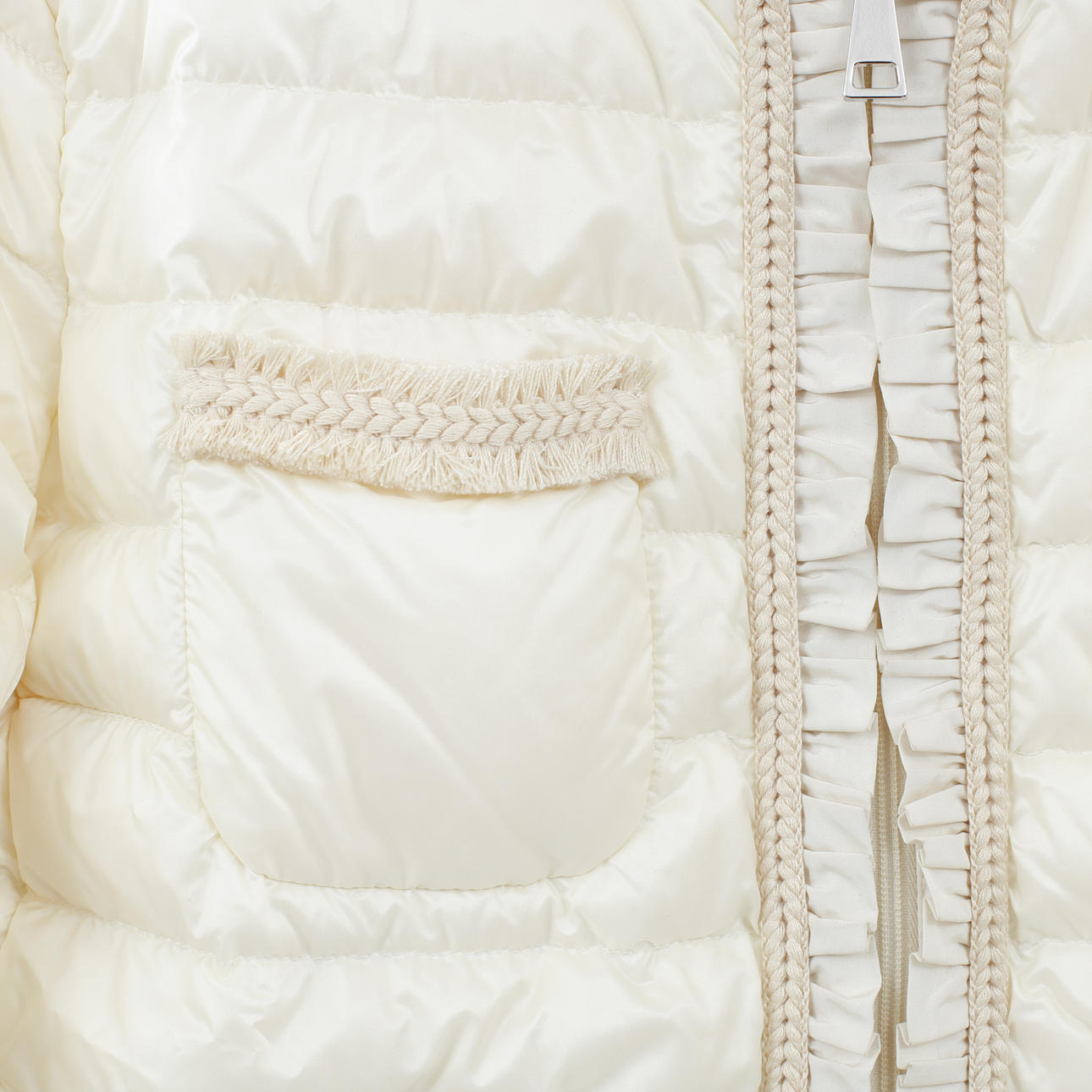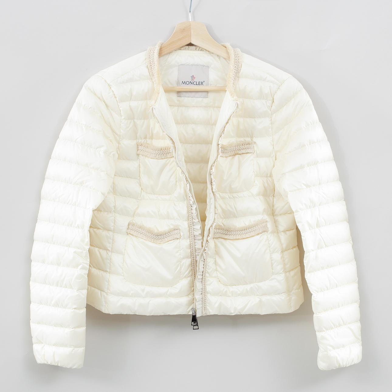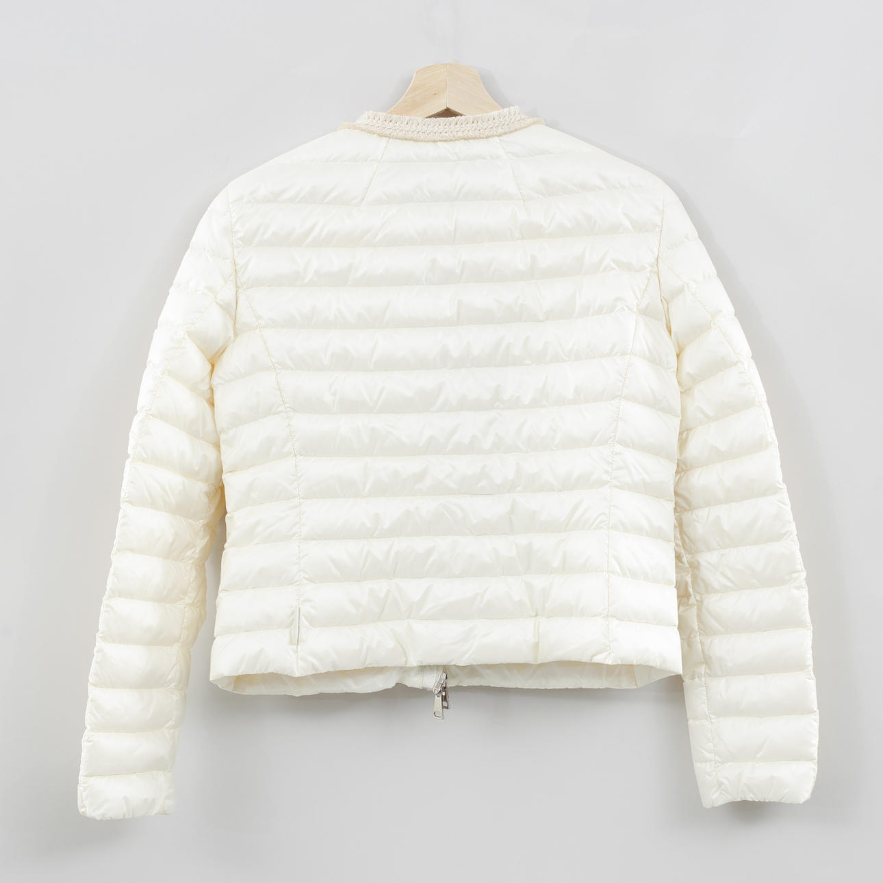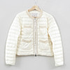 Tunn vit dunjacka med dekorativa flätade band. Bystvidd ca 92 cm, rygglängd ca 53 cm, ytterärmslängd ca 60 cm.