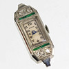 Platina, inte stämplad, experttestad, ca. 7,8 gram, åttfaldigt vinklat fodral med 4 diamanter och smaragder (en skadad) gjuten i fint Millegriffes verk, ca. 11,5 x 33 mm med klackar, urtavla märkt Windsor Swiss*, manuell dragsko startar inte, gammalt bakelit guldsmedfodral.