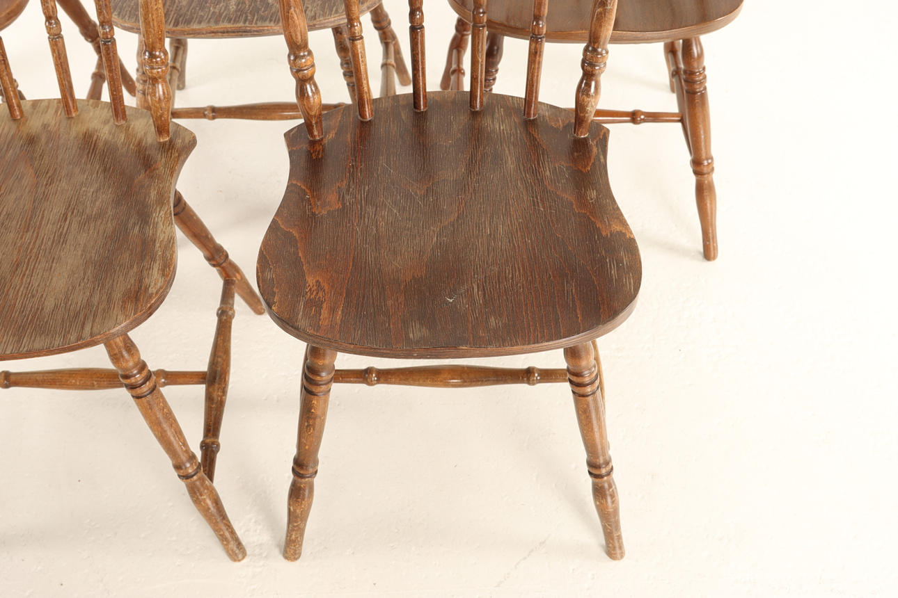 Bruksslitage, slitage varierar mellan stolarna. Skador/avslag på trä finns.