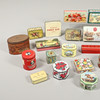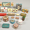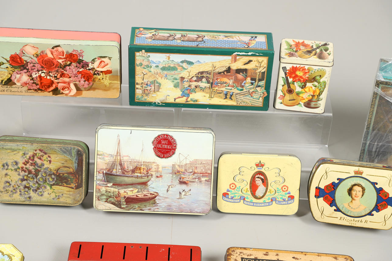 En samling av olika vintage burkar, med ett sortiment av mönster och olika åldrar, för choklad, kex, piller etc. En kvantitet., 2 lådor.