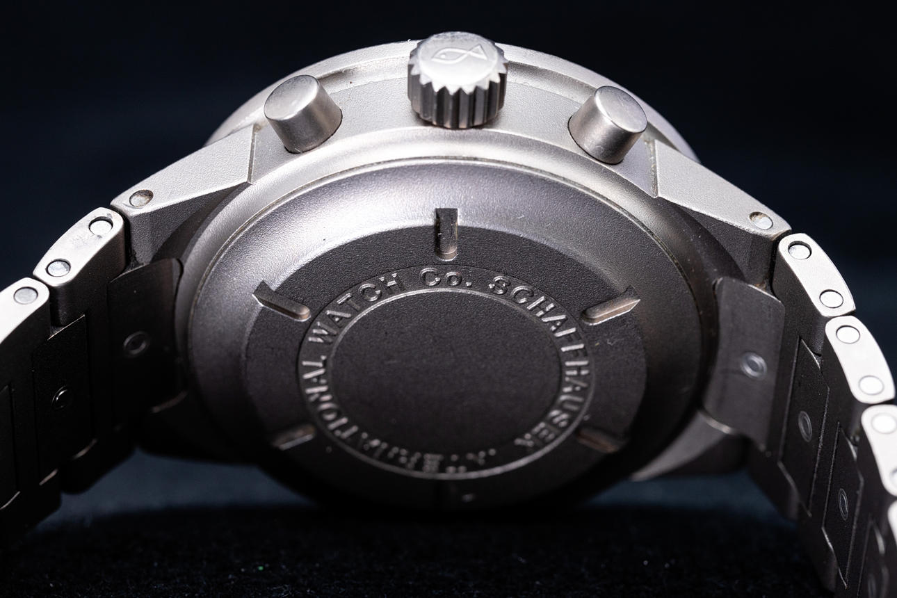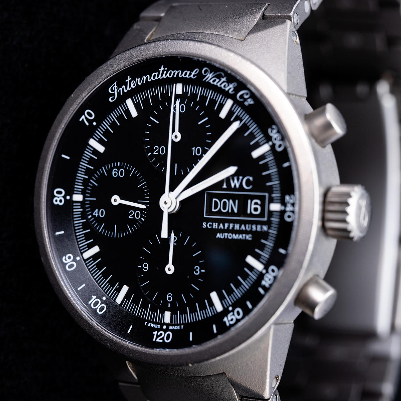 IWC armbandsur. Titanfodral och armband, svart urtavla med datumvisning på"3" klocka, krona med logotyp, automatisk rörelse med kronograffunktion, falldiameter ca.. 39mm Klockan kördes vid tidpunkten för granskningen, och Auctionet.com garanterar inte funktionalitet.