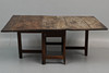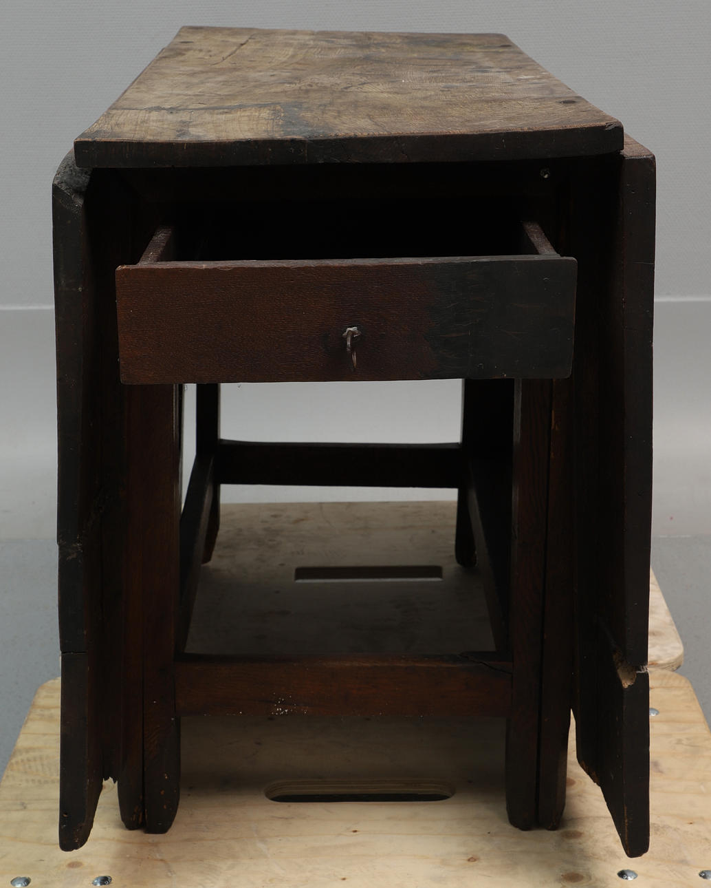 Större bruks- och åldersslitage med fläckar, märken, sprickor. Äldre lagning av skiva, benavslut med större avslag, bordet står snett, avslag i trä.