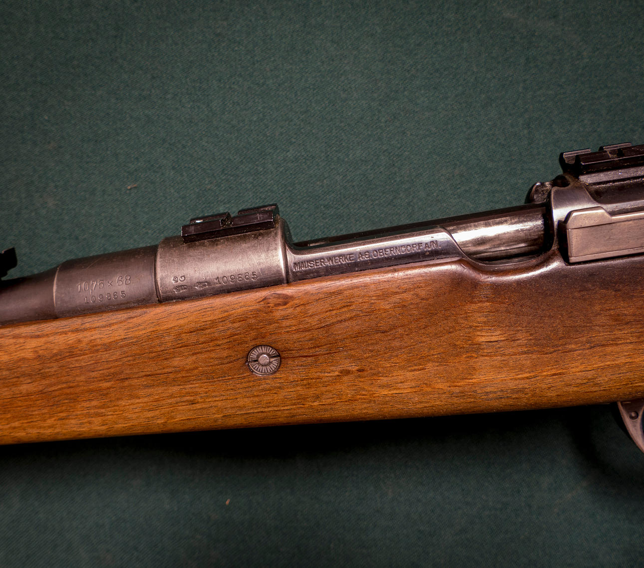 Studsare Tysk Repeter. Fabrikat Mauser Mod system 98. Kaliber 10,75x68. Tillv.nr. 109865. Piplängd 60cm. Ställbart sikte. Plundringsbart magasin. Flaggsäkring. Kolv ej original med Pistolgrepp Monte carlo kolv med gummibakkappa. Obs. Kindstöd på höger sida.