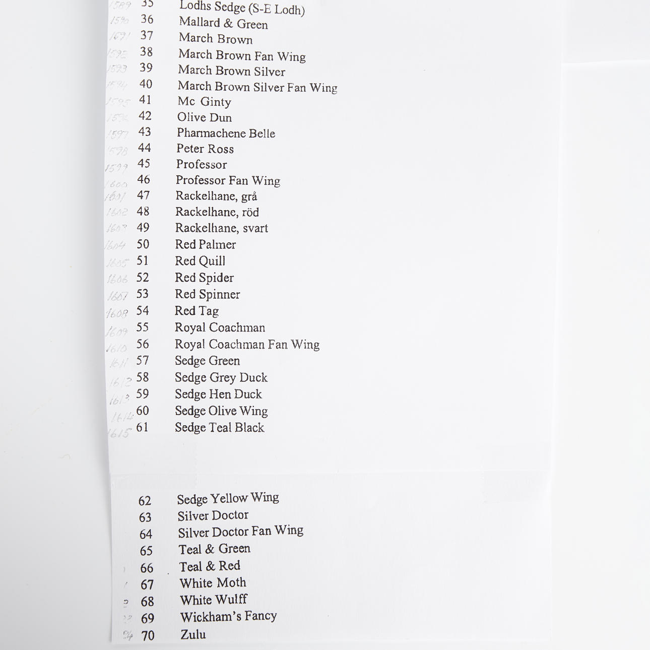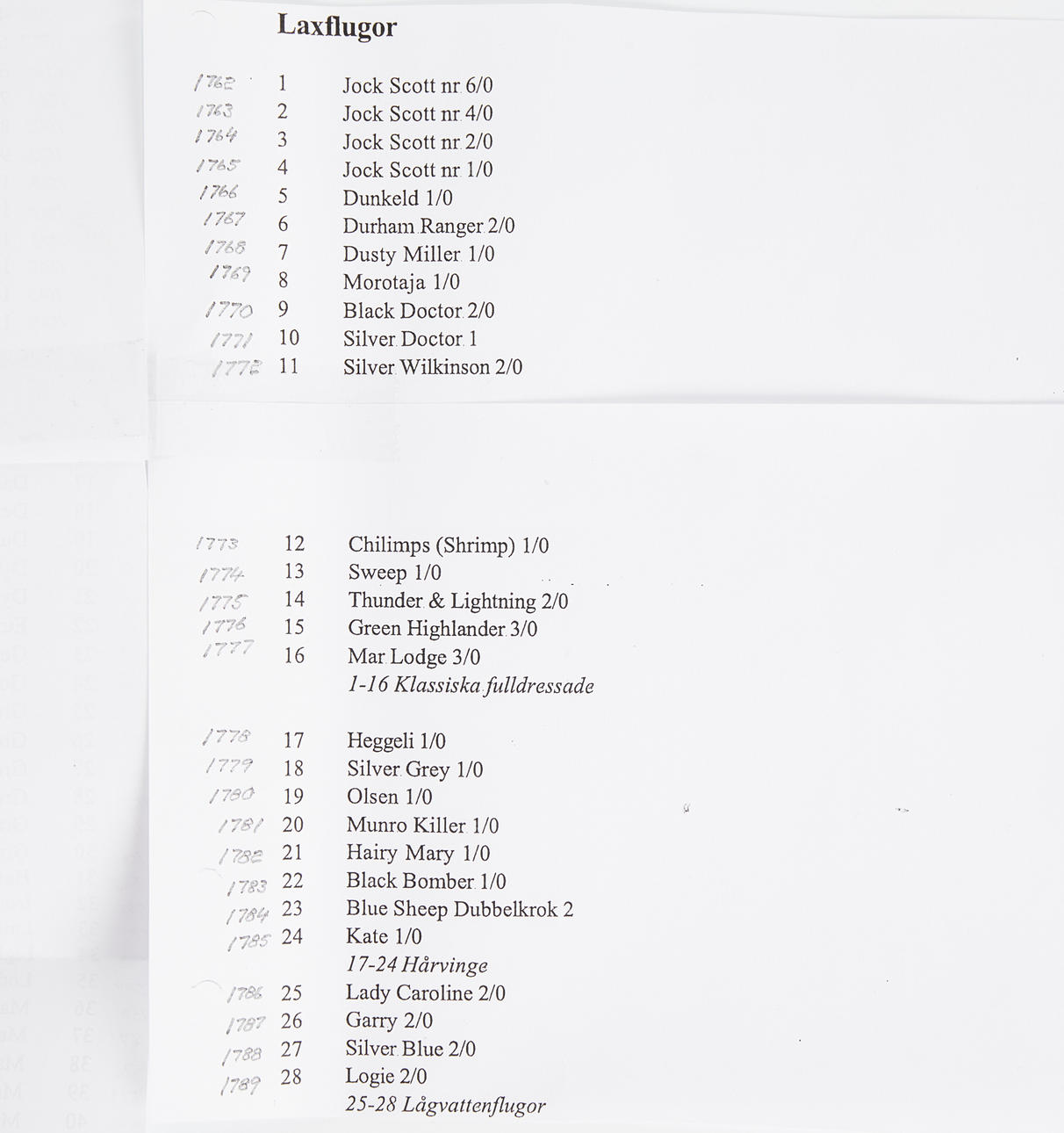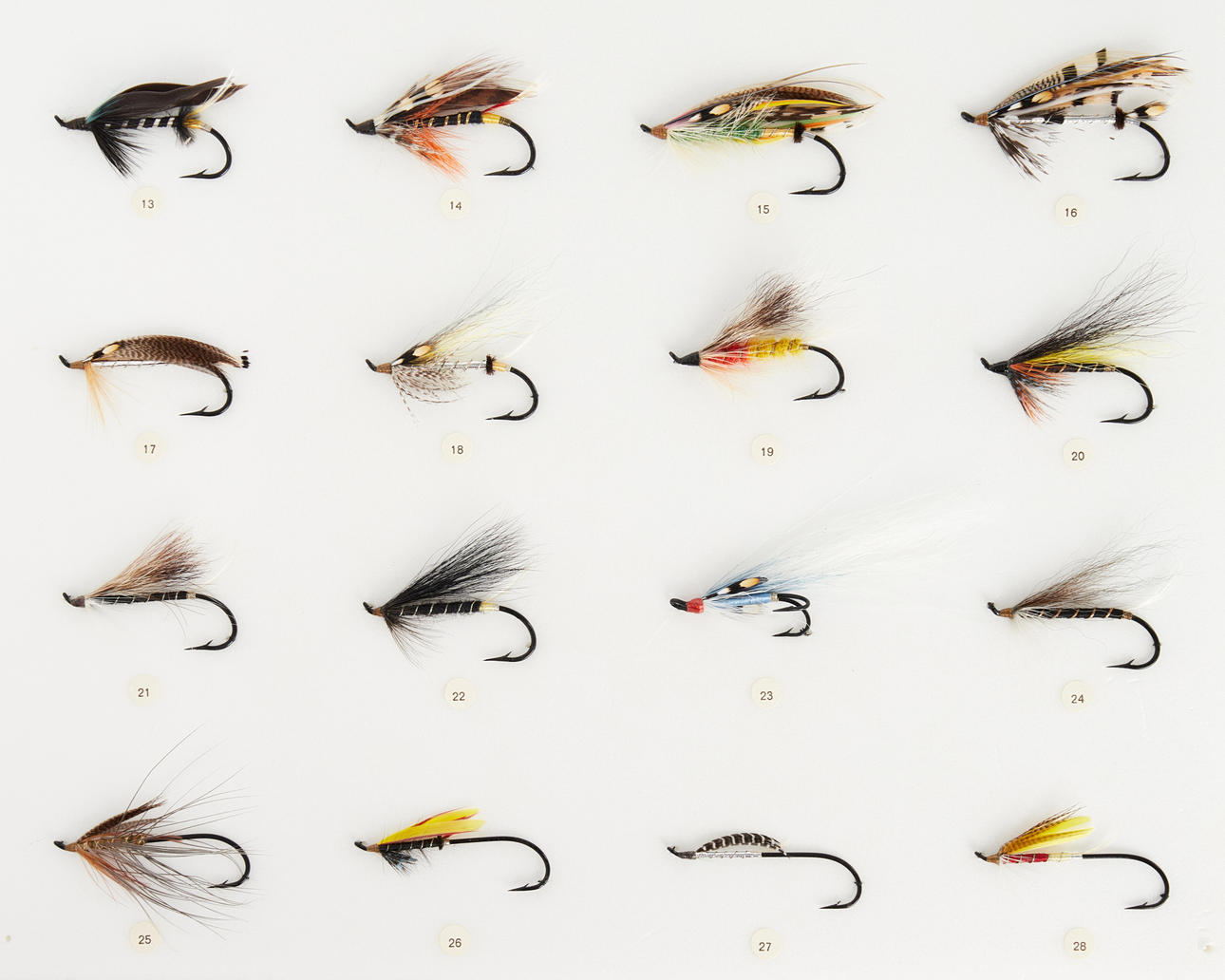 Laxflugor 1-28 varav 1-16 klassiska fulldressade, 17-24 hårvinge, 25-28 lågvattenflugor.