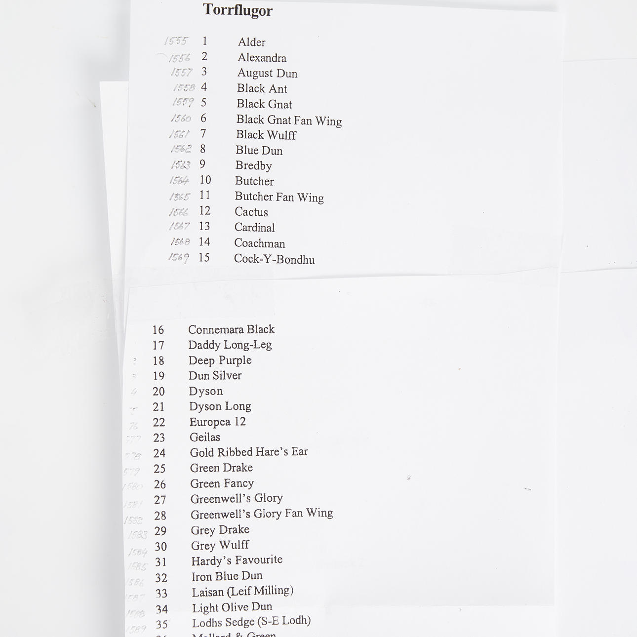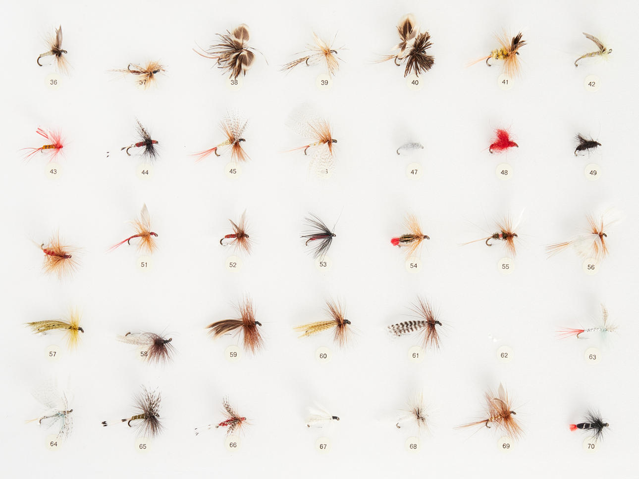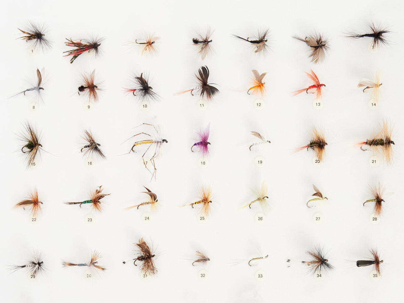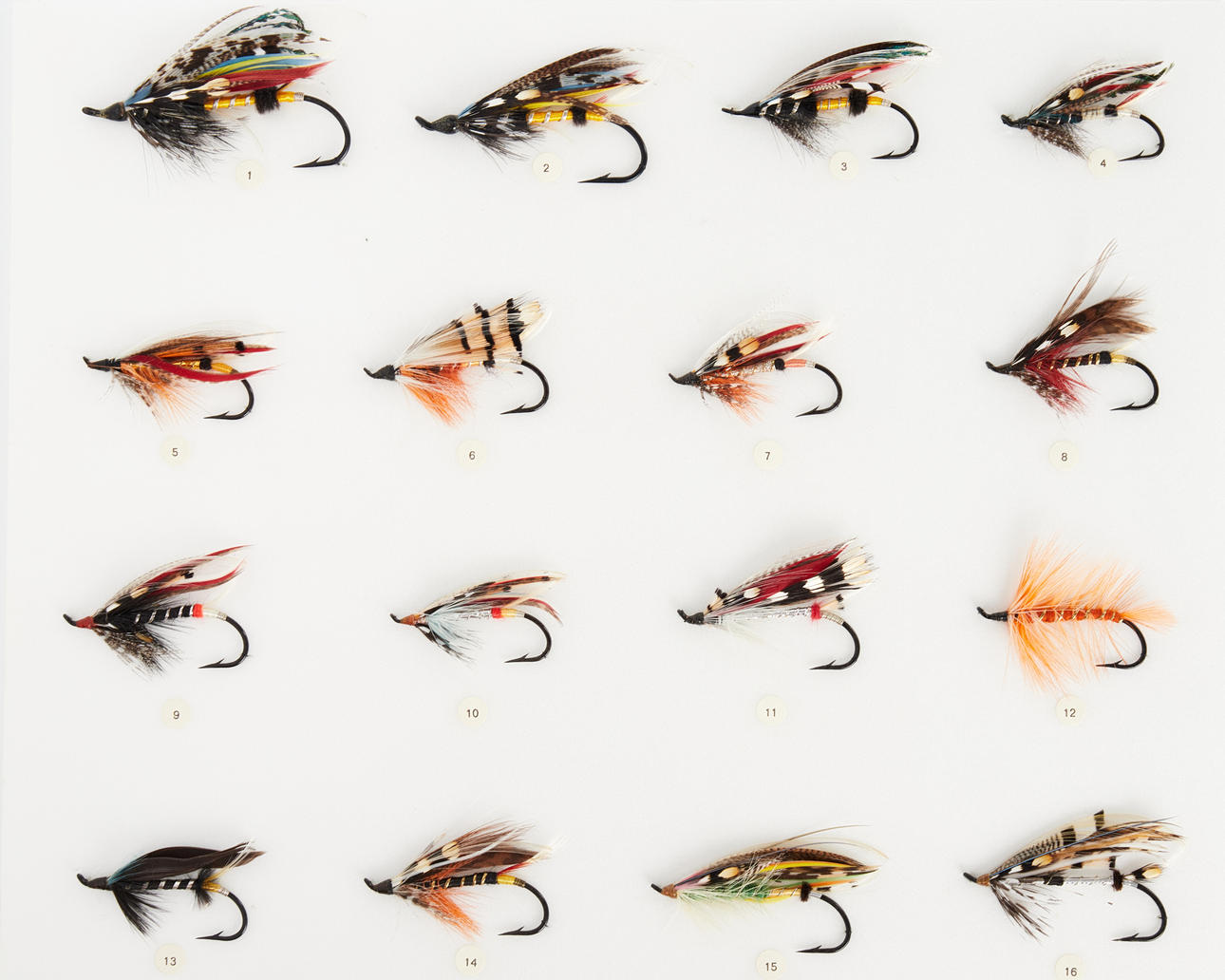 Laxflugor 1-28 varav 1-16 klassiska fulldressade, 17-24 hårvinge, 25-28 lågvattenflugor.