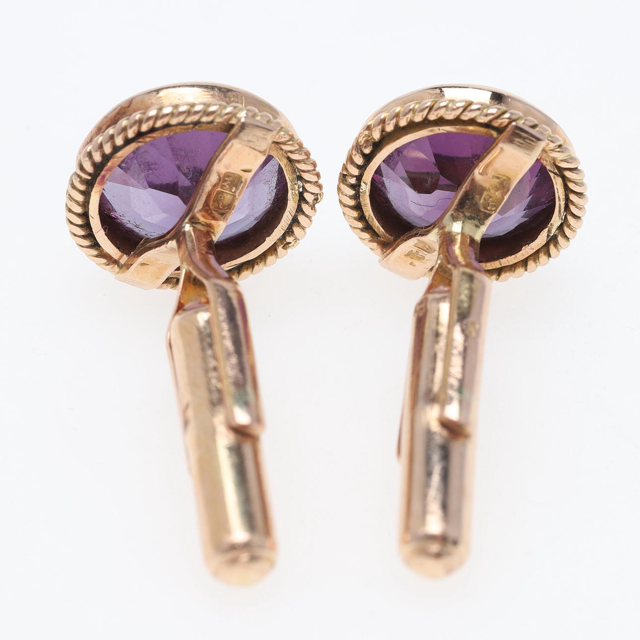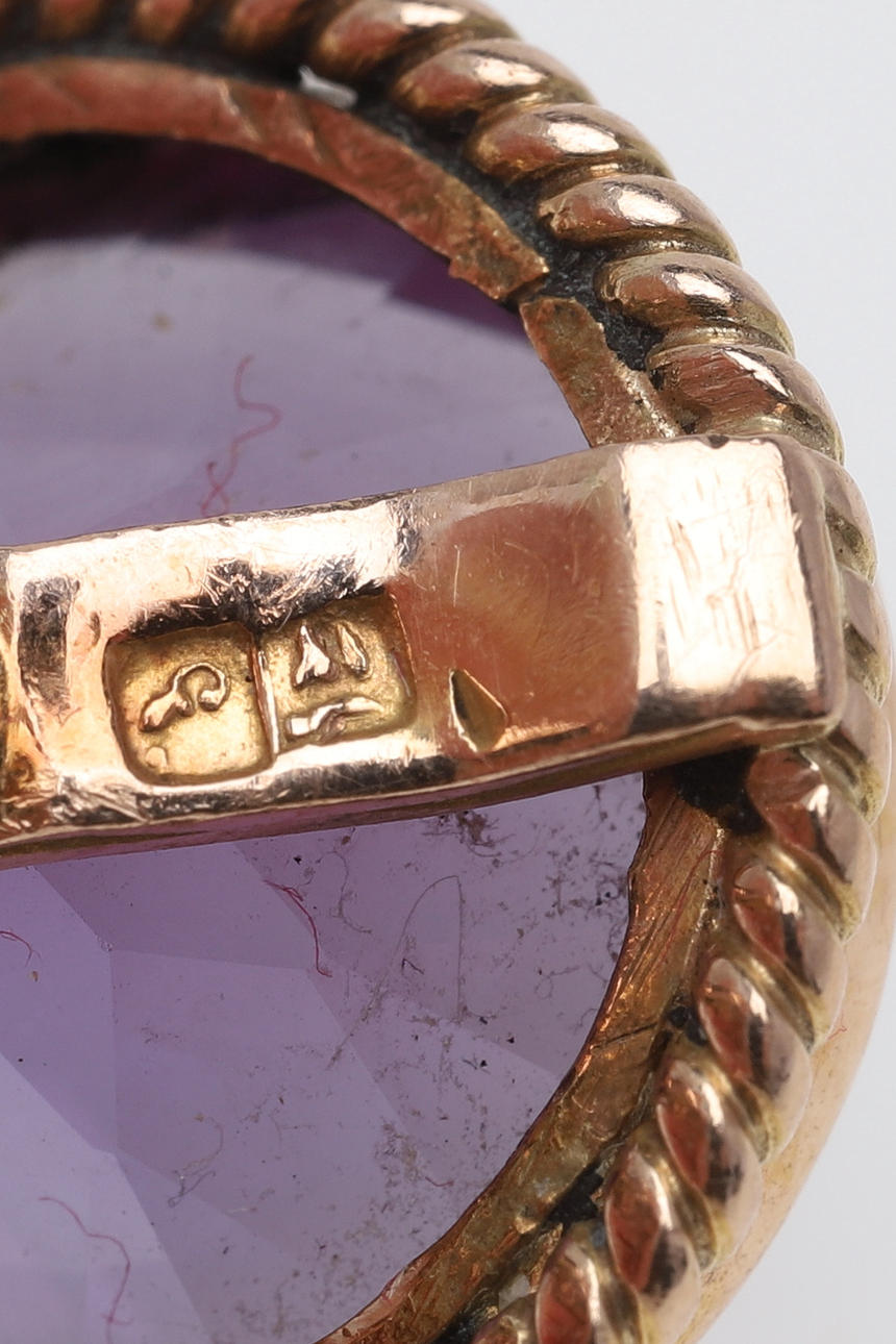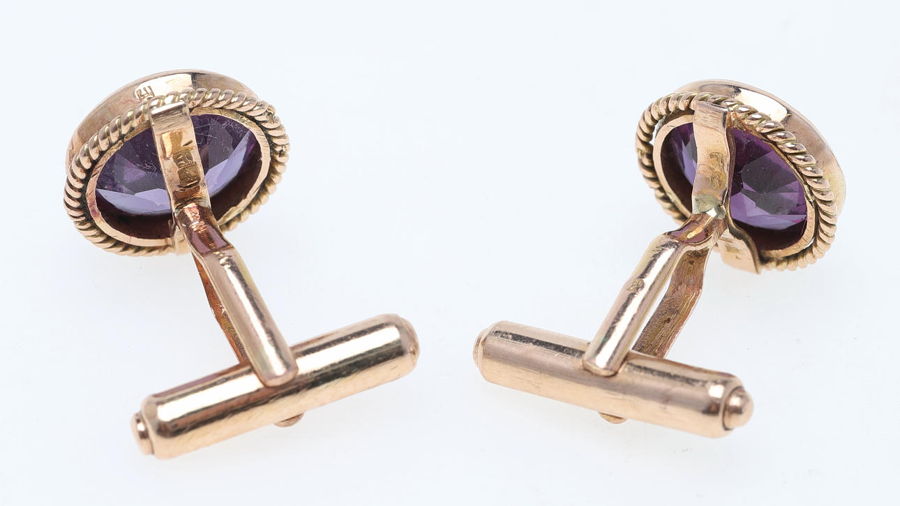 Arabiska guldstämplar Runda blandslipade ametister, något olika nyanser Diameter ca 16,7 mm Vikt ca 15,5 gram.