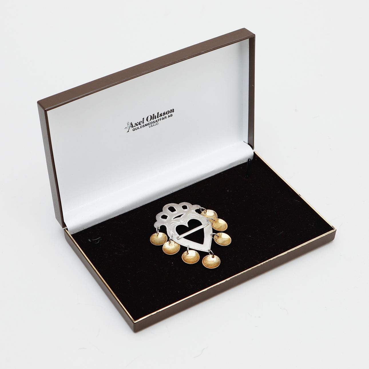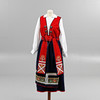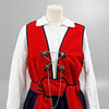 Ylle. Klänning med livstycke och bucklor. Blus, förkläde och skärp med brodyr. Mått klänning: byst ca 100, midja ca 79, totallängd ca 130 cm. Mått blus: byst ca 100, axelbredd, ca 45, inre ärmlängd, ca 54 cm. Silversmycken: kedja, längd ca 100 cm. Manschettknappar, 2 st, nål samt brosch.