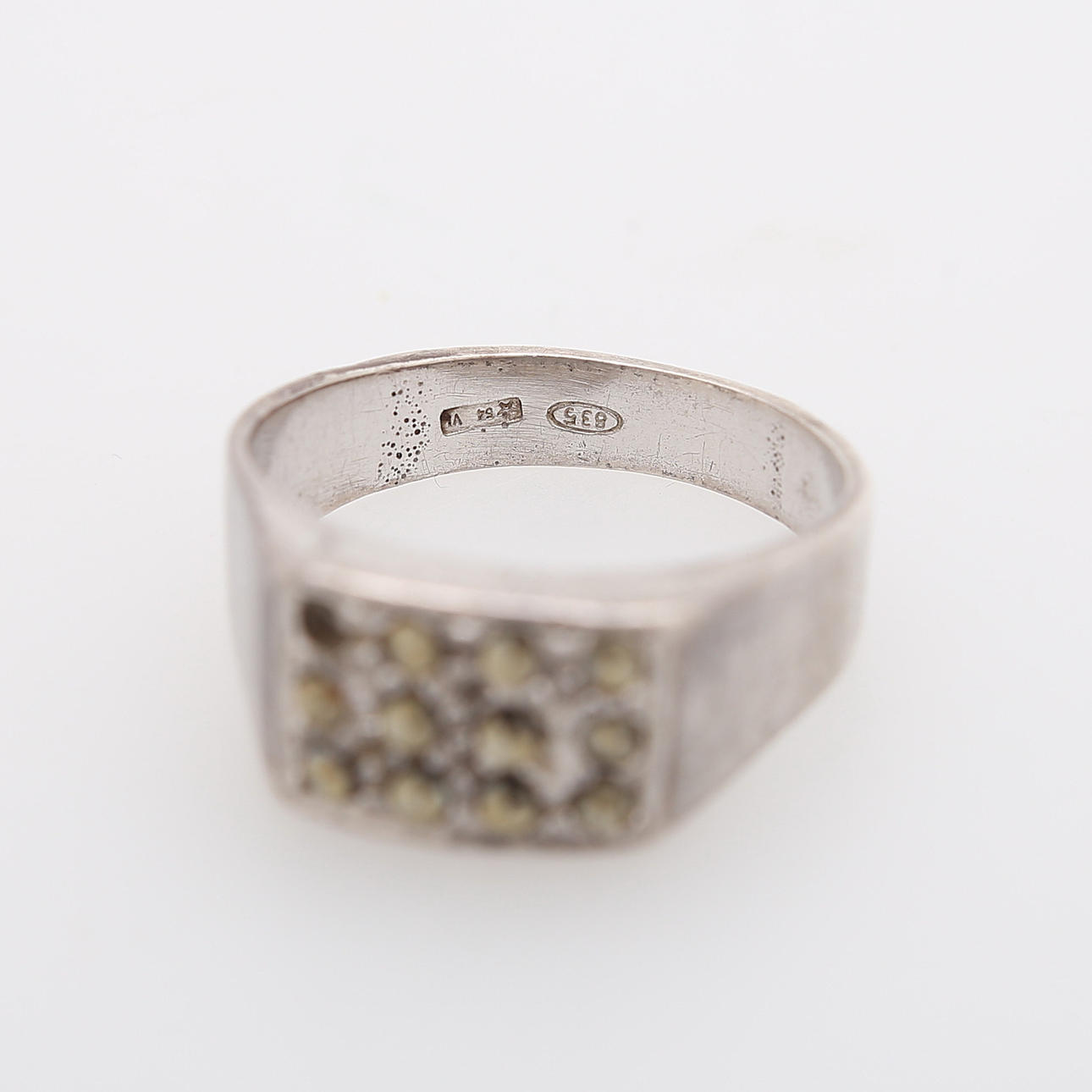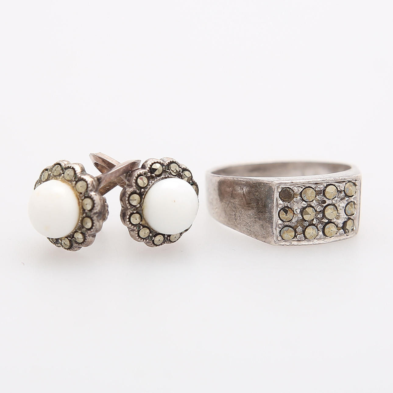 Brosch 4,5 x 3,5 cm. 1 par örhängen, ring, fotogömma och hänge.