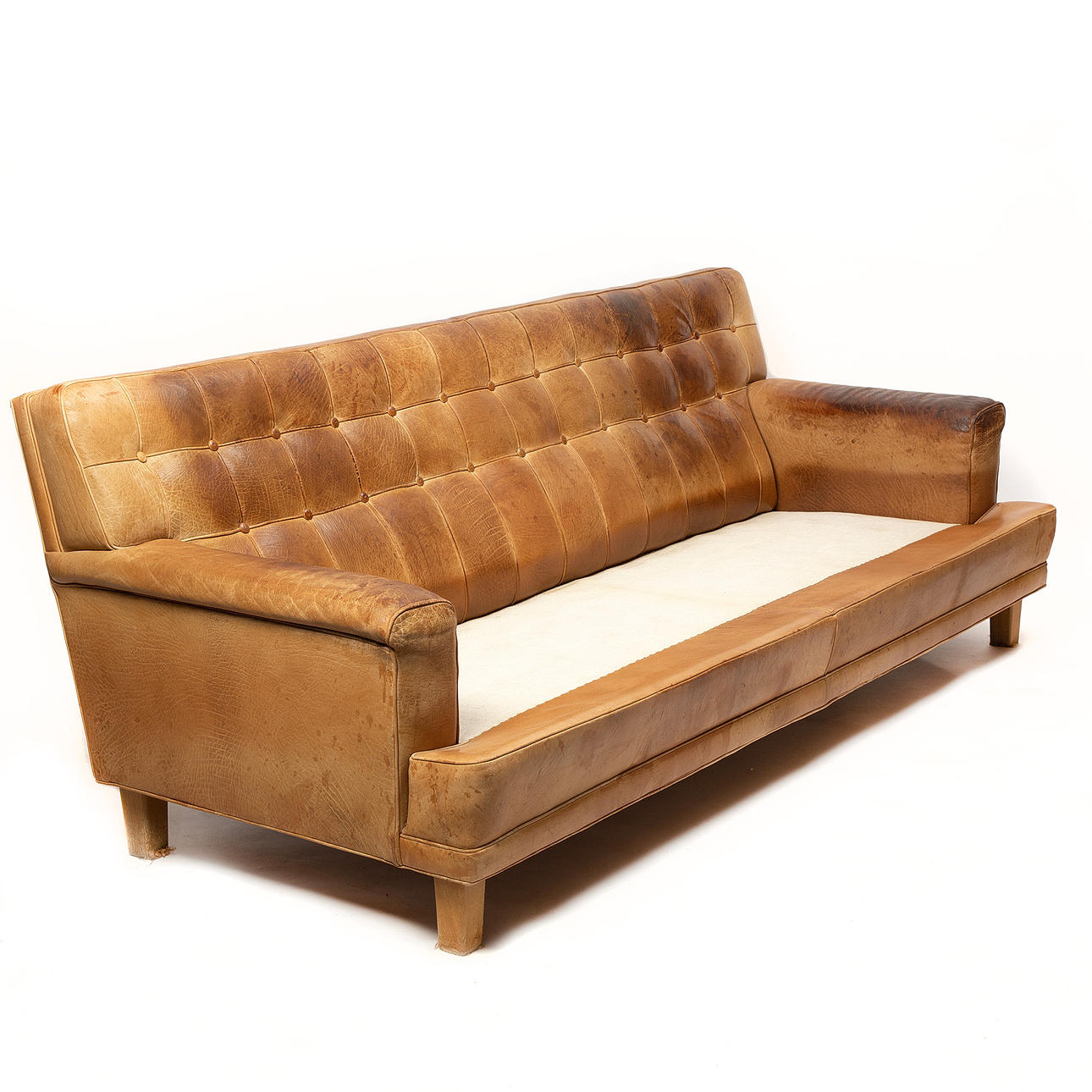 Dubbelfjädrande sits. Resårer i rygg. Sittdynor Dacron fiberfil.. Klädd i läder.