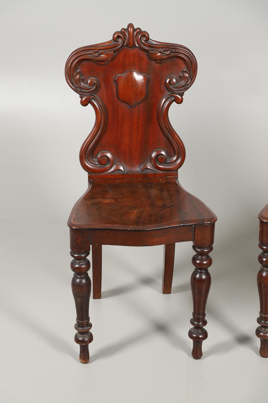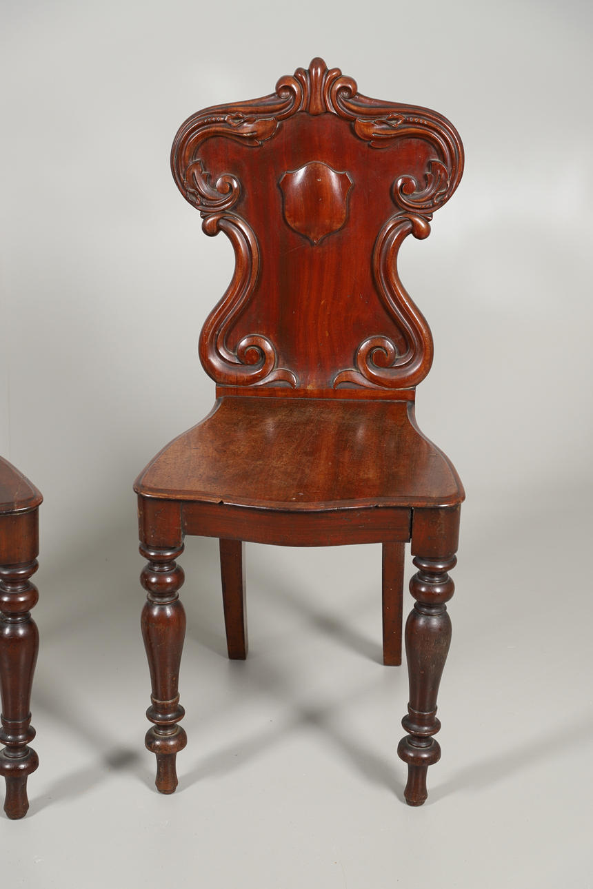 Med snidad rullning och sköld design, på vända ben. Sitthöjd 45cm, total höjd 91cm. (2).