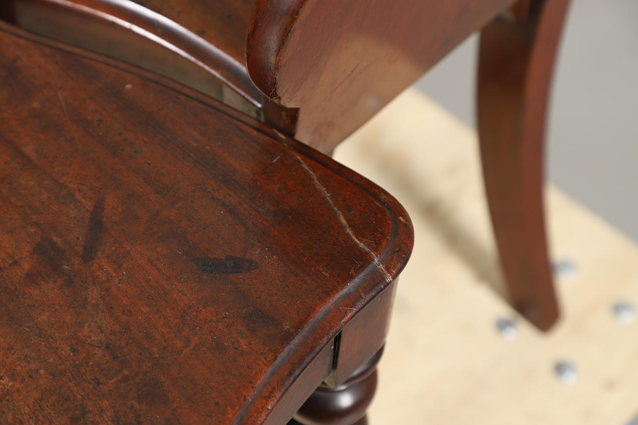 Allmänt slitage på grund av ålder och användning med vissa märken, repor och bucklor. En stol verkar ha lite reparation.