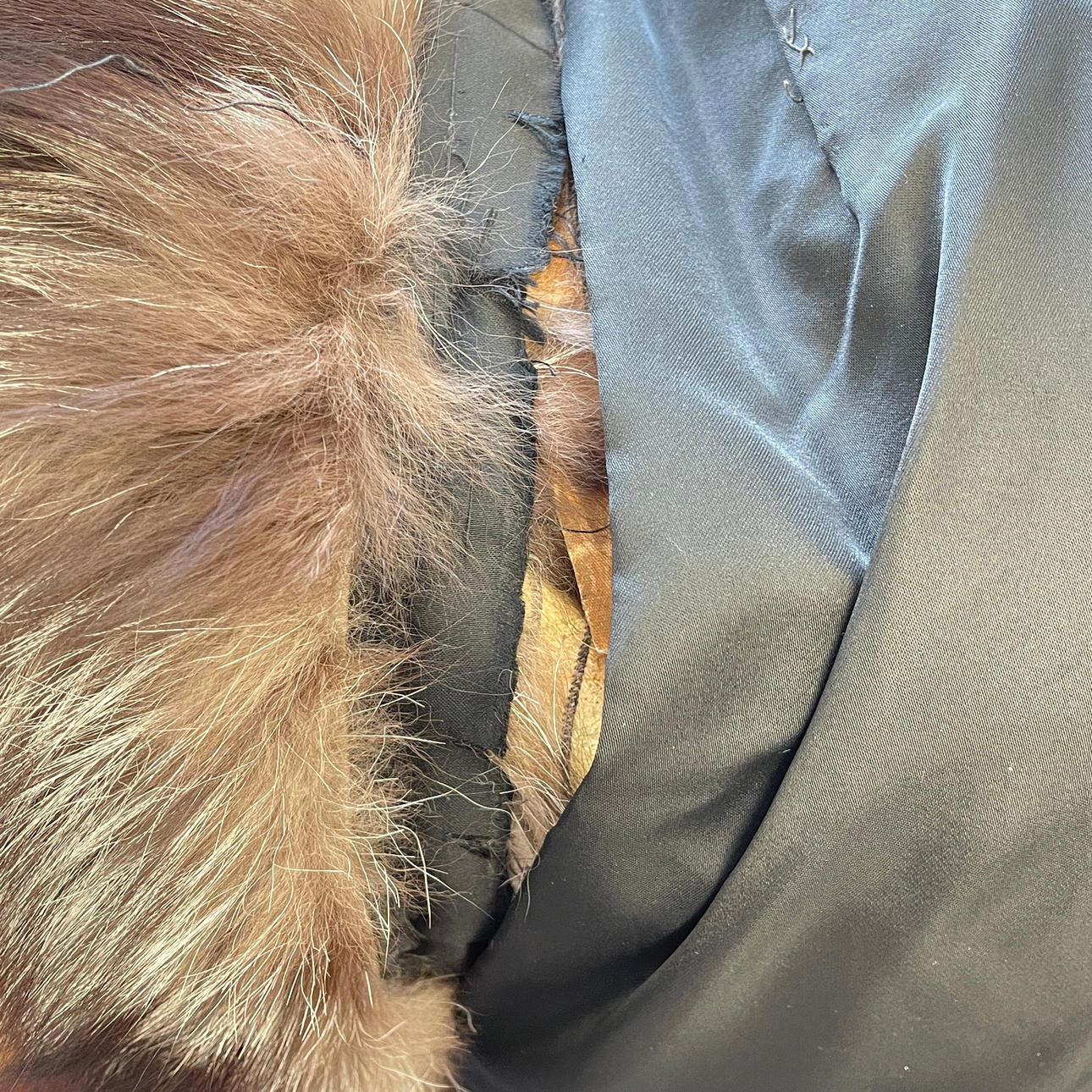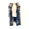 Kvinnors vintage vargpäls med två broderade applikationer på fodret.