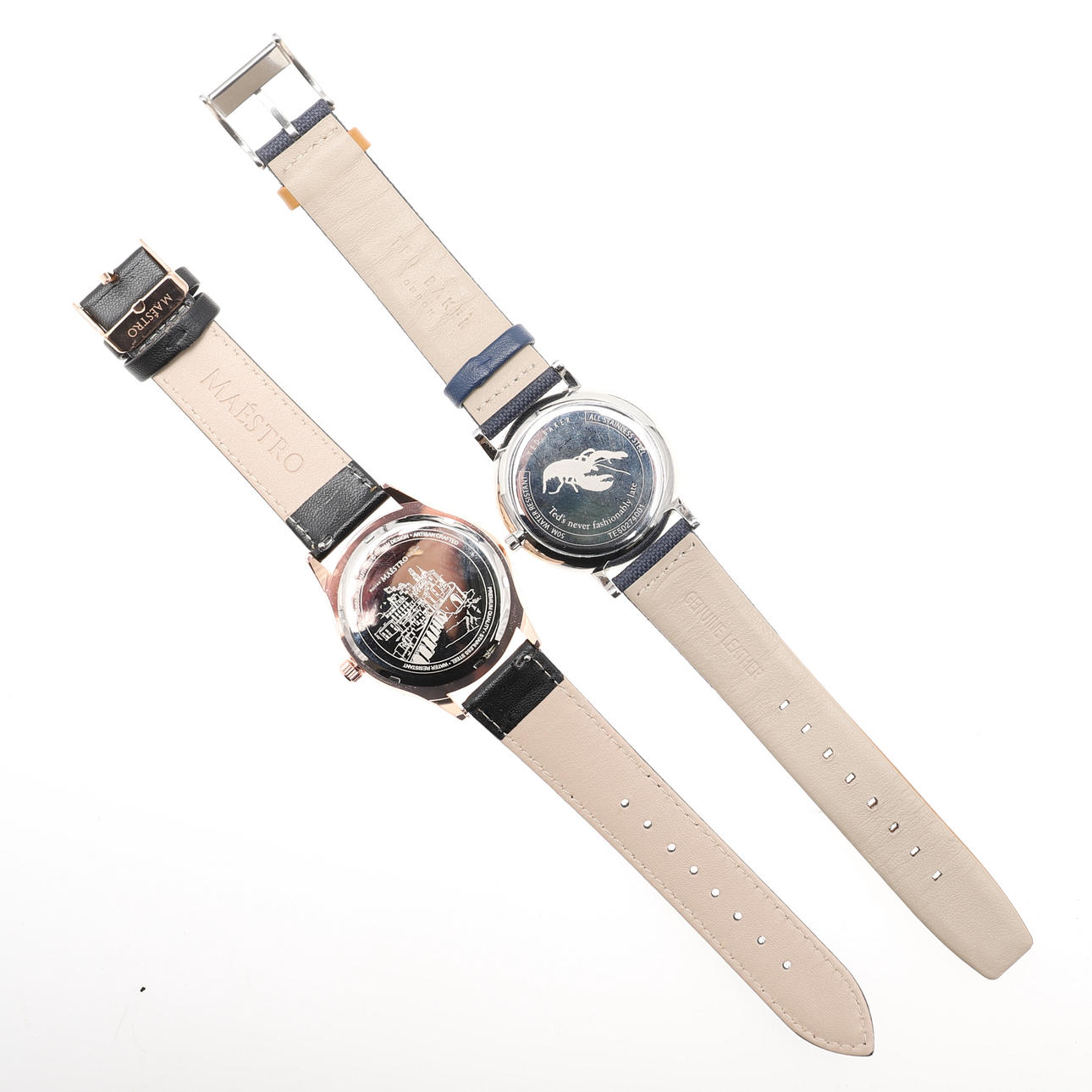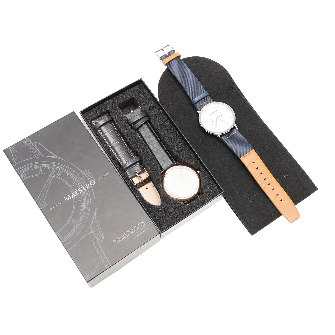 En Maestro kvarts 35mm urtavla klocka på svart läderrem, med en extra grå präglad läderrem, i rutan.