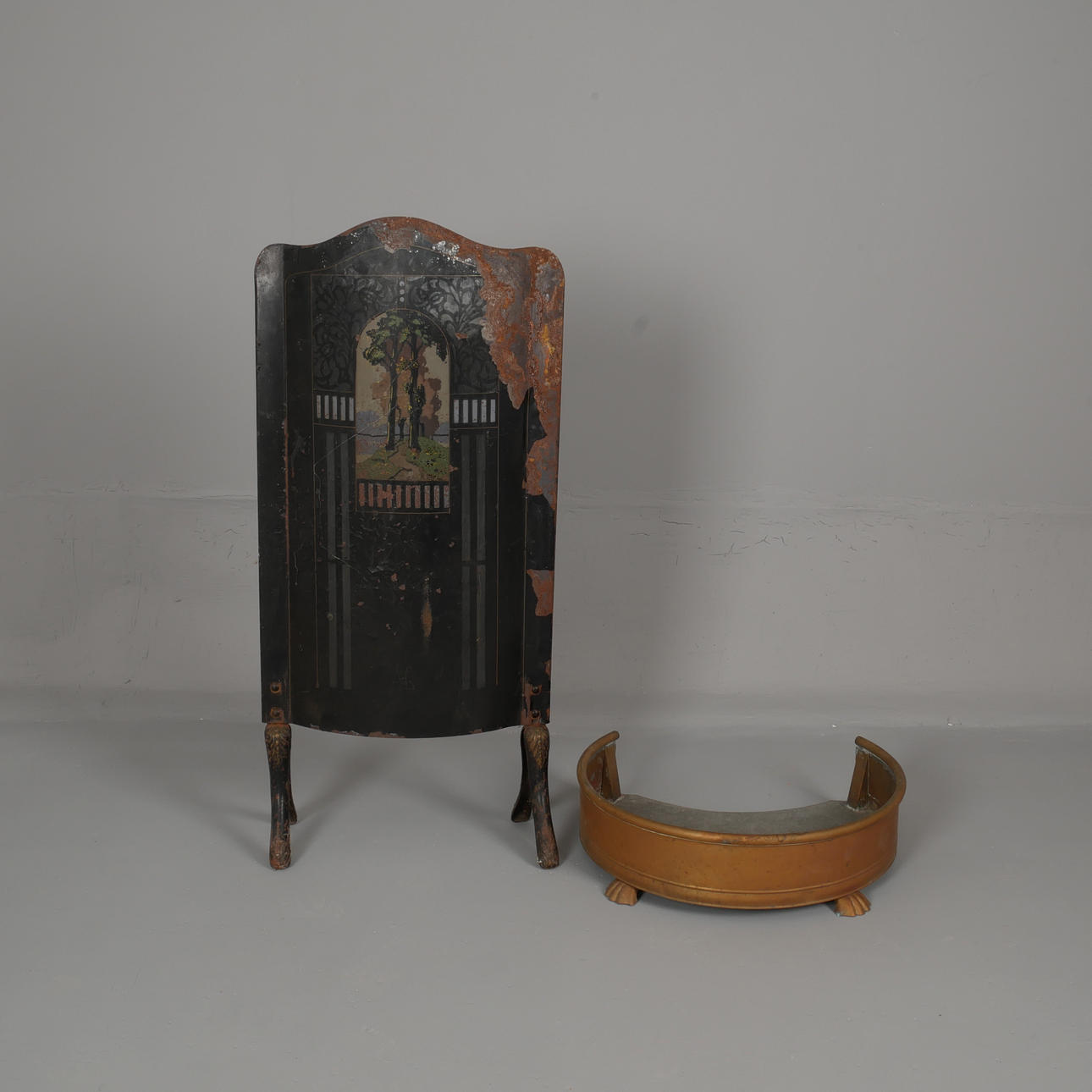 Eldskärm med motiv. 102x47 cm. Gnistskydd bredd 53 cm, djup 42 cm.