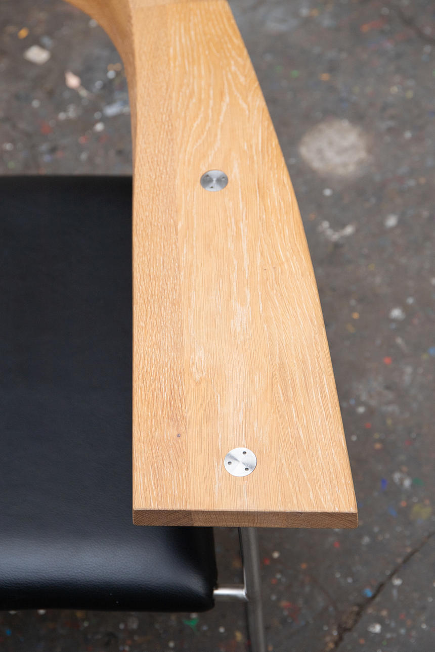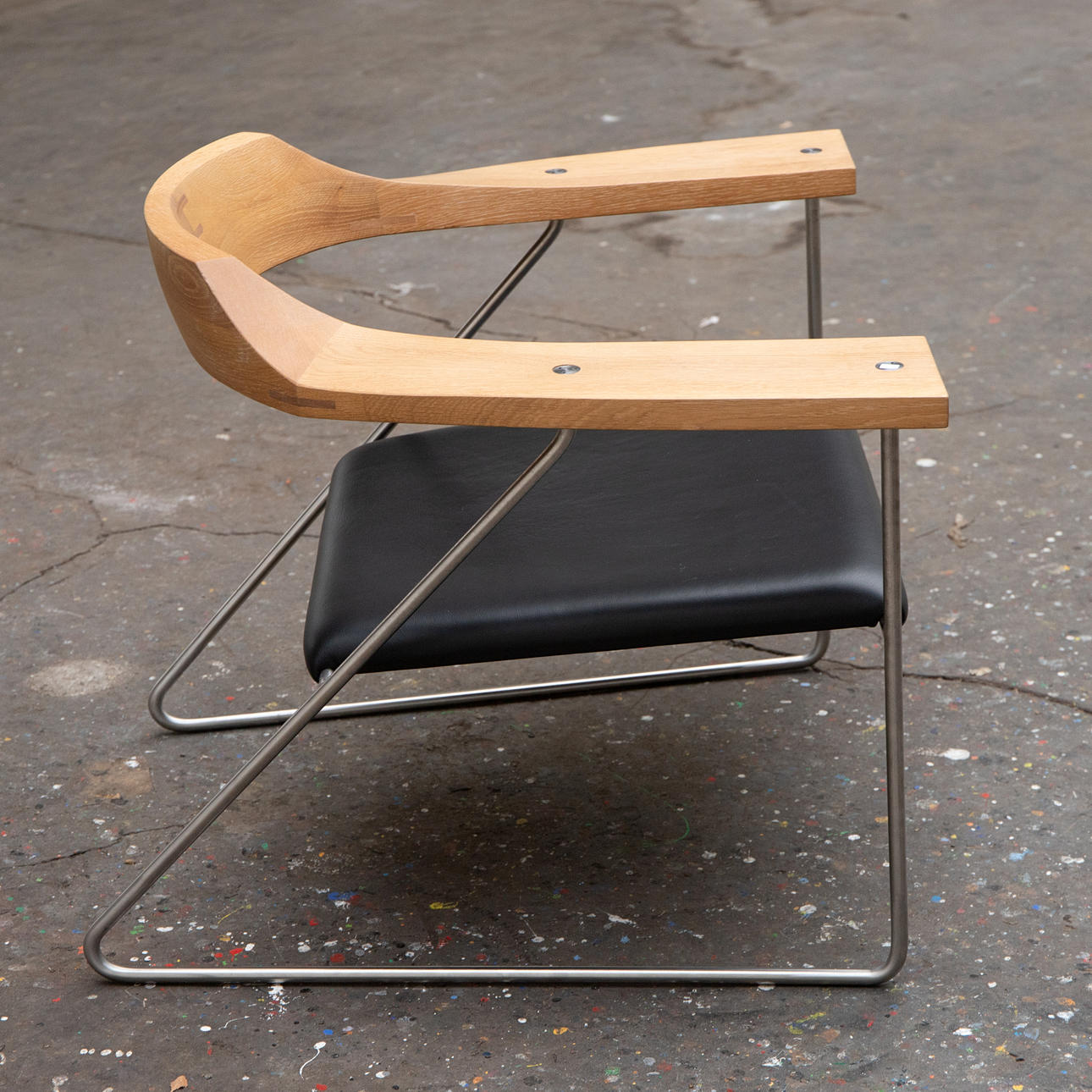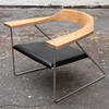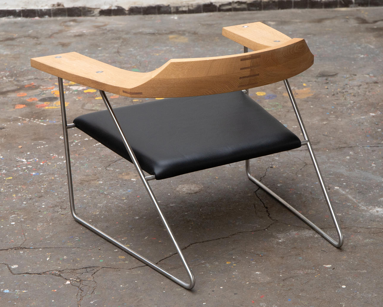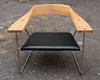 Klassisk lounge stol trä/stålrör. Konstruktion med ram i rostfritt stål, rygg/armstöd i trä, svart lädersits. H. 70, B. 93, d. 80 cm.