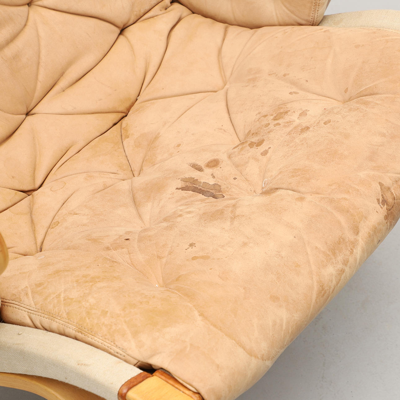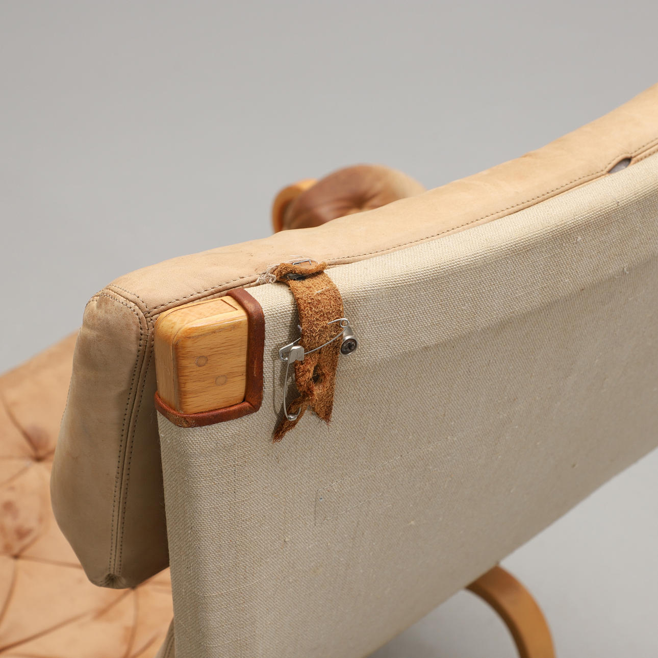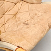 Böjträstomme i bok. Stoppad dyna och nackkudde klädd i ljusbrunt läder. Undersits i beige canvas. Bredd c:a 90, sitthöjd c:a 37 cm. Total höjd 97 cm.