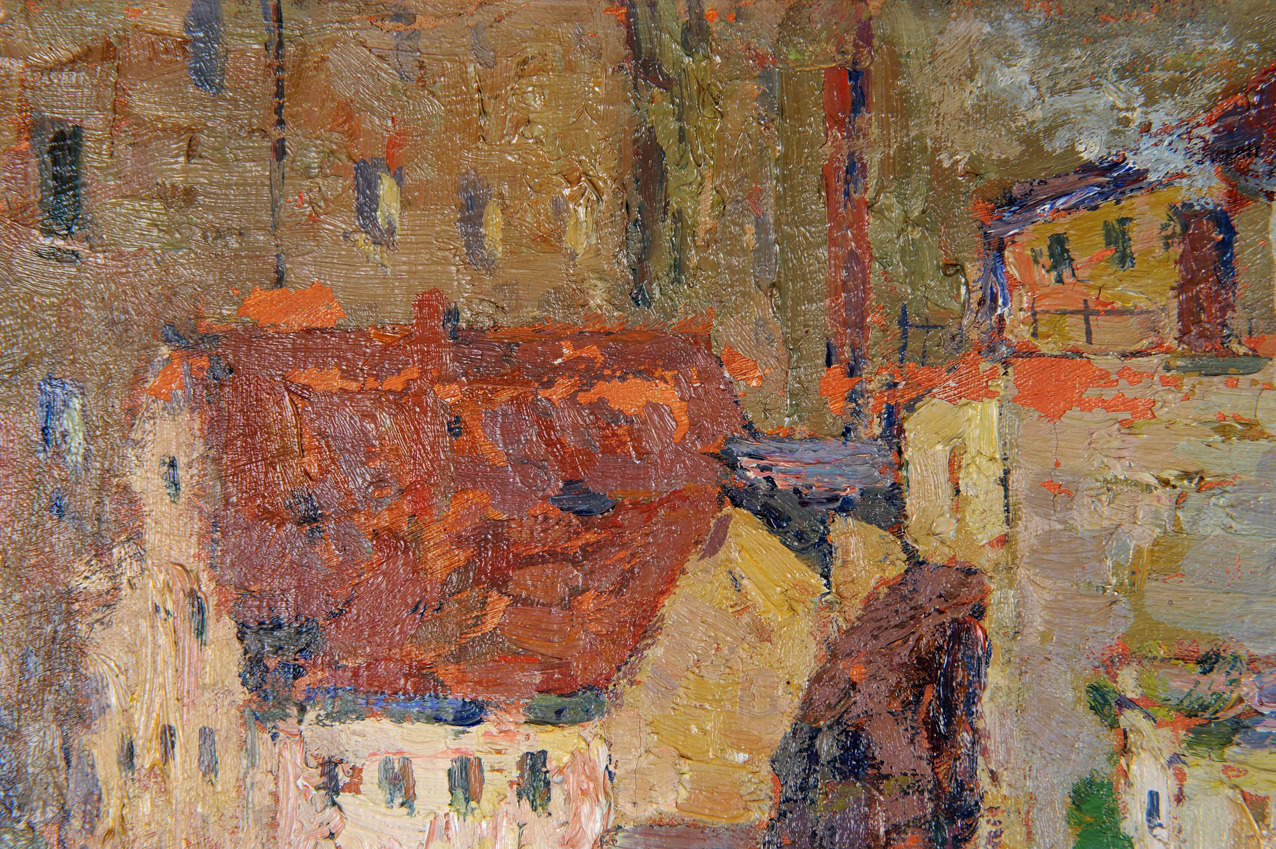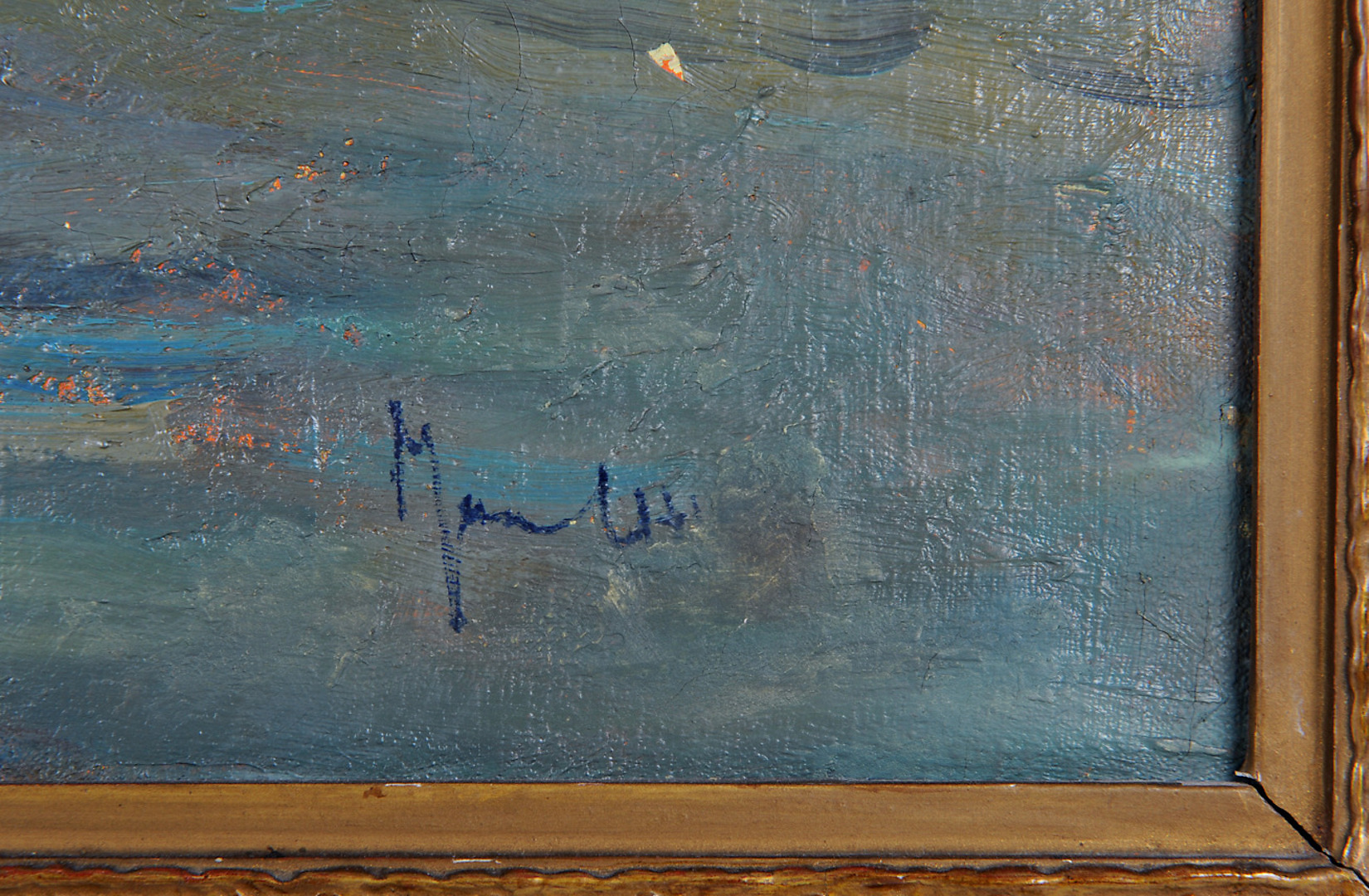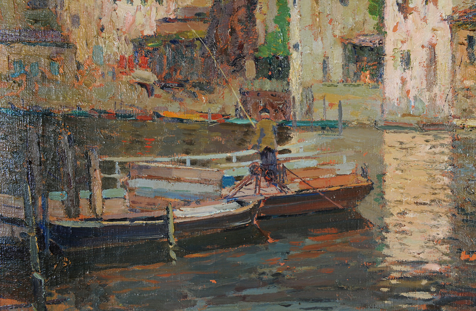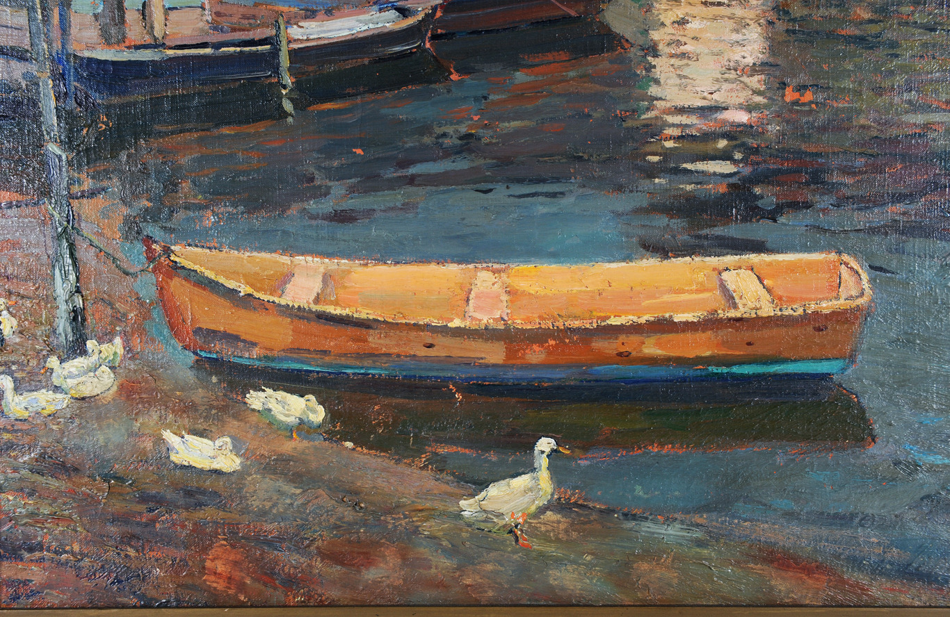 271415. BERLINER MALSCHULE. TILLSKRIVEN. Impression fiskare på land med gäss & båt. Oljemålning omkring 1910, magnifik ram.