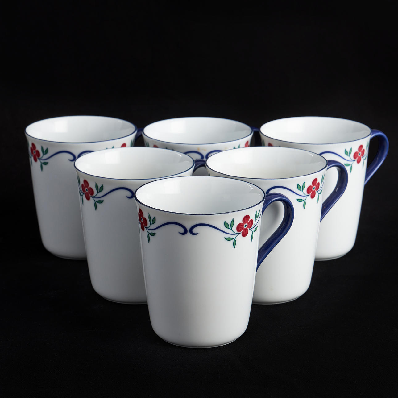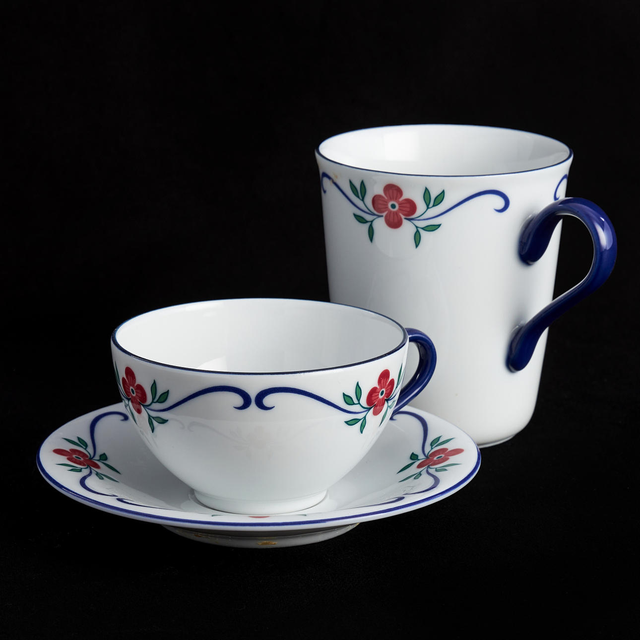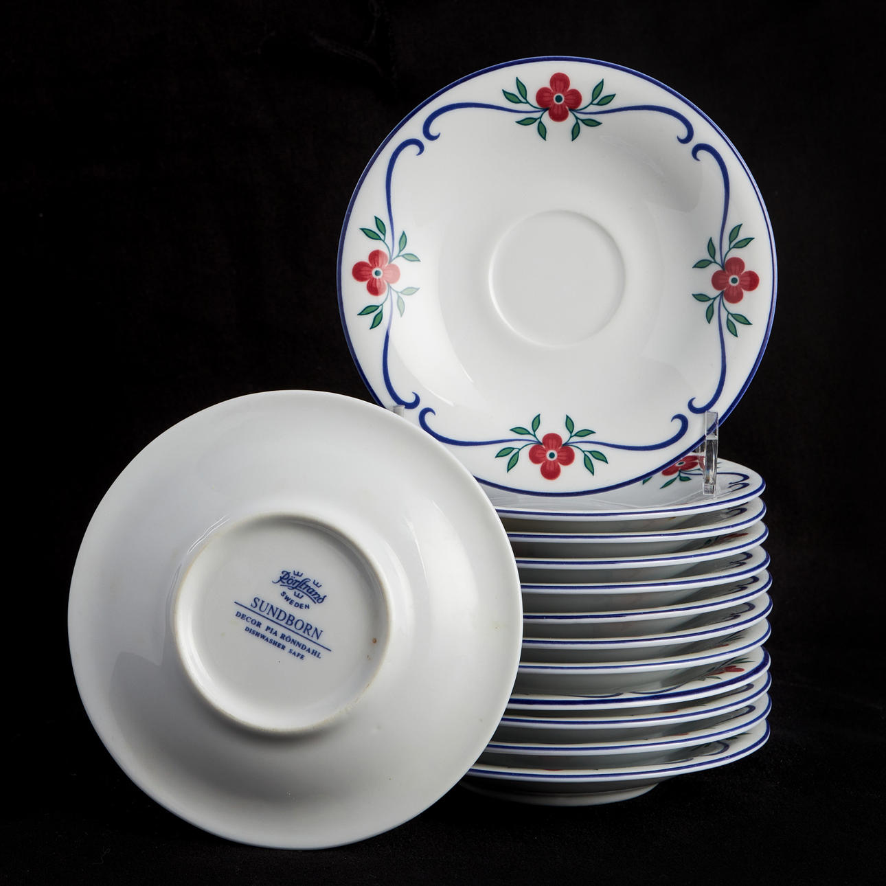 Bestående av 12 mattallrikar 23,5cm, 12 assietter 18cm, 12 dessertskålar 16cm, 12 djupa tallrikar 20,5cm, terrin, diameter 21cm, 12 kaffekoppar m fat 12cm, 6 temuggar, 2 uppläggningsfat, 2 uppläggningsskålar.