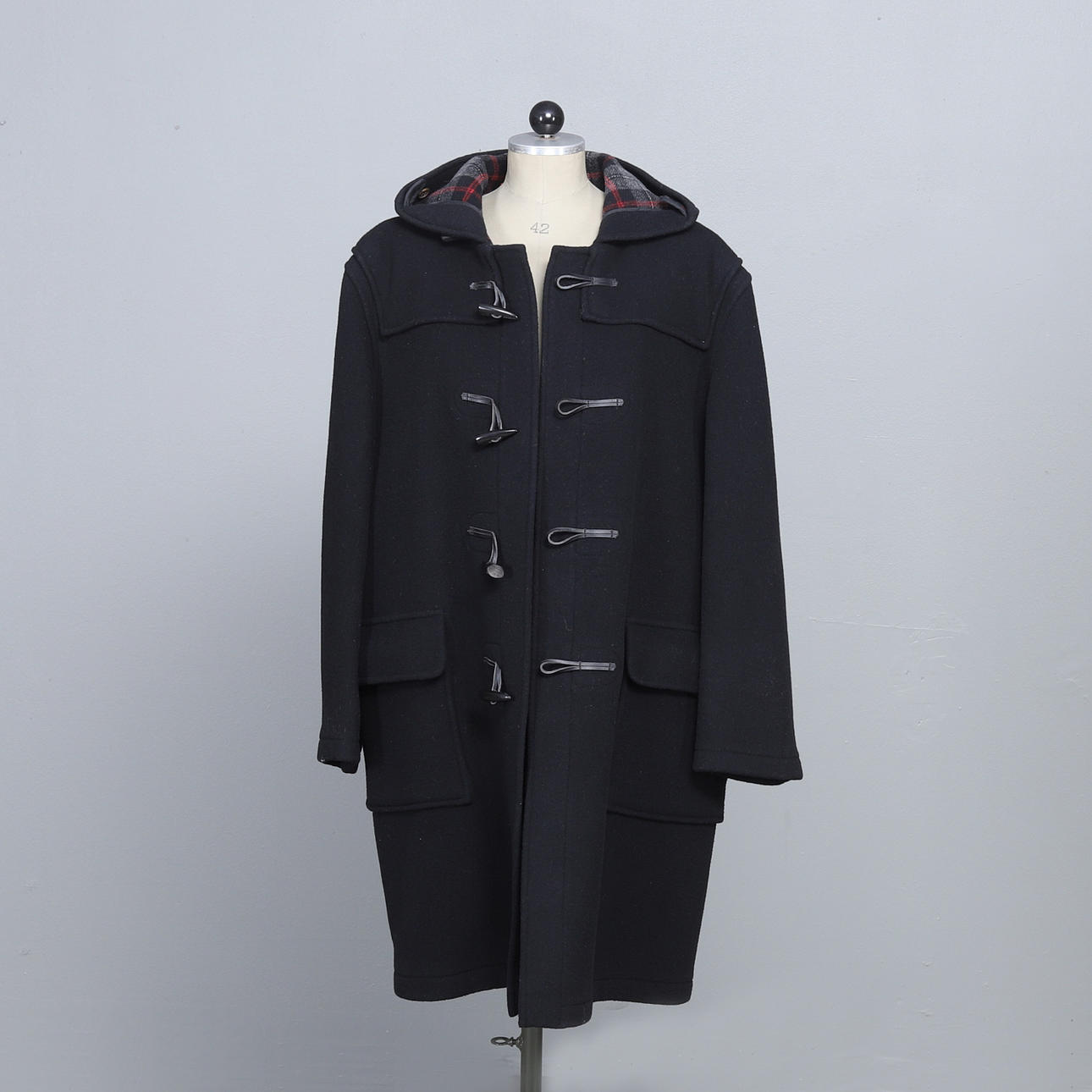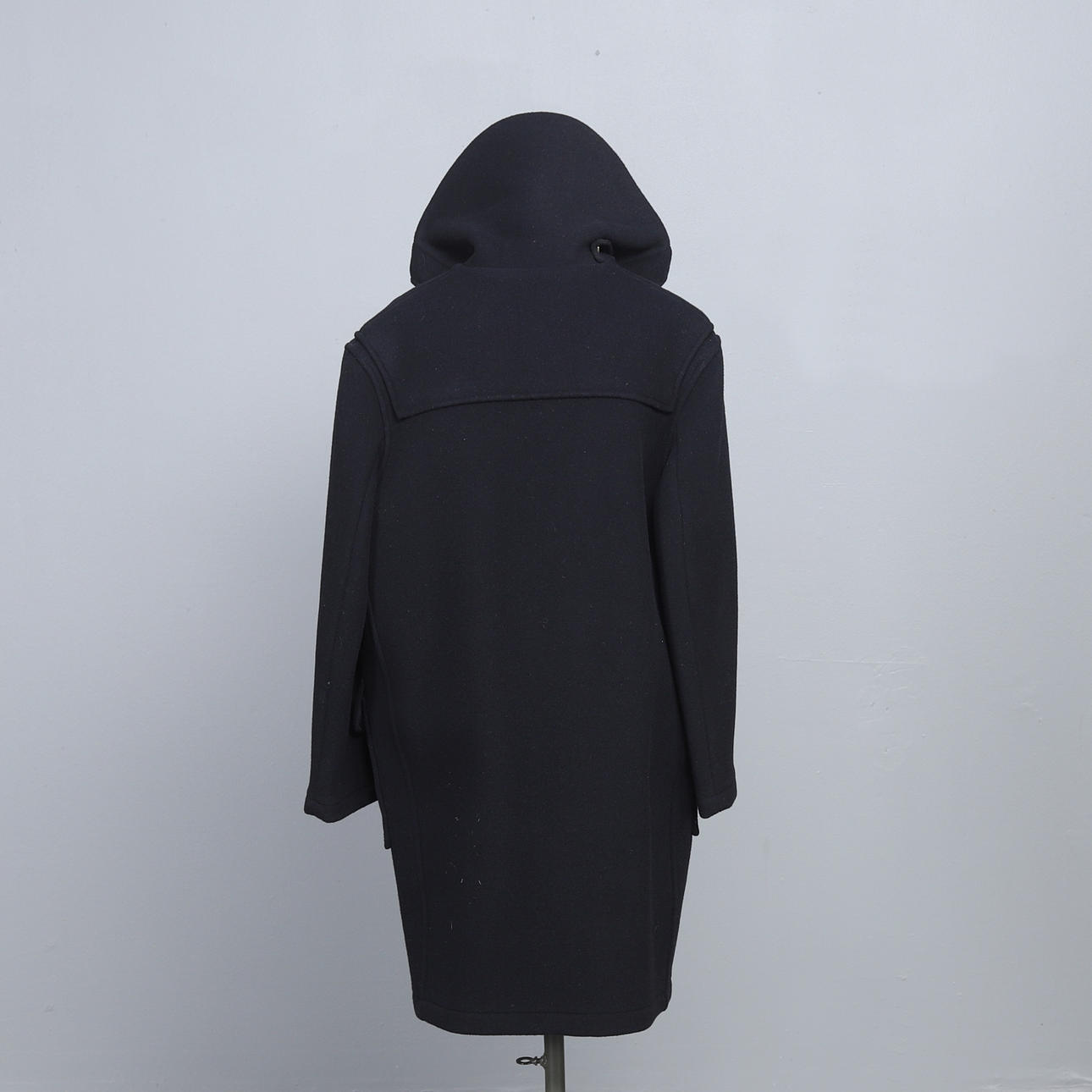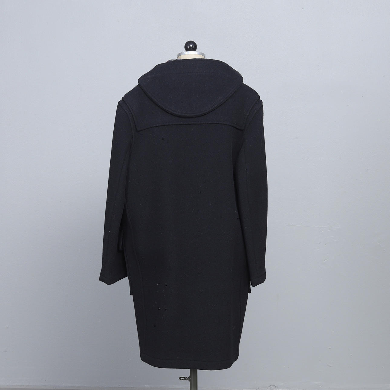 Duffel i svart med knappar av kohorn, storlek 56, etikettmärkt.