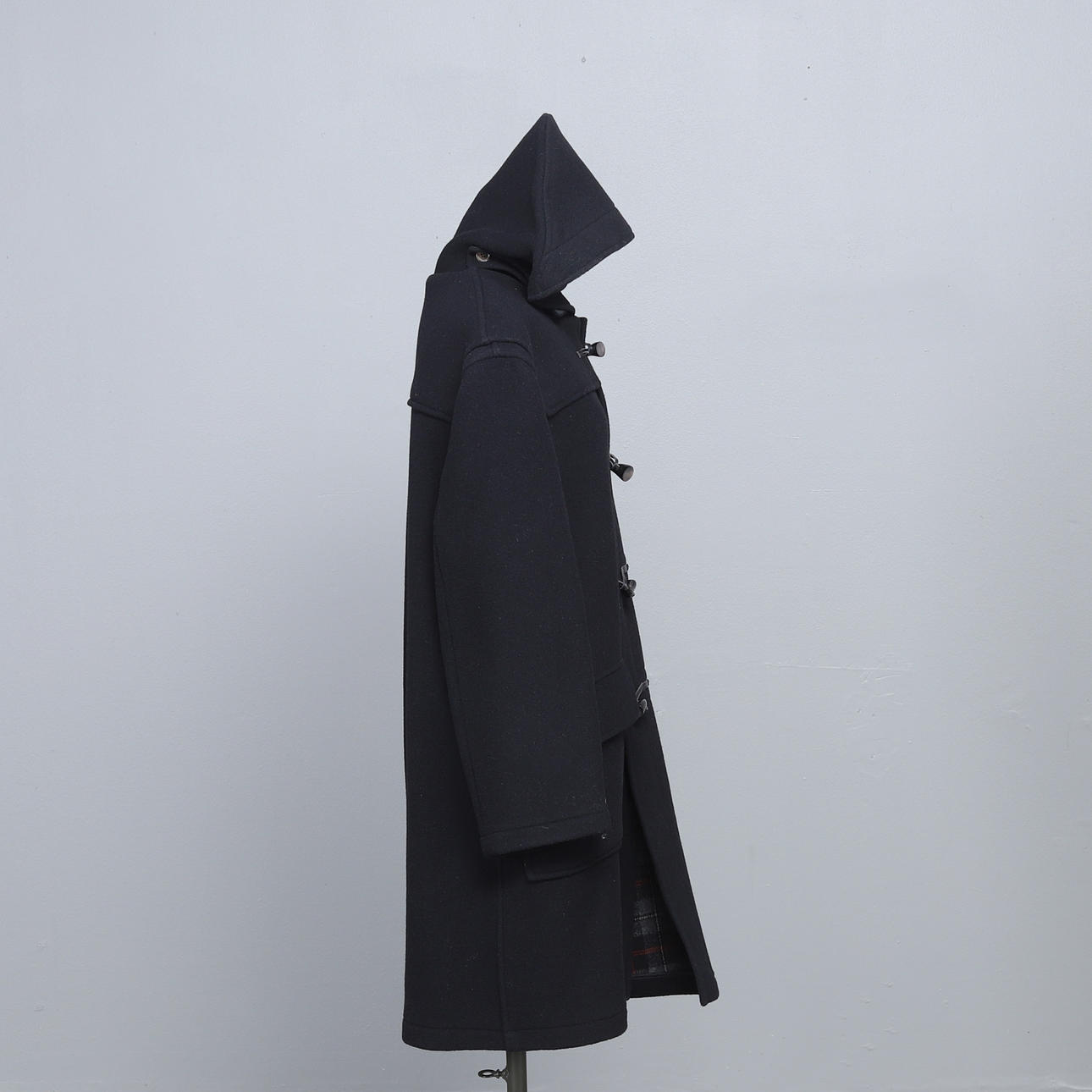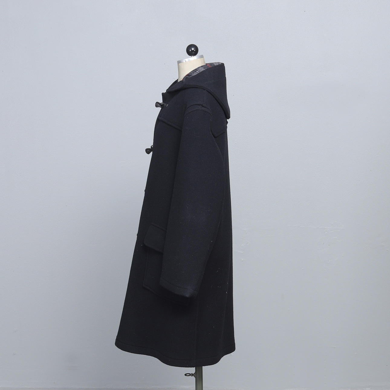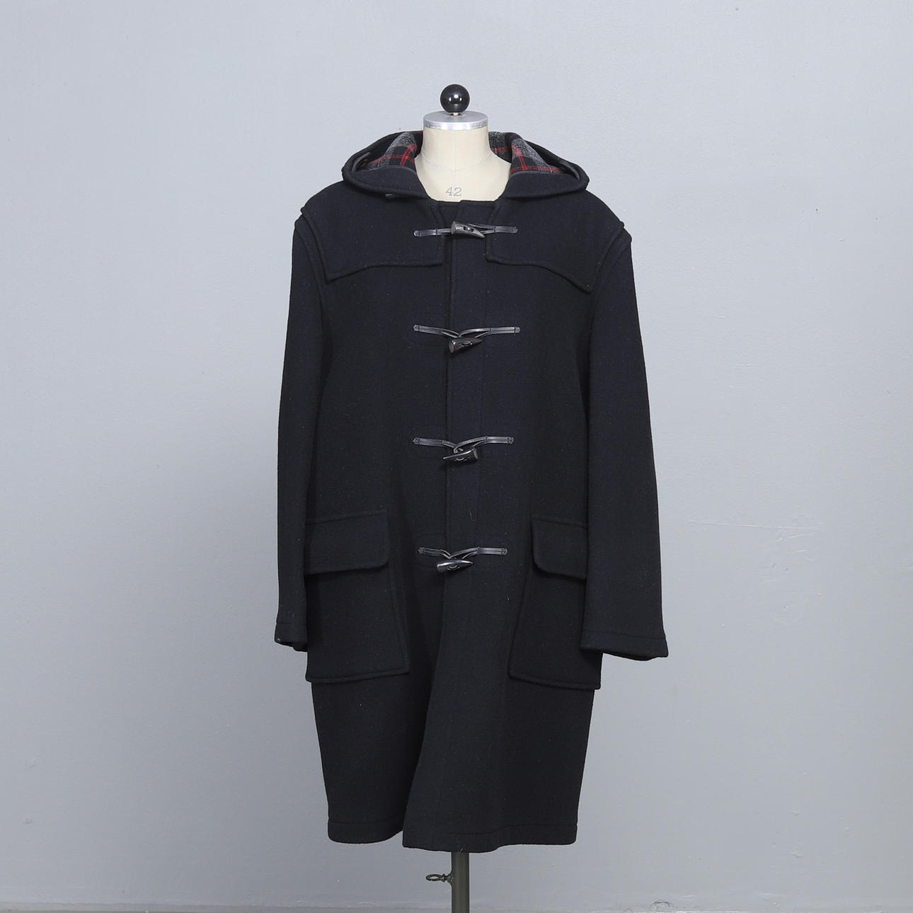 Duffel i svart med knappar av kohorn, storlek 56, etikettmärkt.